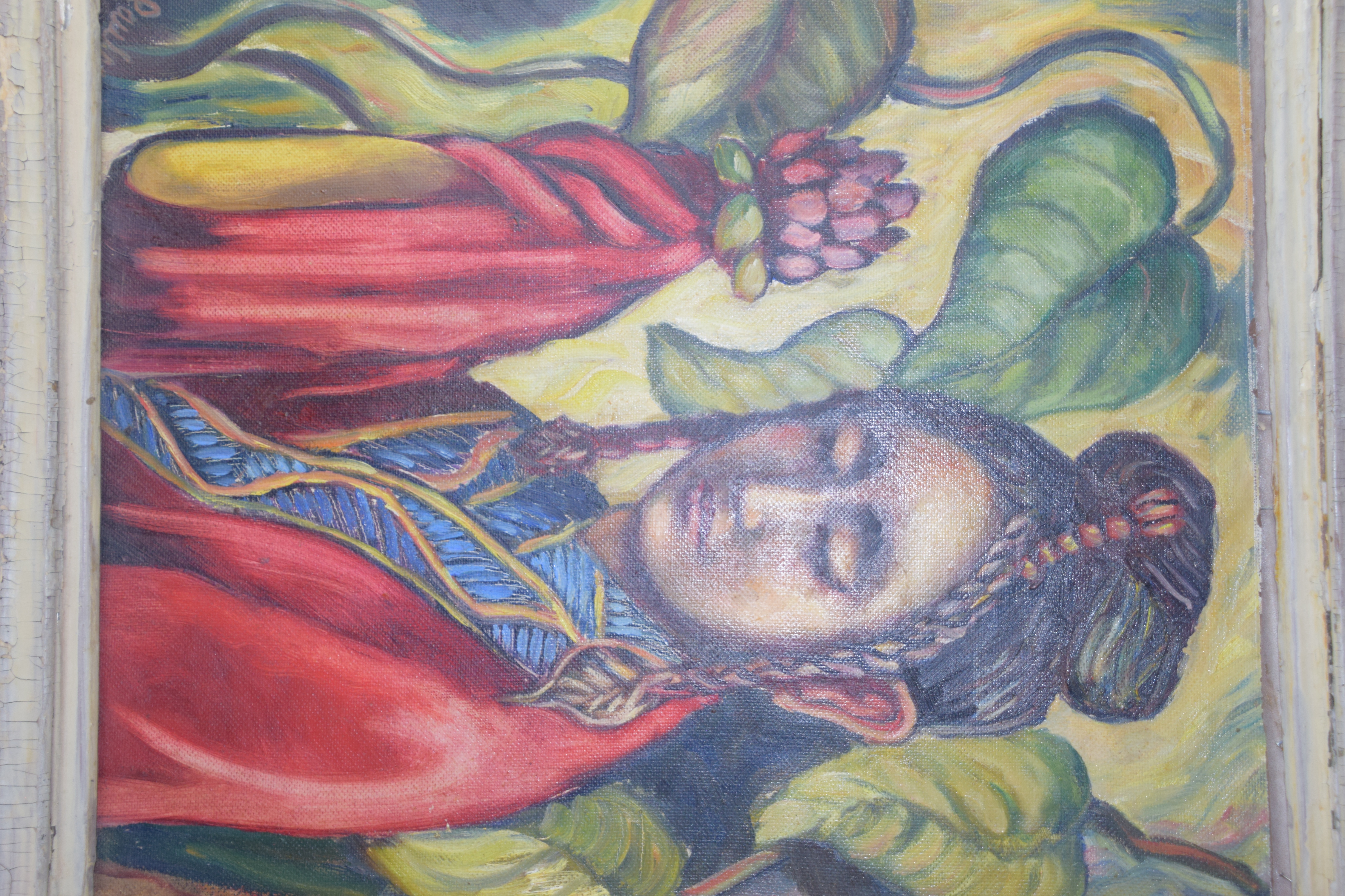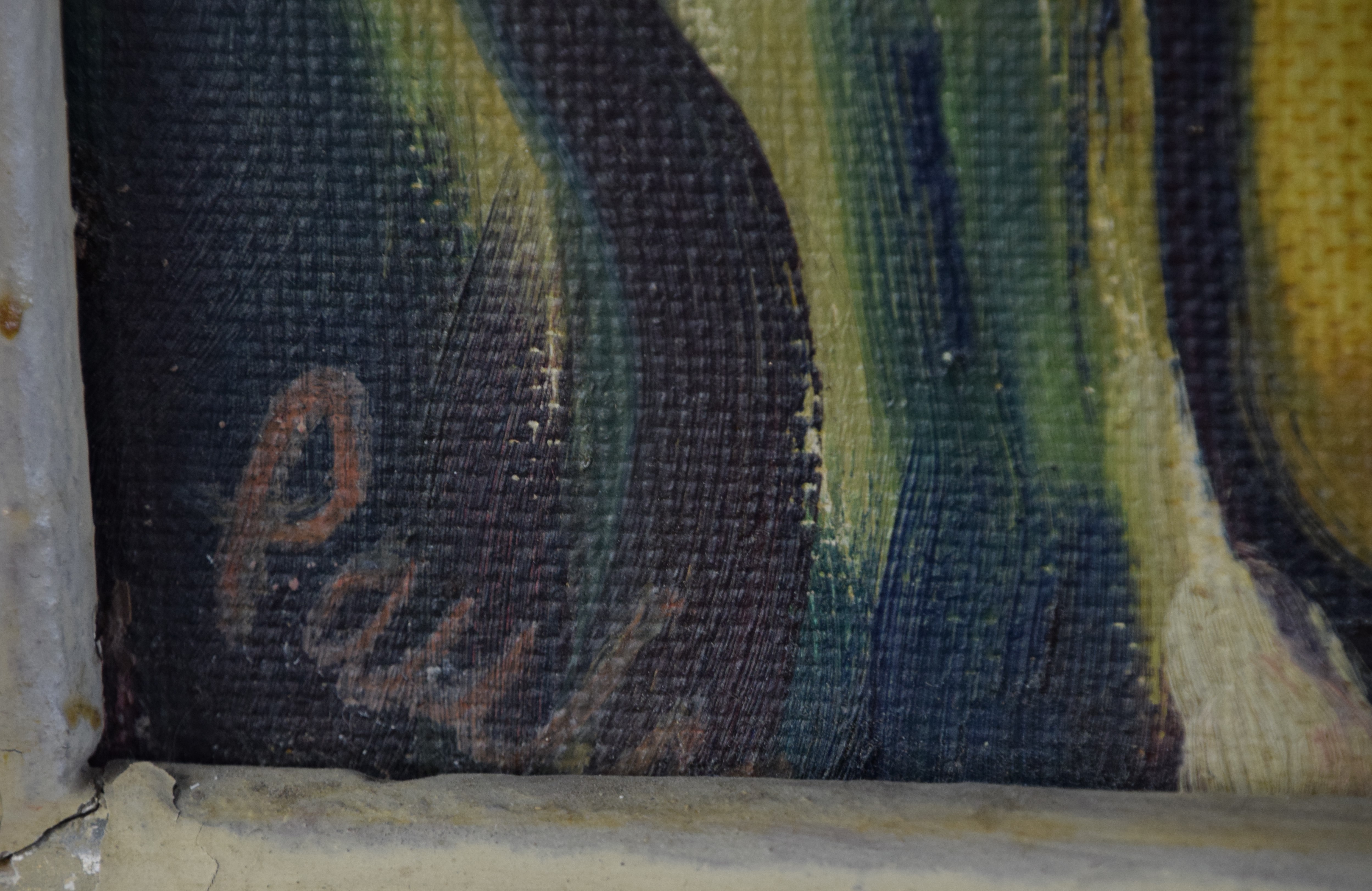 Painting in good condition, frame has multiple cracks and damage