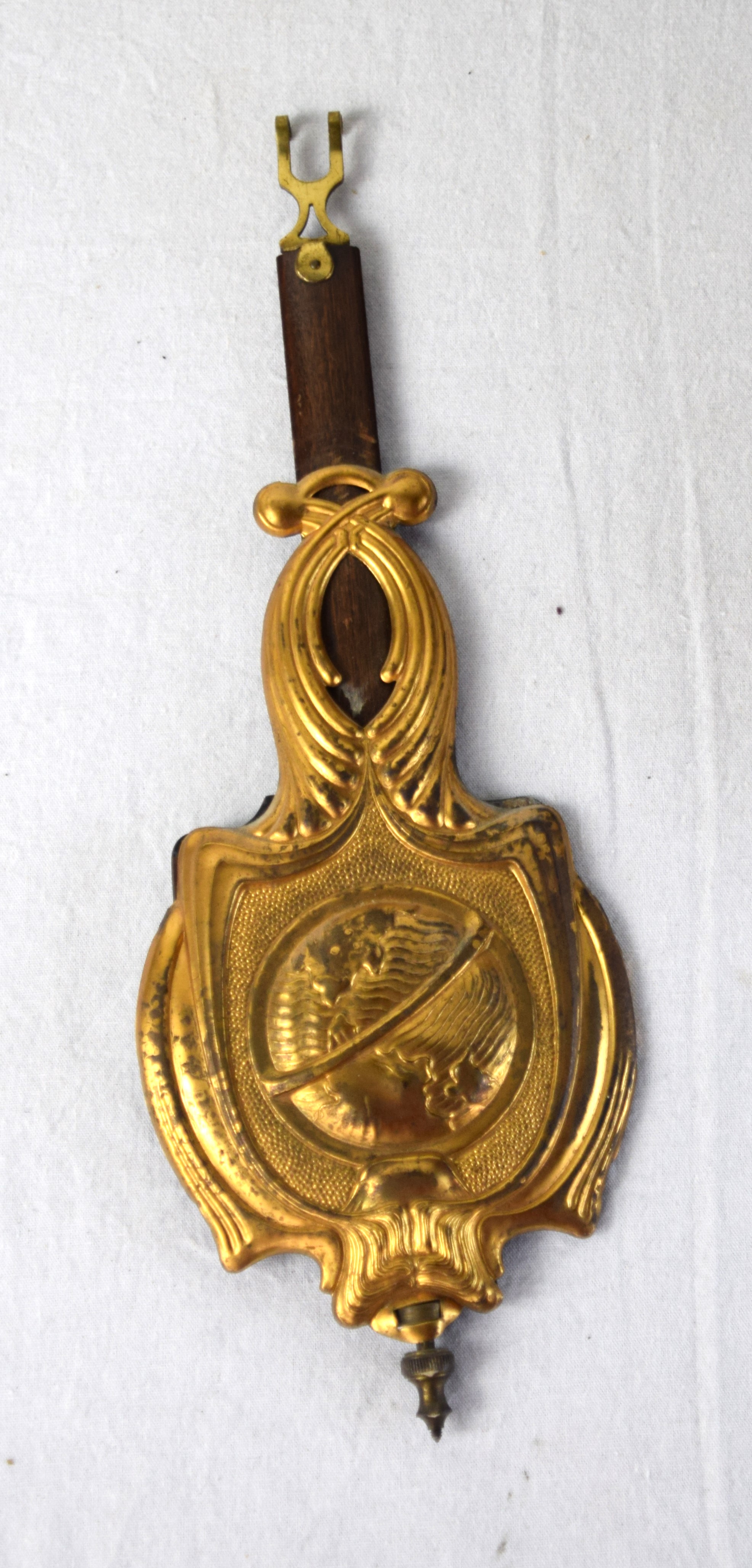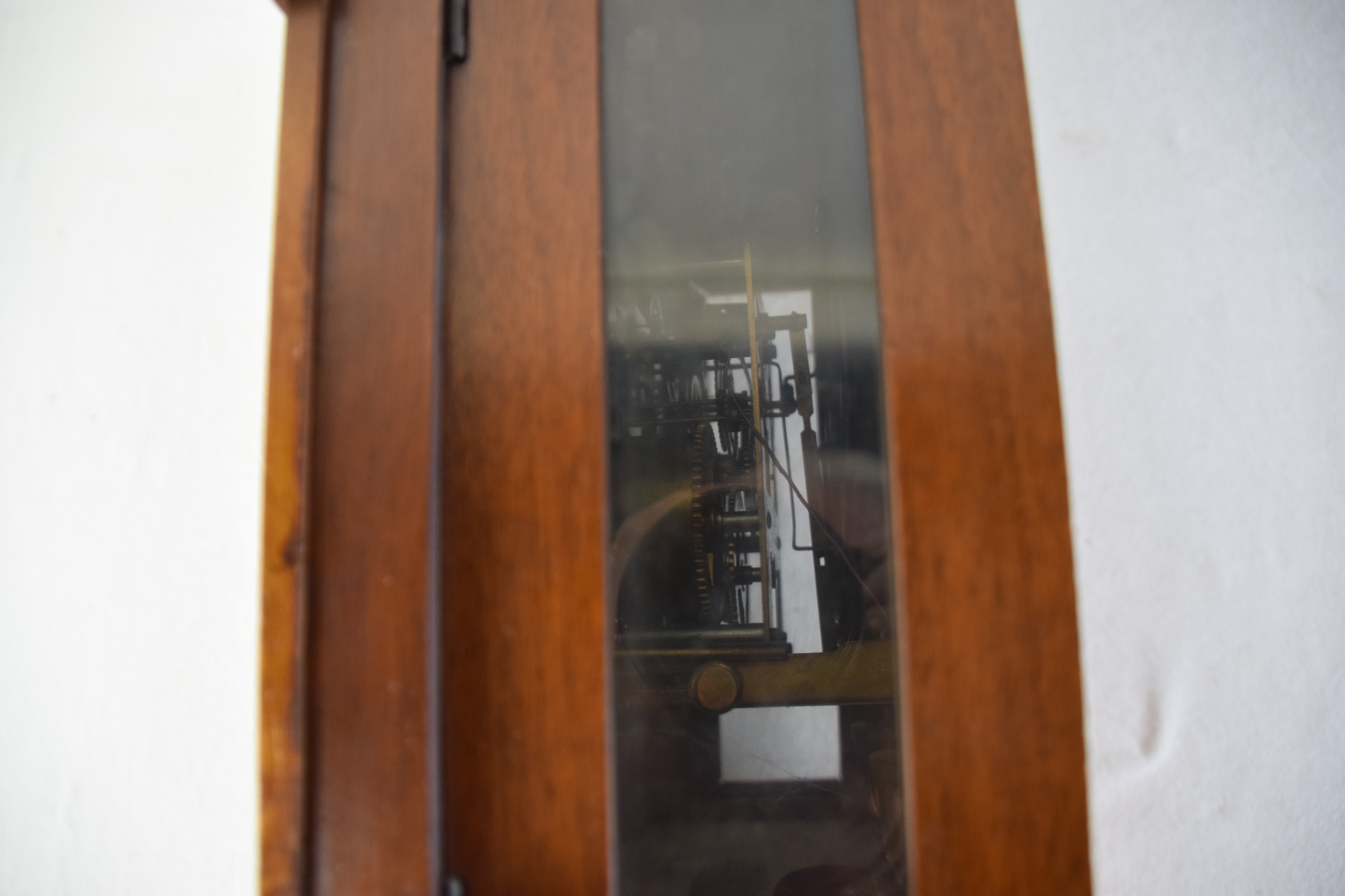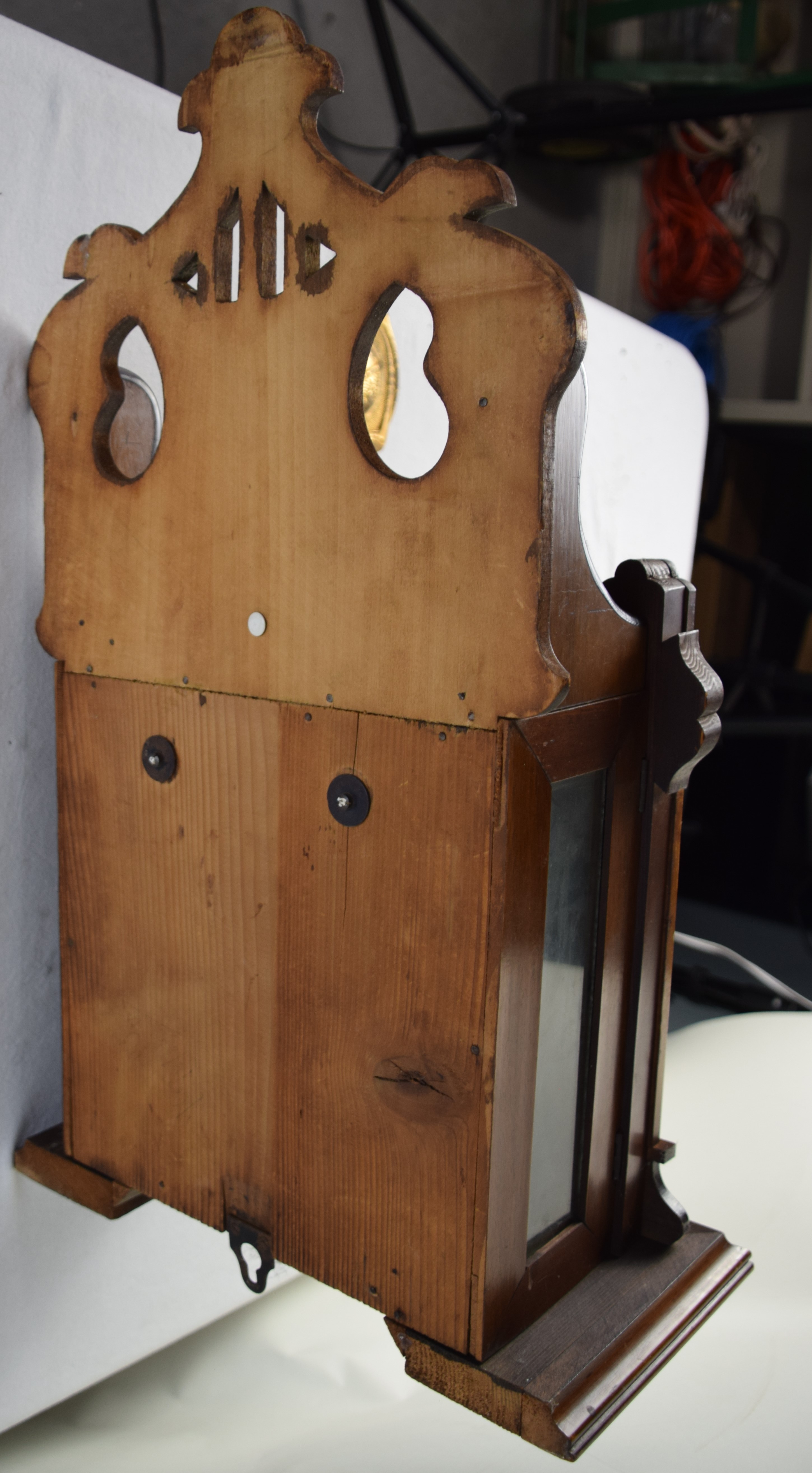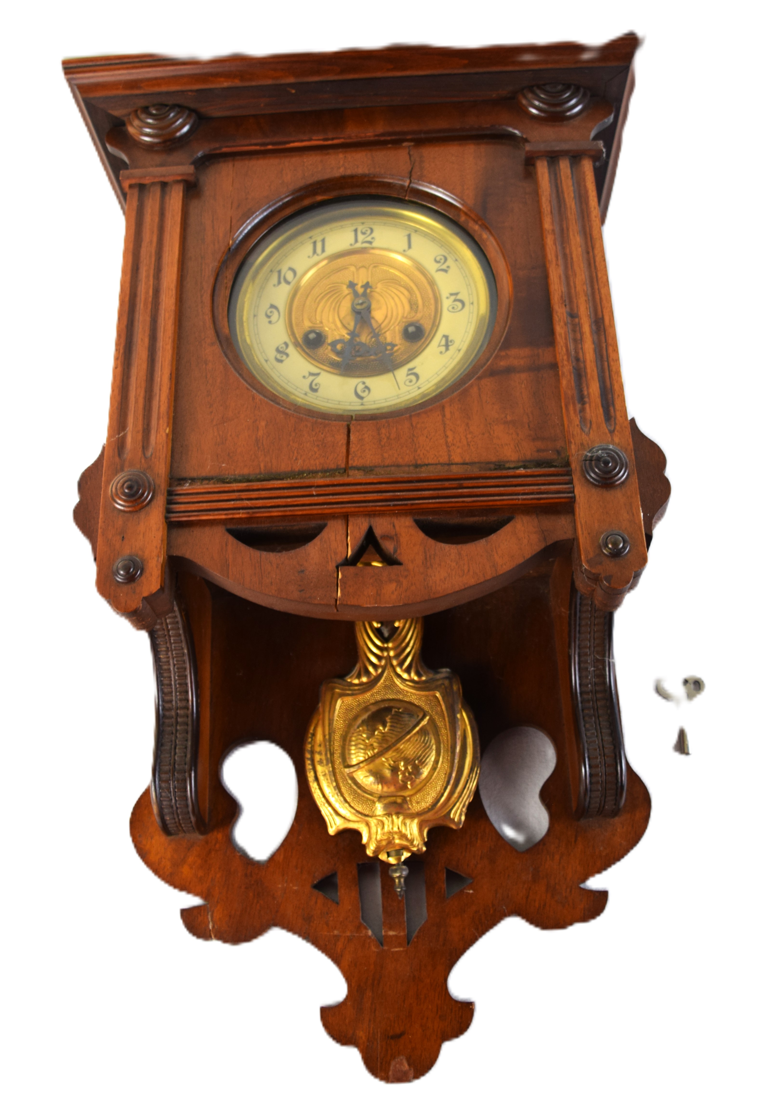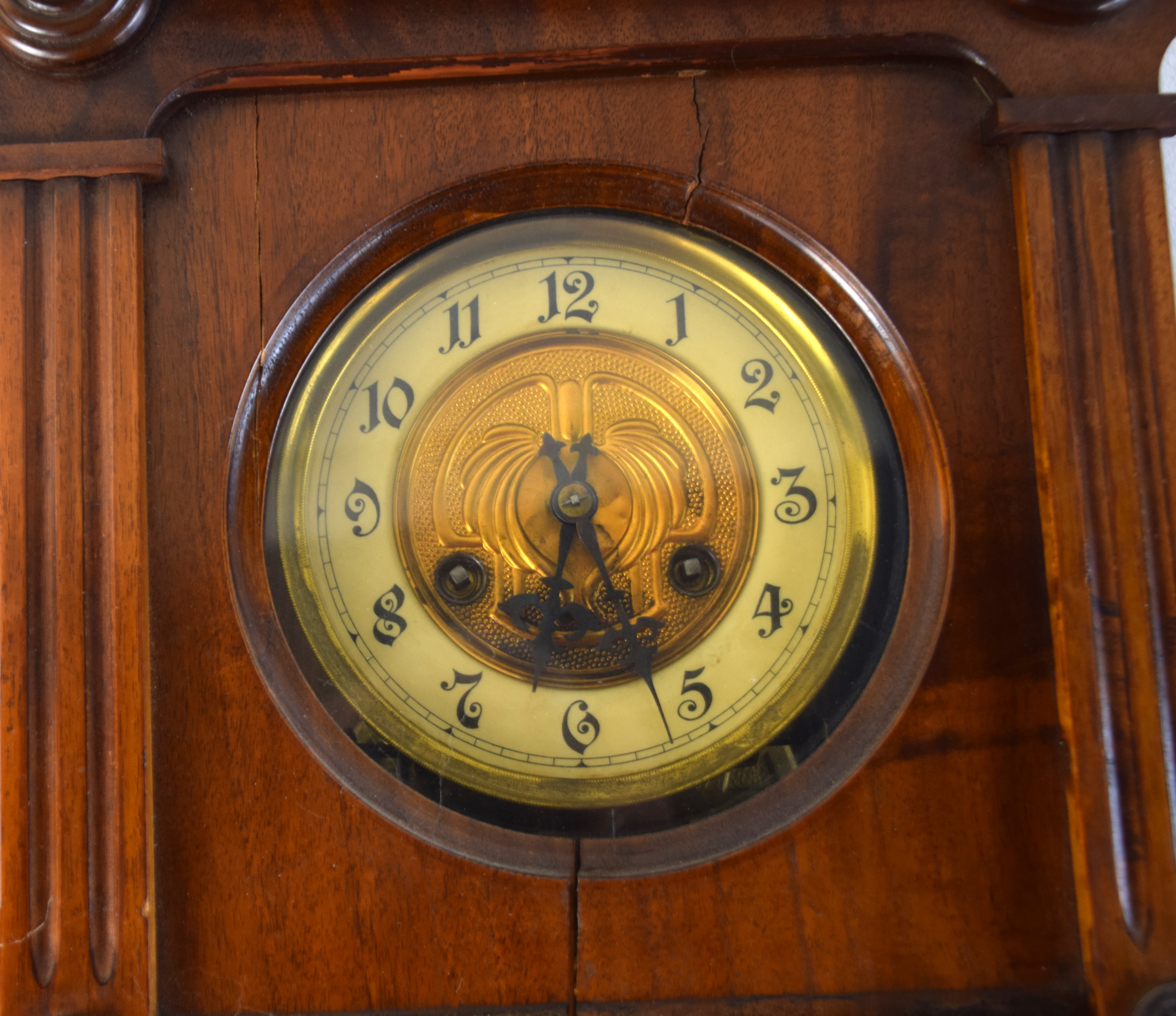 19th Century walnut hanging clock with carved columns, stamped metal pendulum with two key holes with key. Dimensions: 23″ H x 14″ W x 6.5″ D