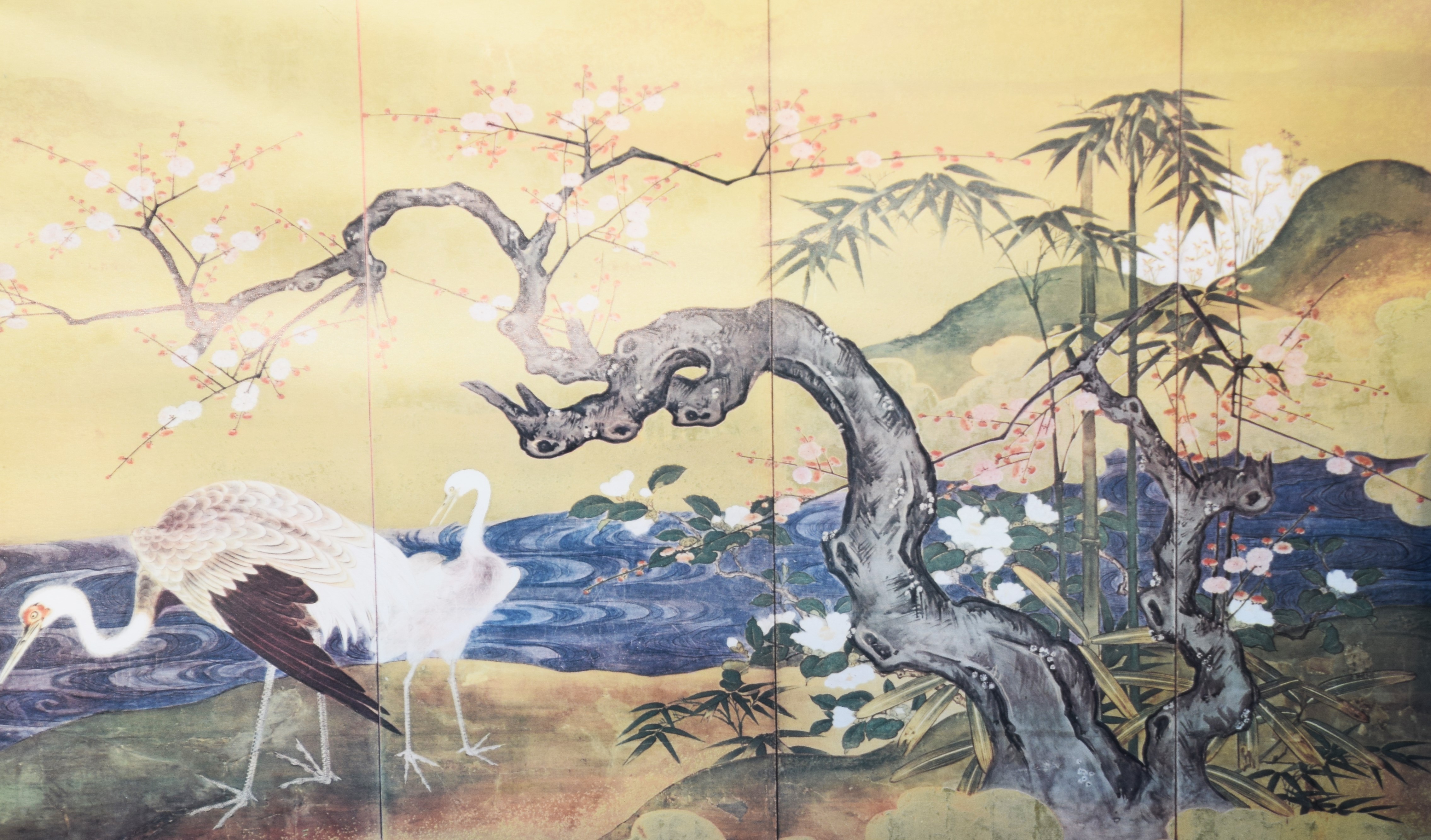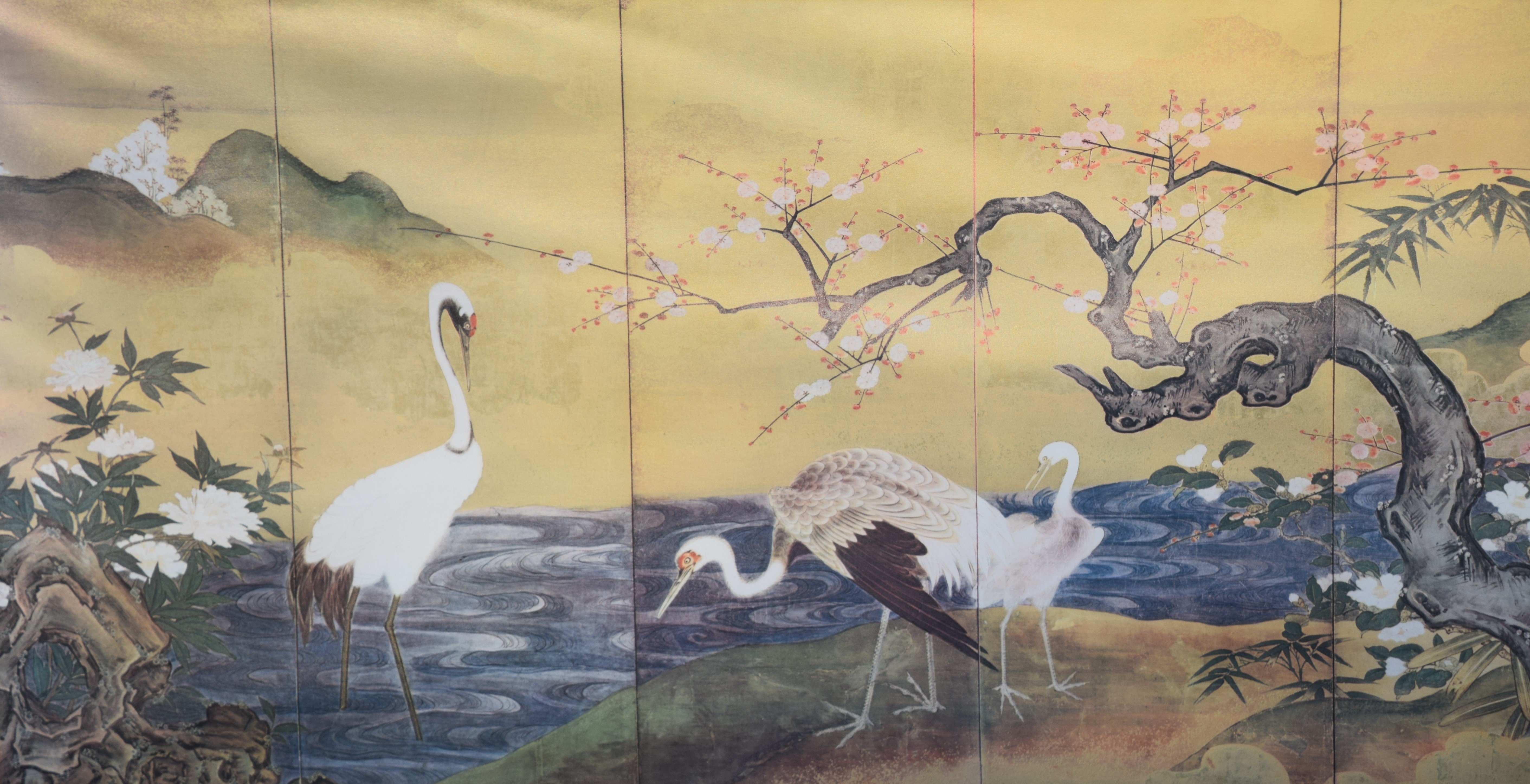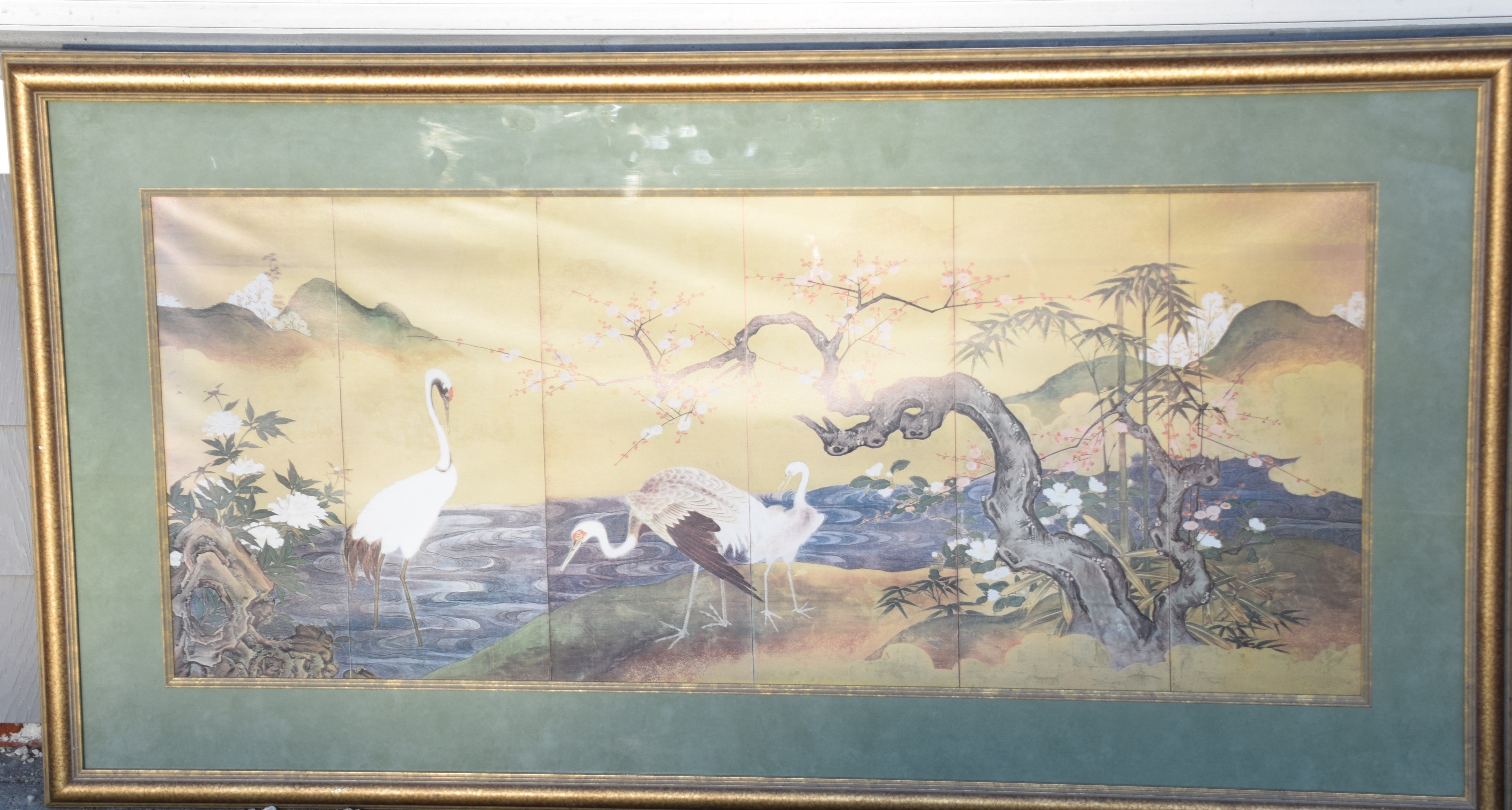 Framed six panel Japanese artwork of three cranes along a river with a flowering tree. Dimensions: