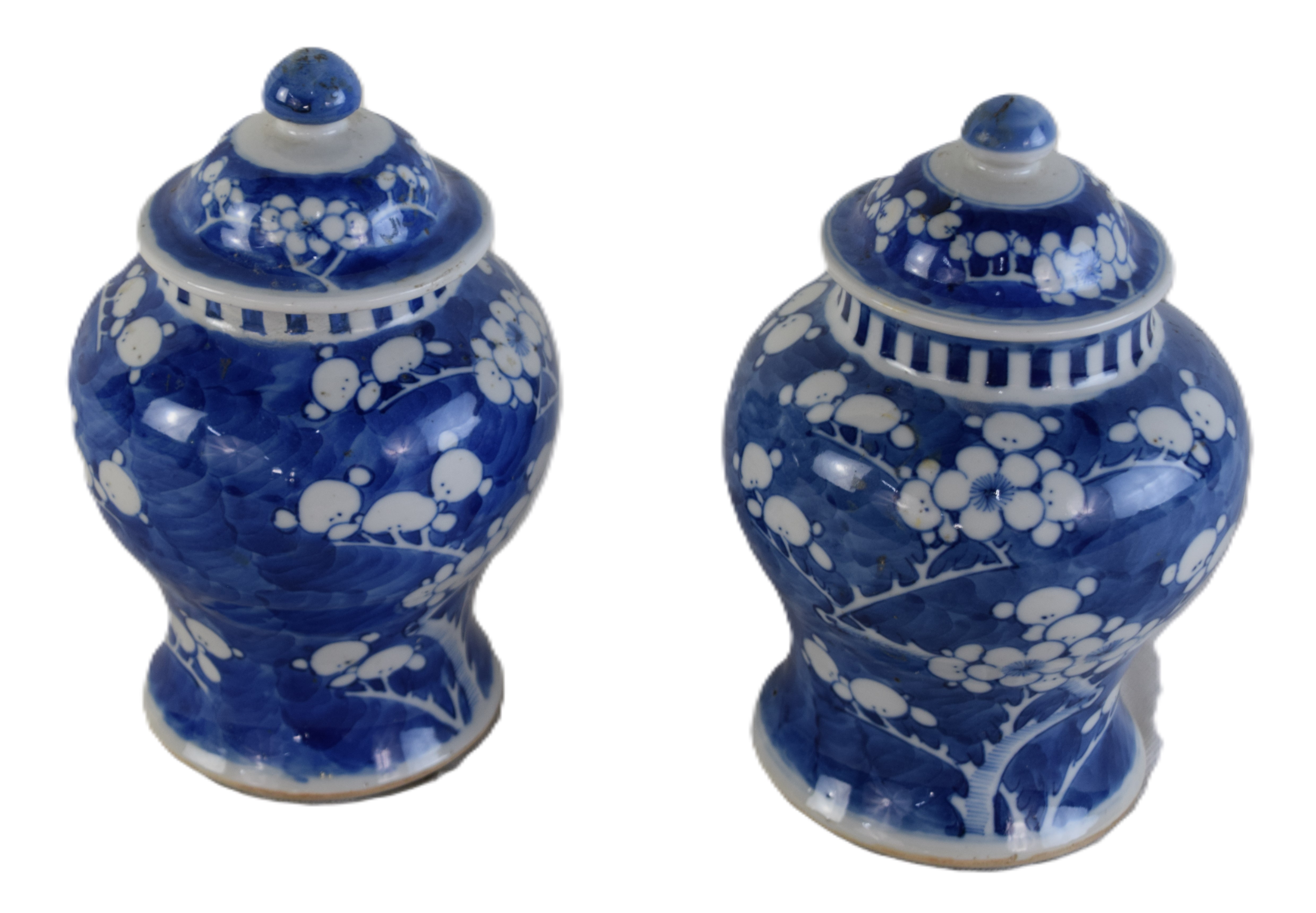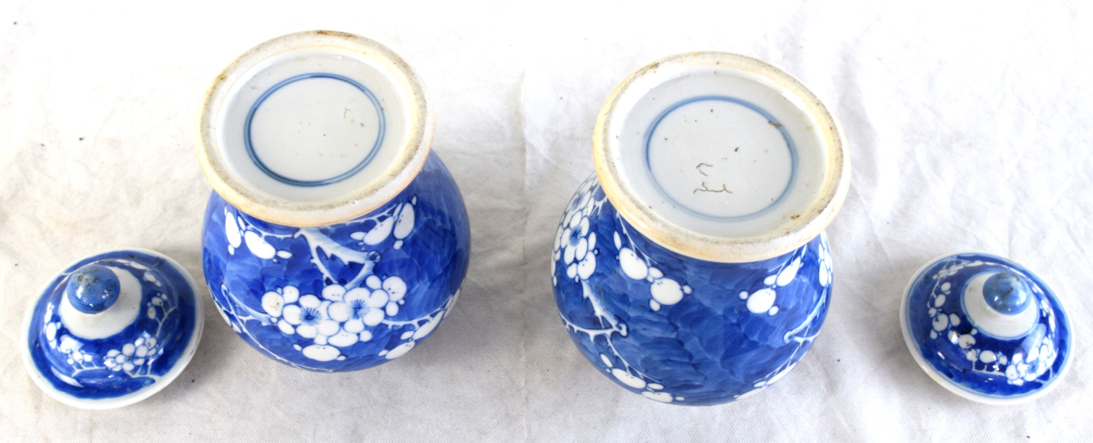 Pair of Chinese glazed porcelain jars with lids and with floral design and with round blue circular mark on bottom. Dimensions: 9″H