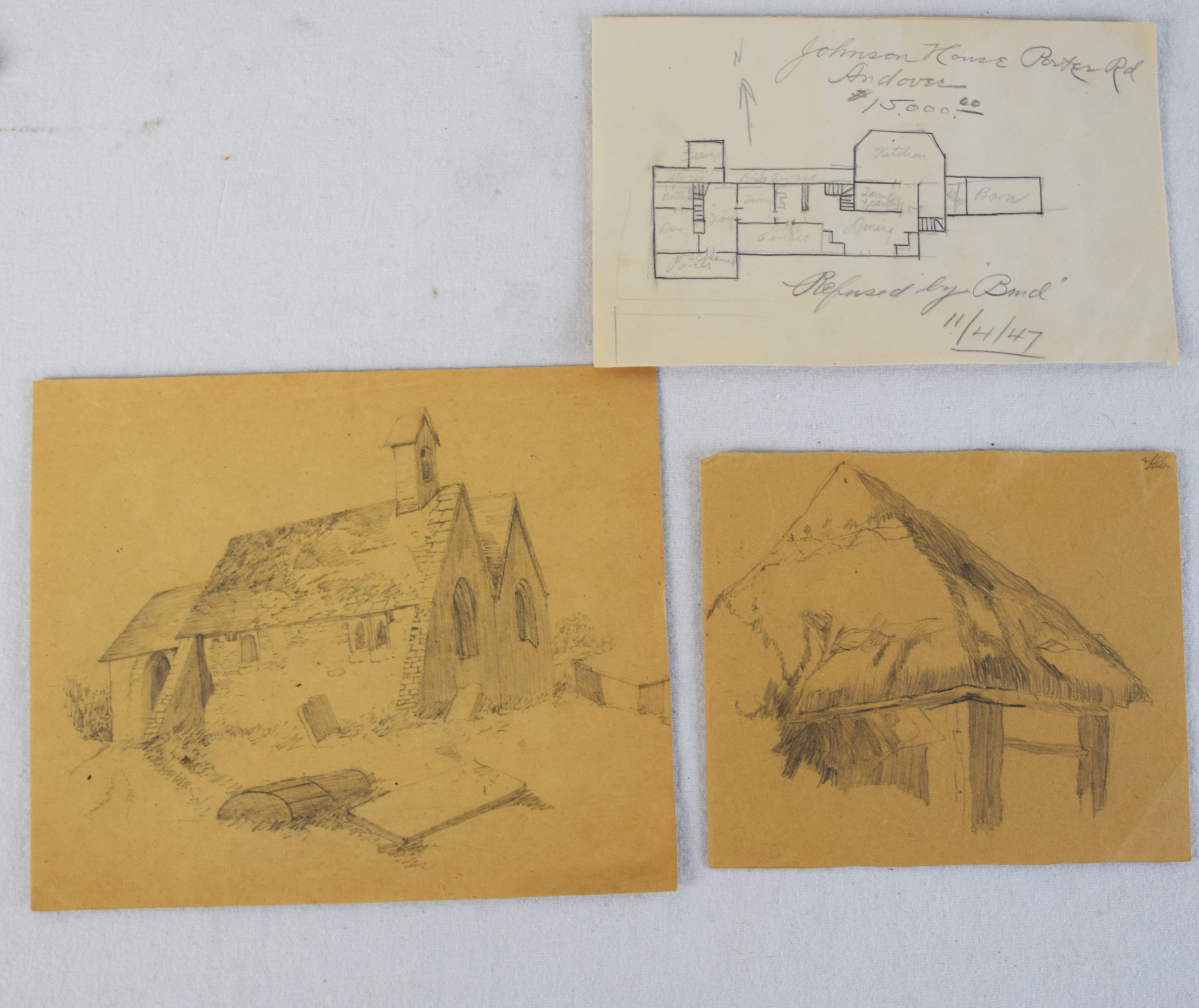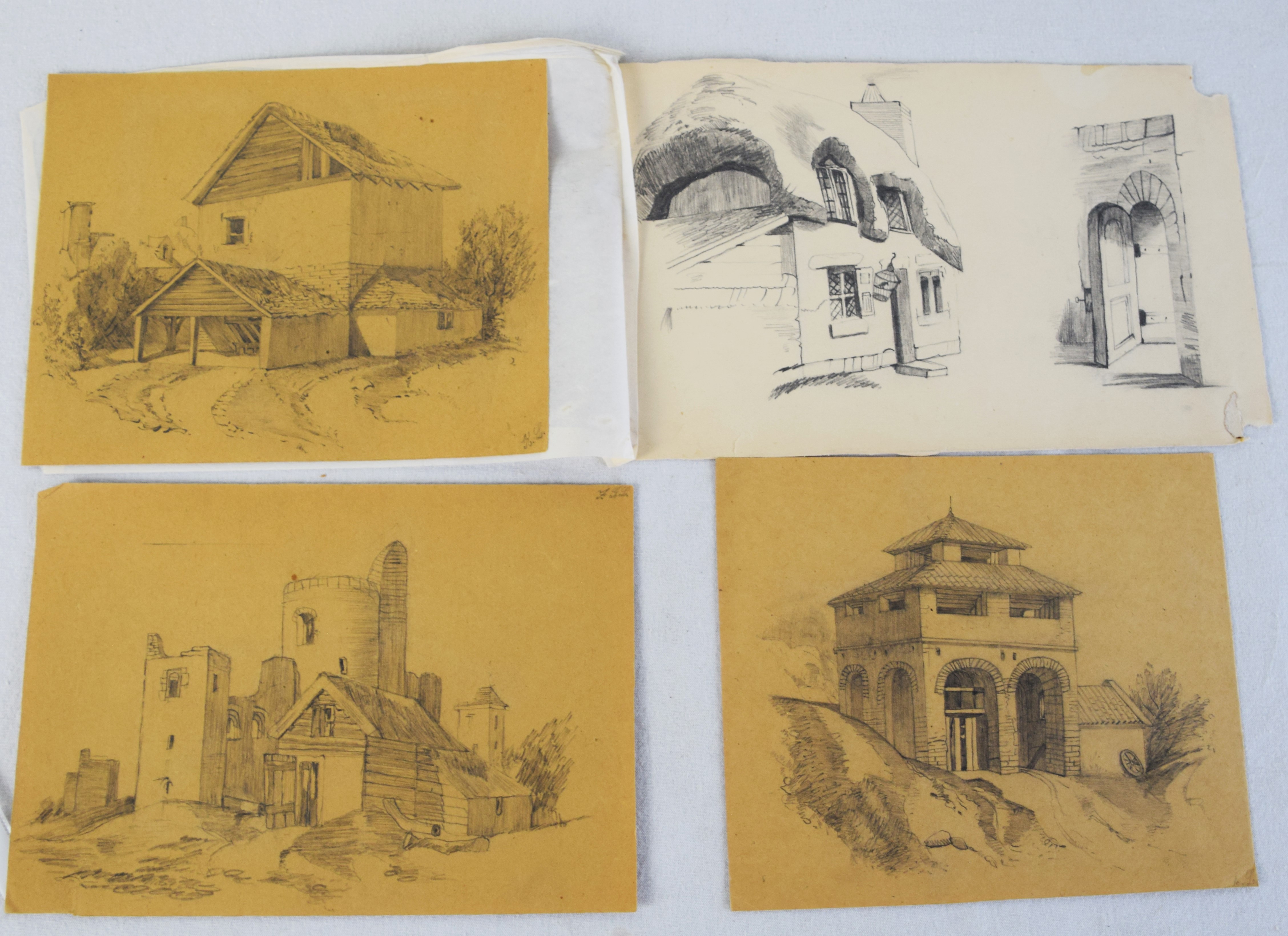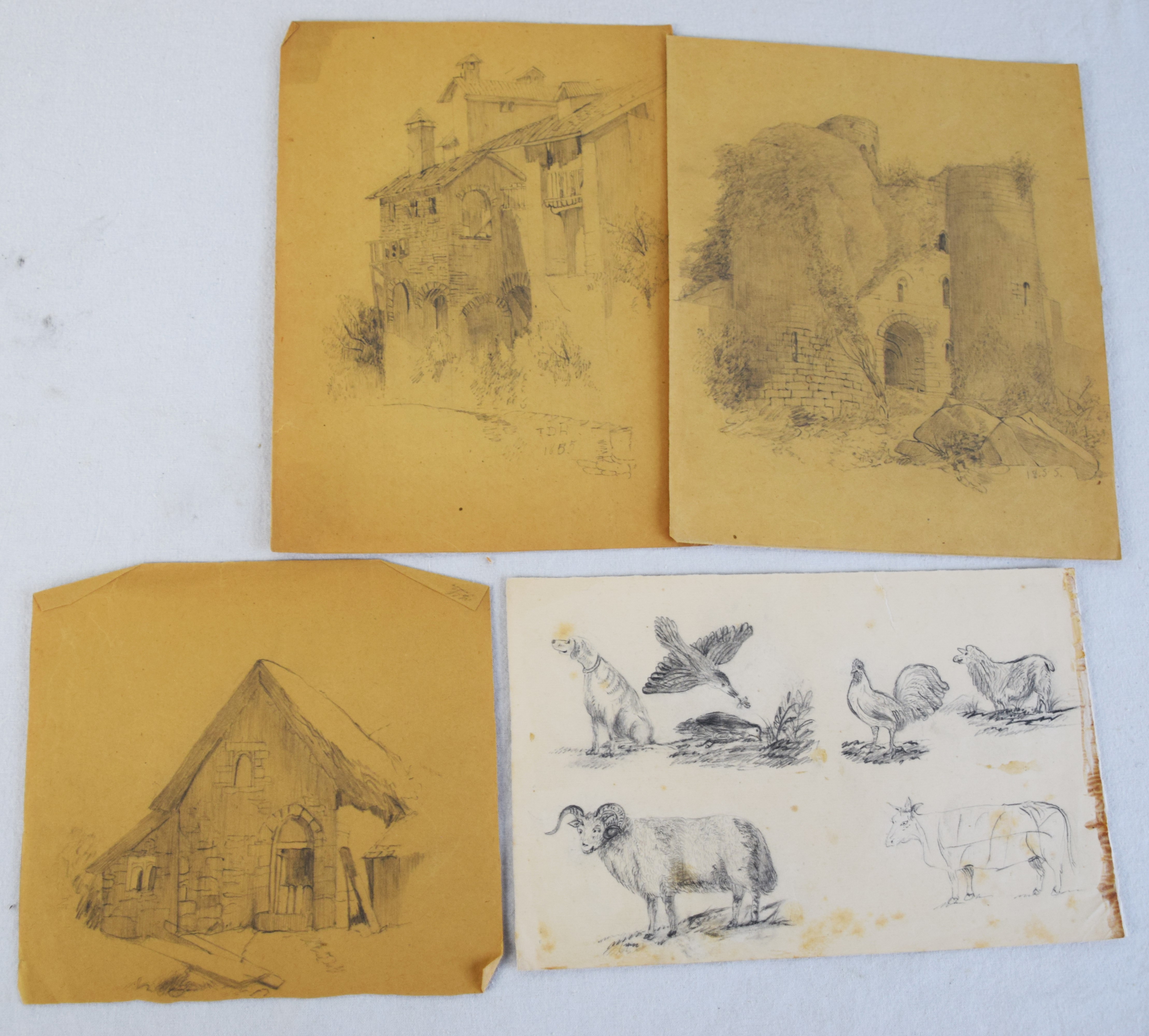 16 artist sketches circa 1940s of buildings and animals, well done, various sizes