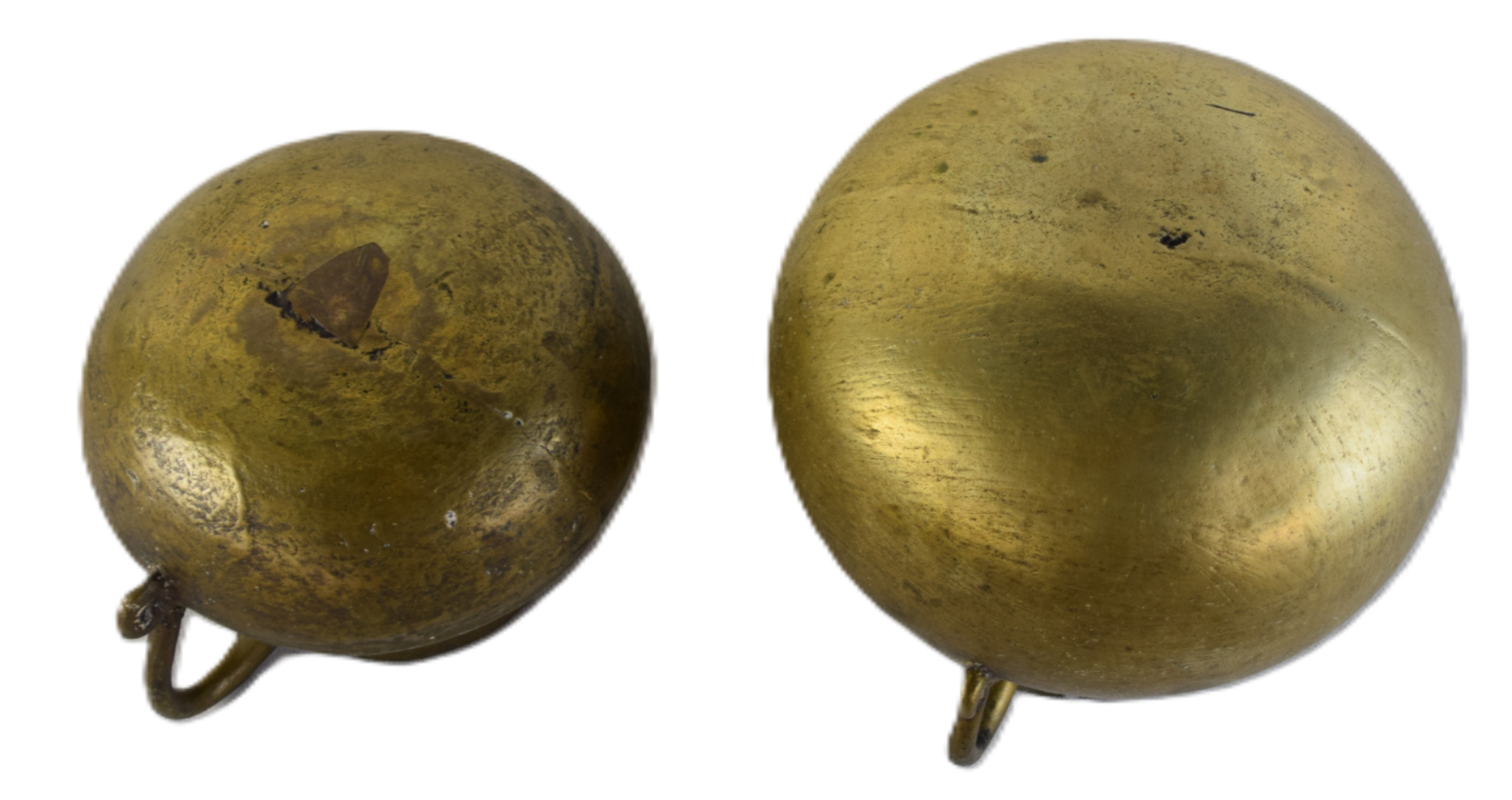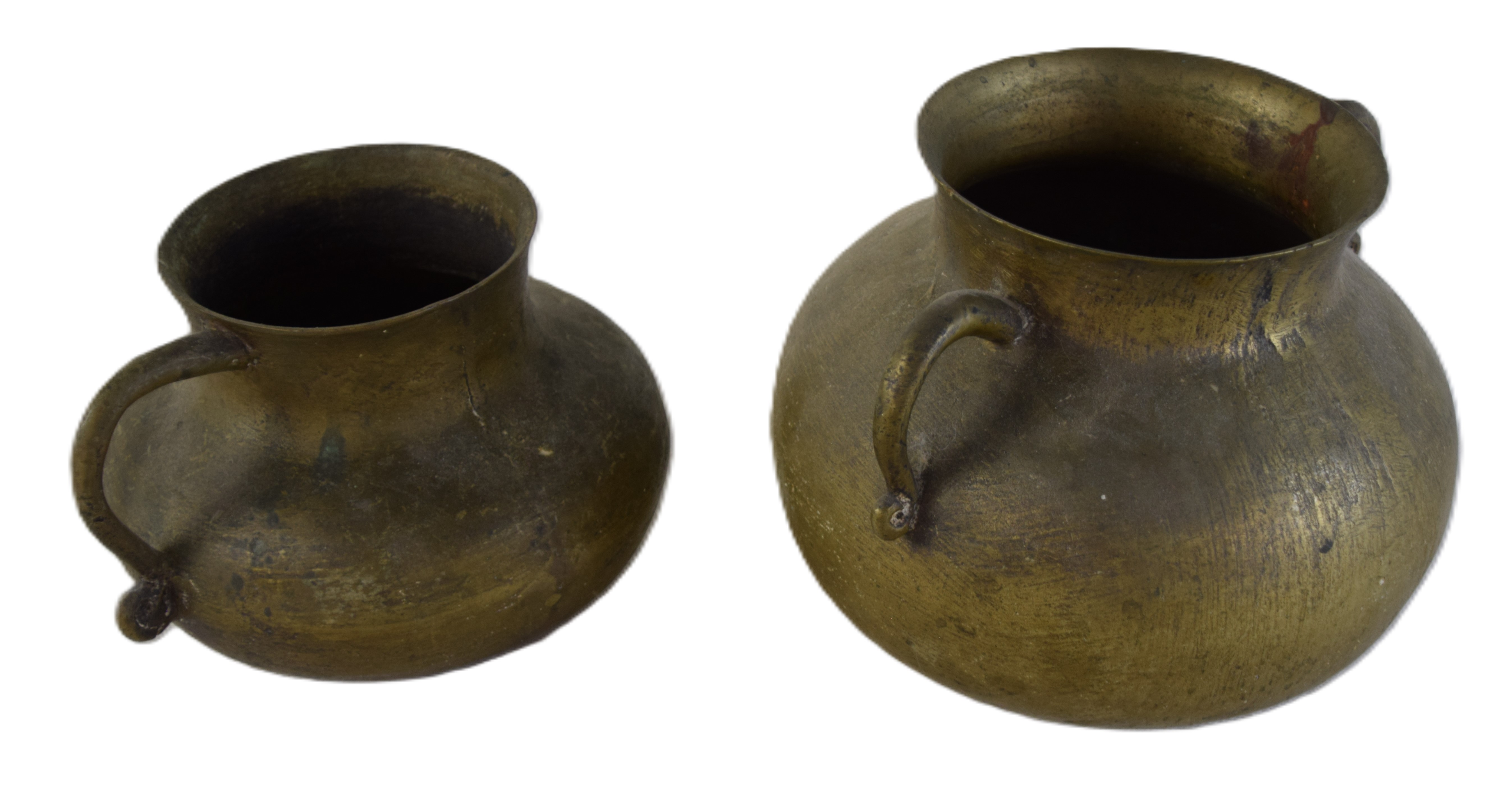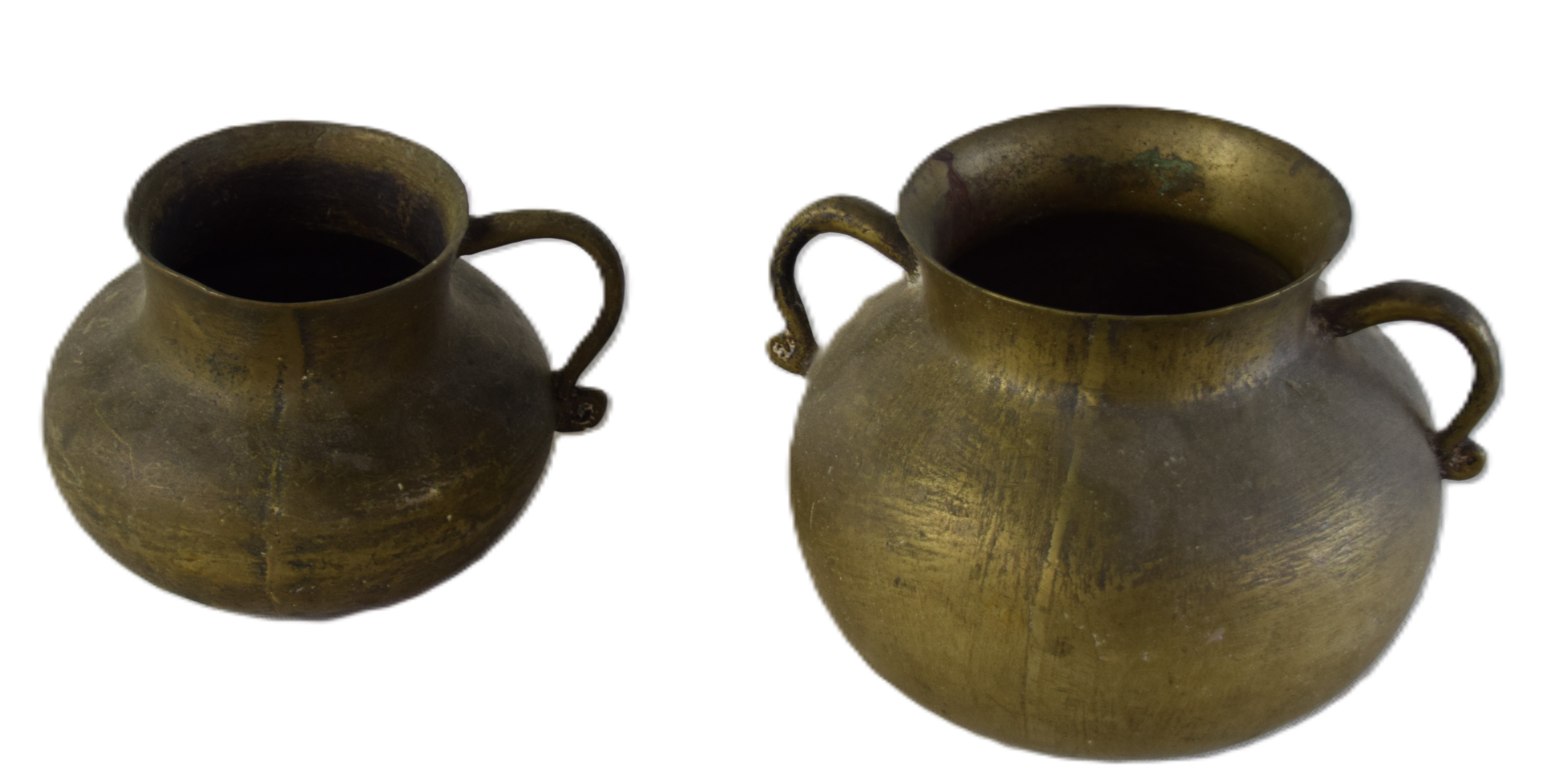 Early English bronze pots, one with pigtail handles and the other with a single handle. Dimensions: 7″ H x 5″ Dia and 5″ H x 4″ Dia