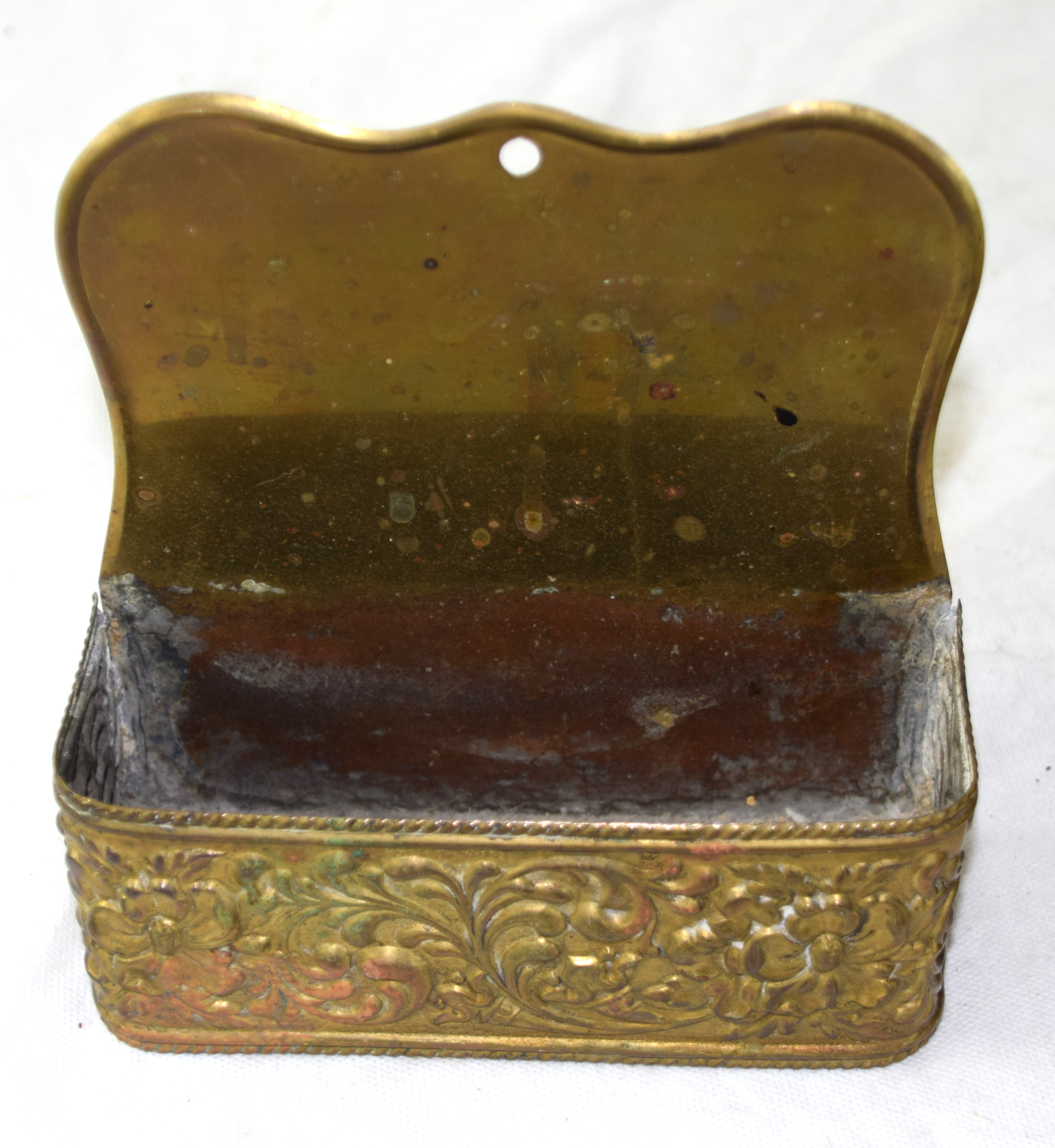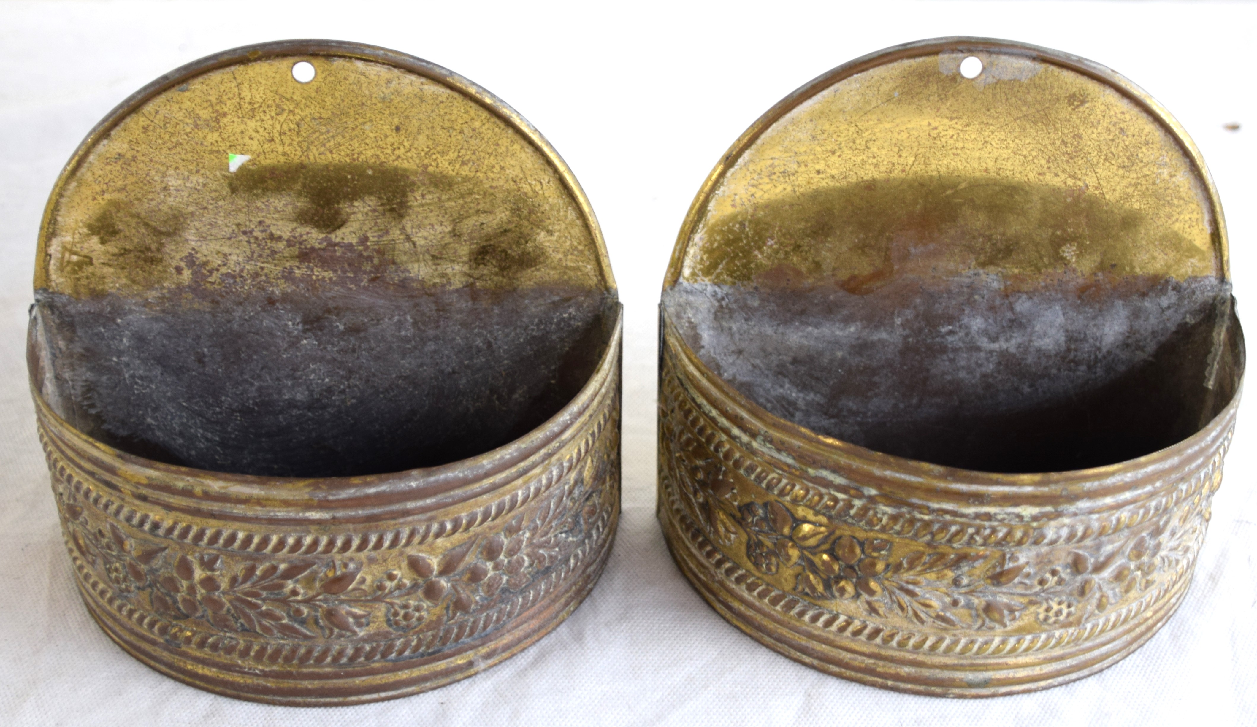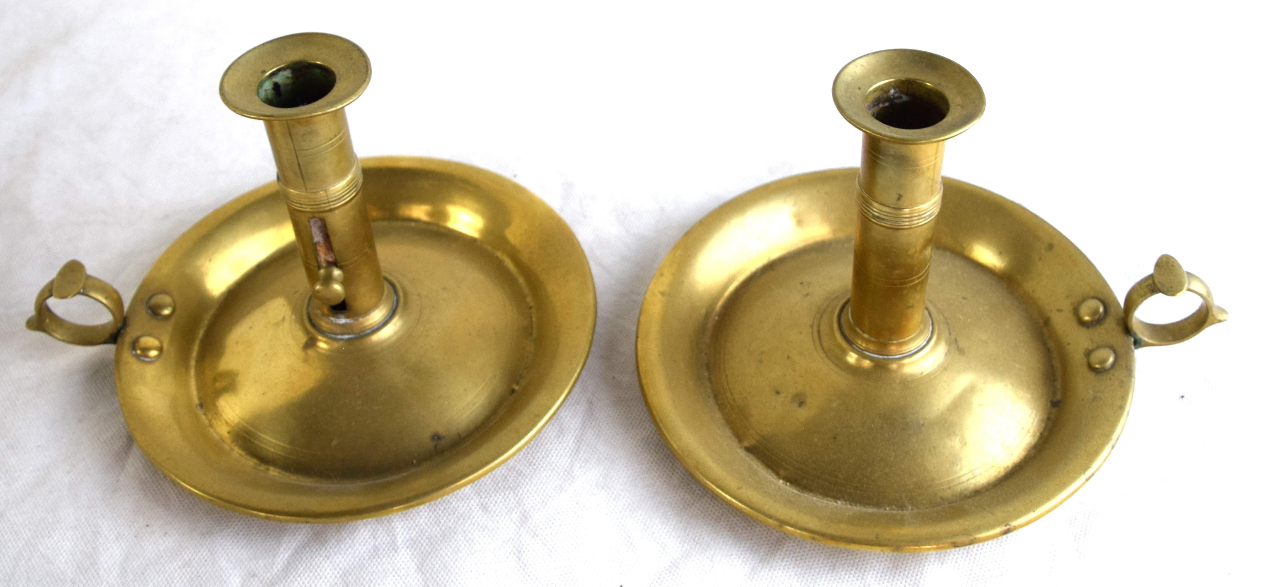 19th Century brass lot including a Russian basket with imposed seal (14″ Diameter), three English repose wall pockets (6.5″ H) and two matching push-up candlesticks on circular bases (4.5″ H).