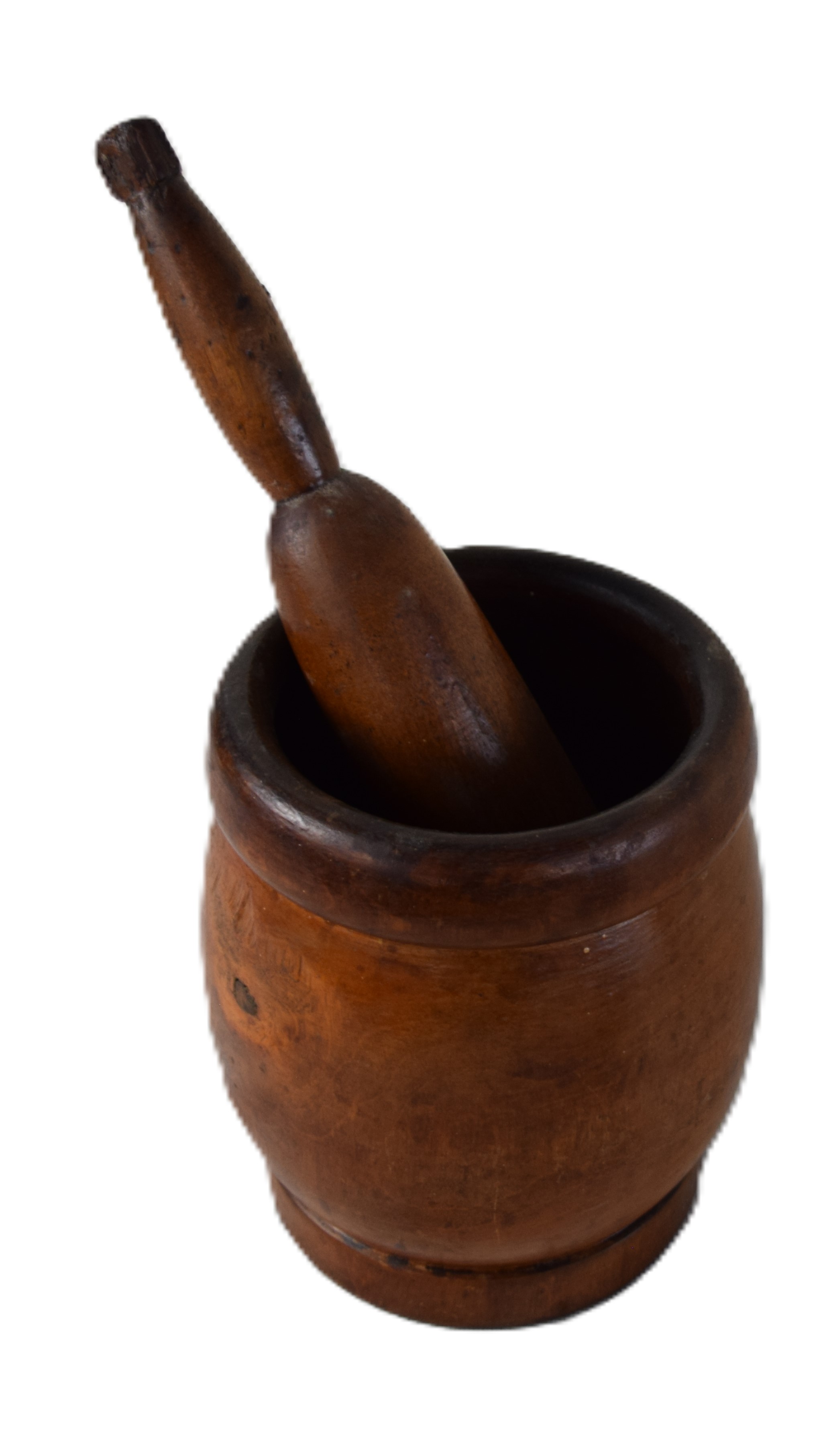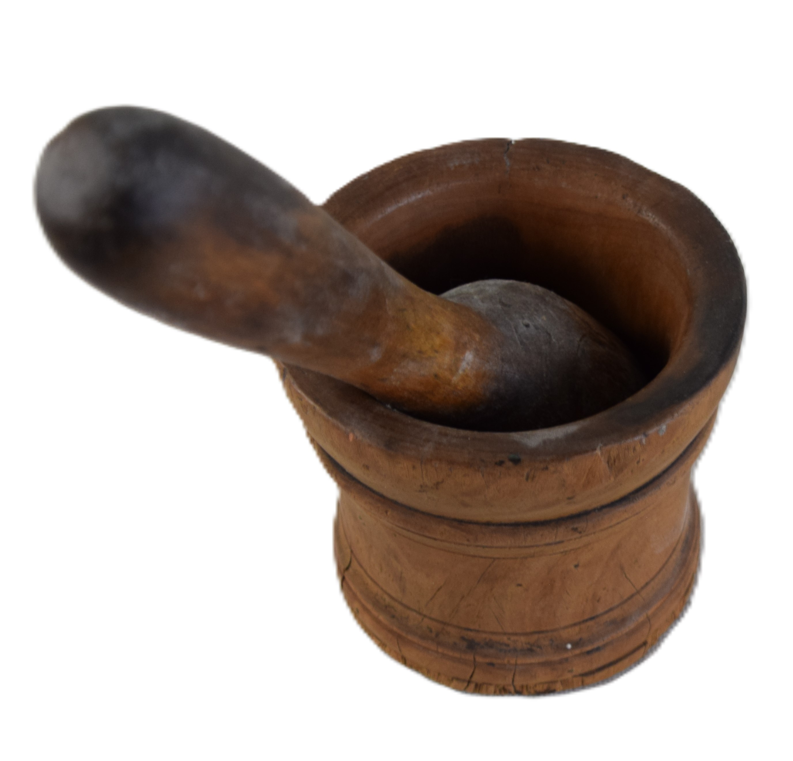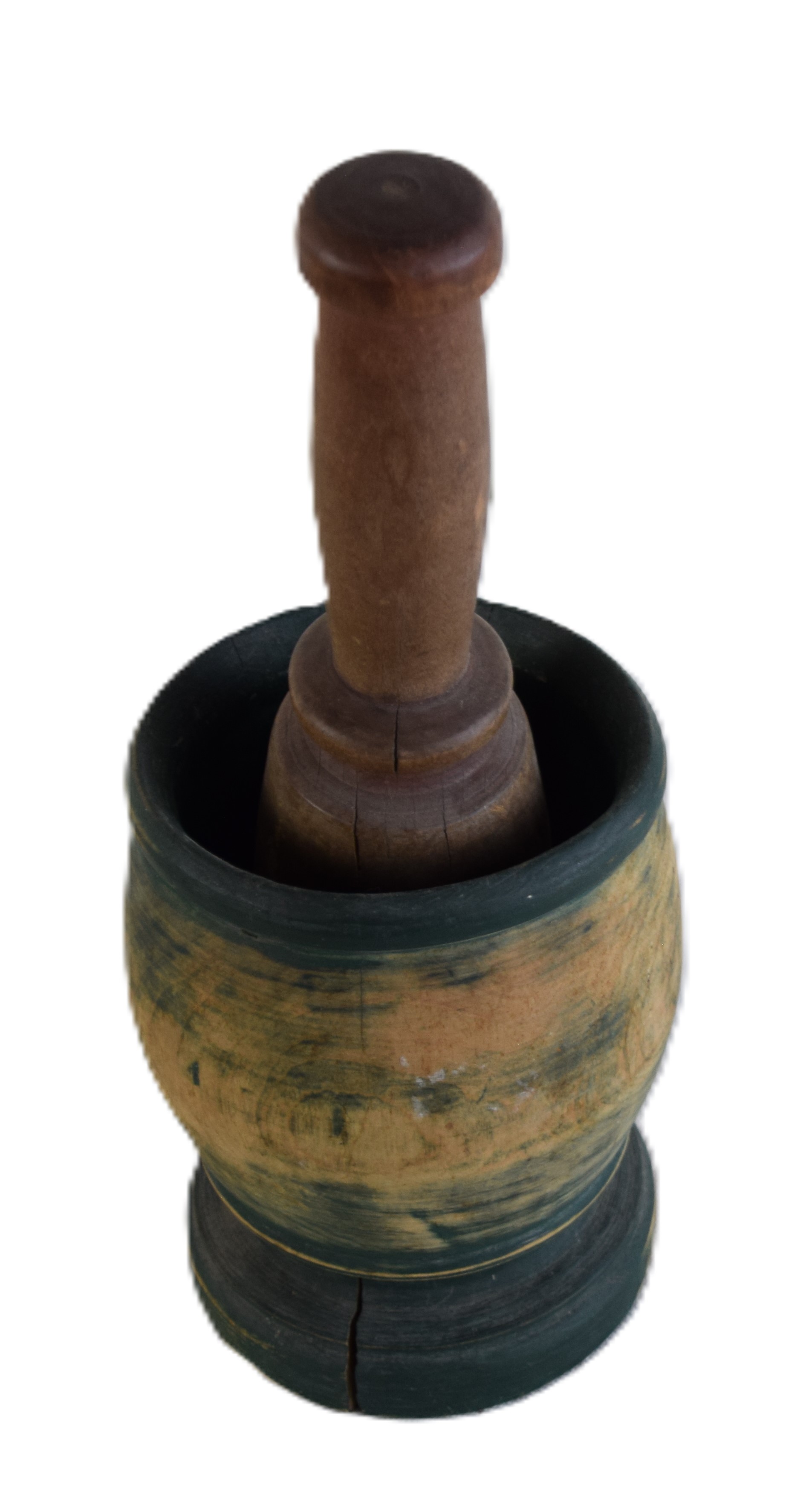 Three wooden mortar and pestles, one farmhouse green mortar/unpainted pestle (7″H x 5.5″ Dia), one natural wood (7″ H x 6″ Dia), and the other a primitive wood (3.5″ H x 4″ Dia).