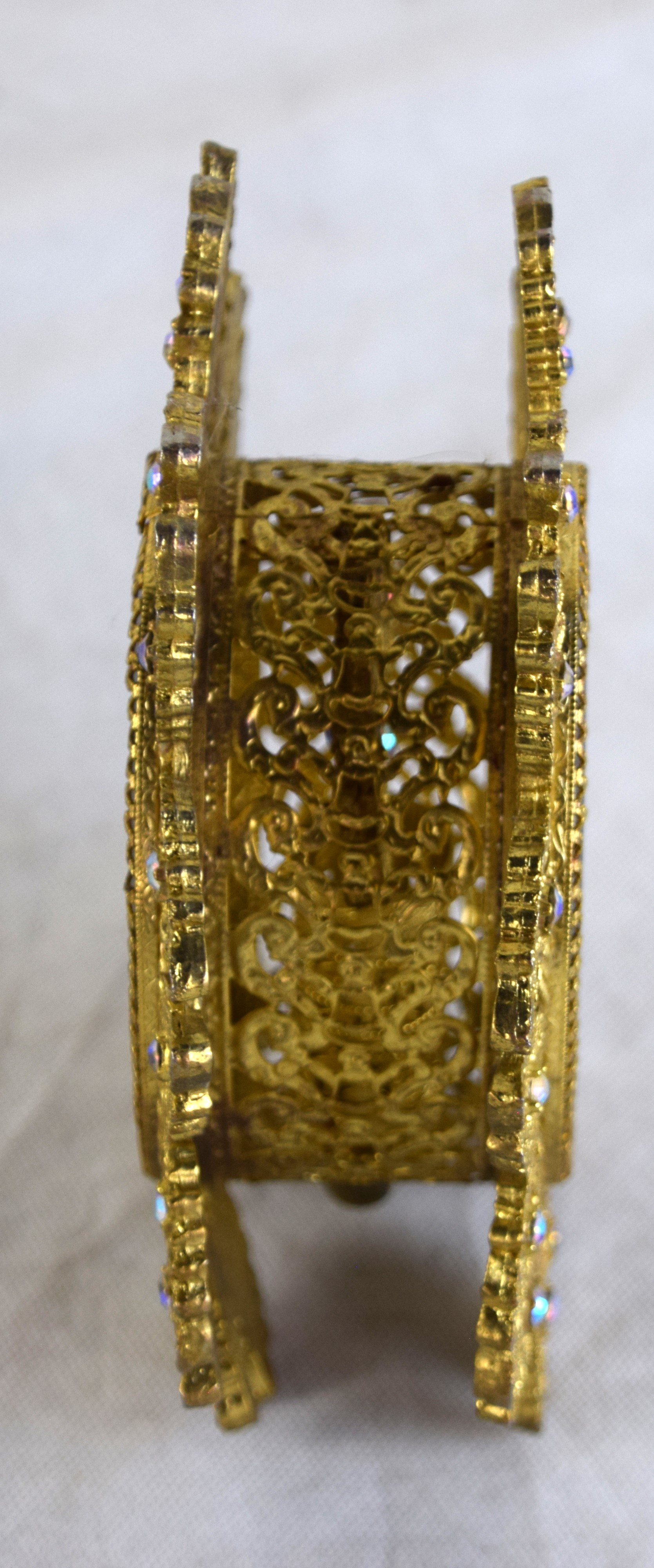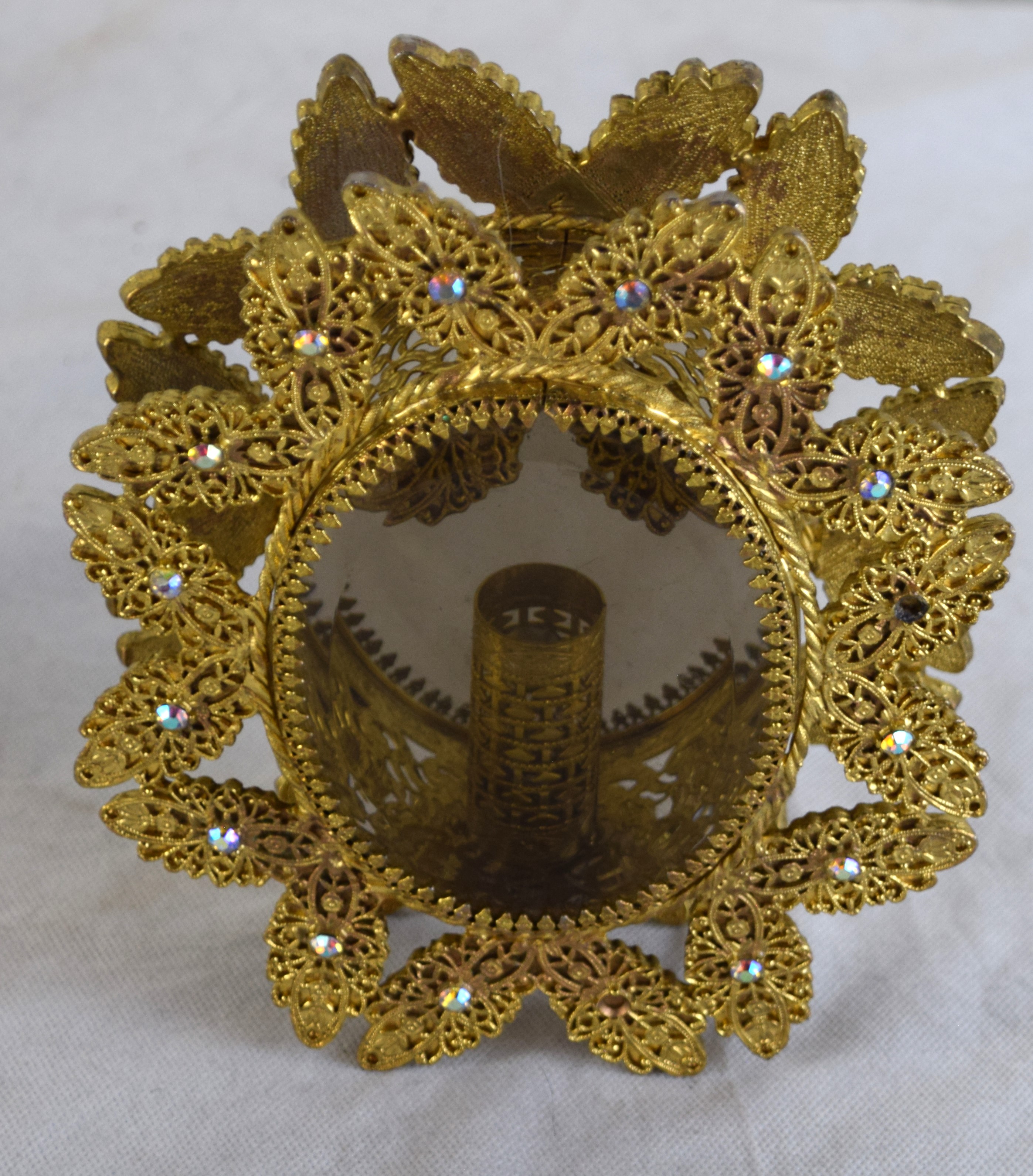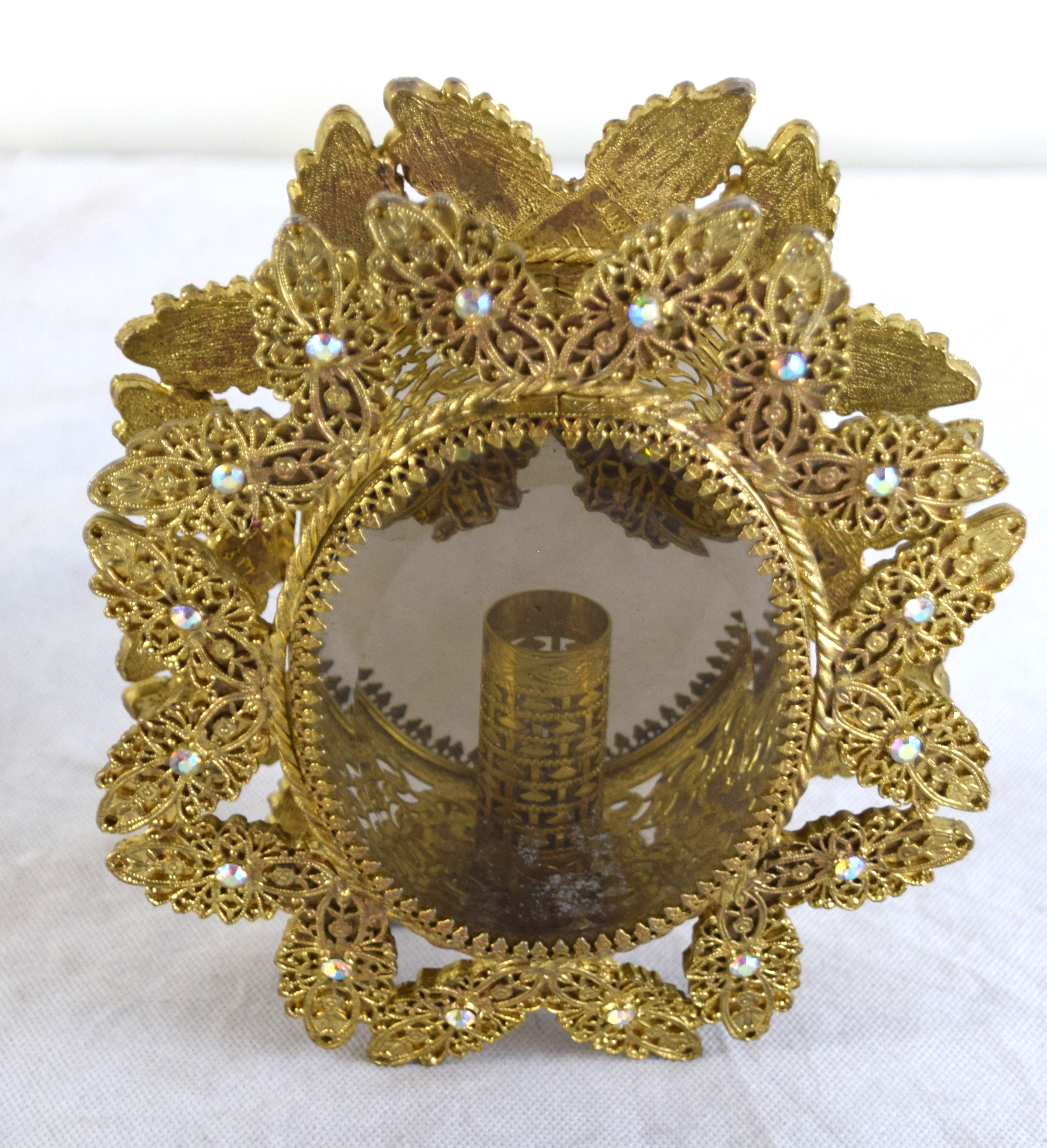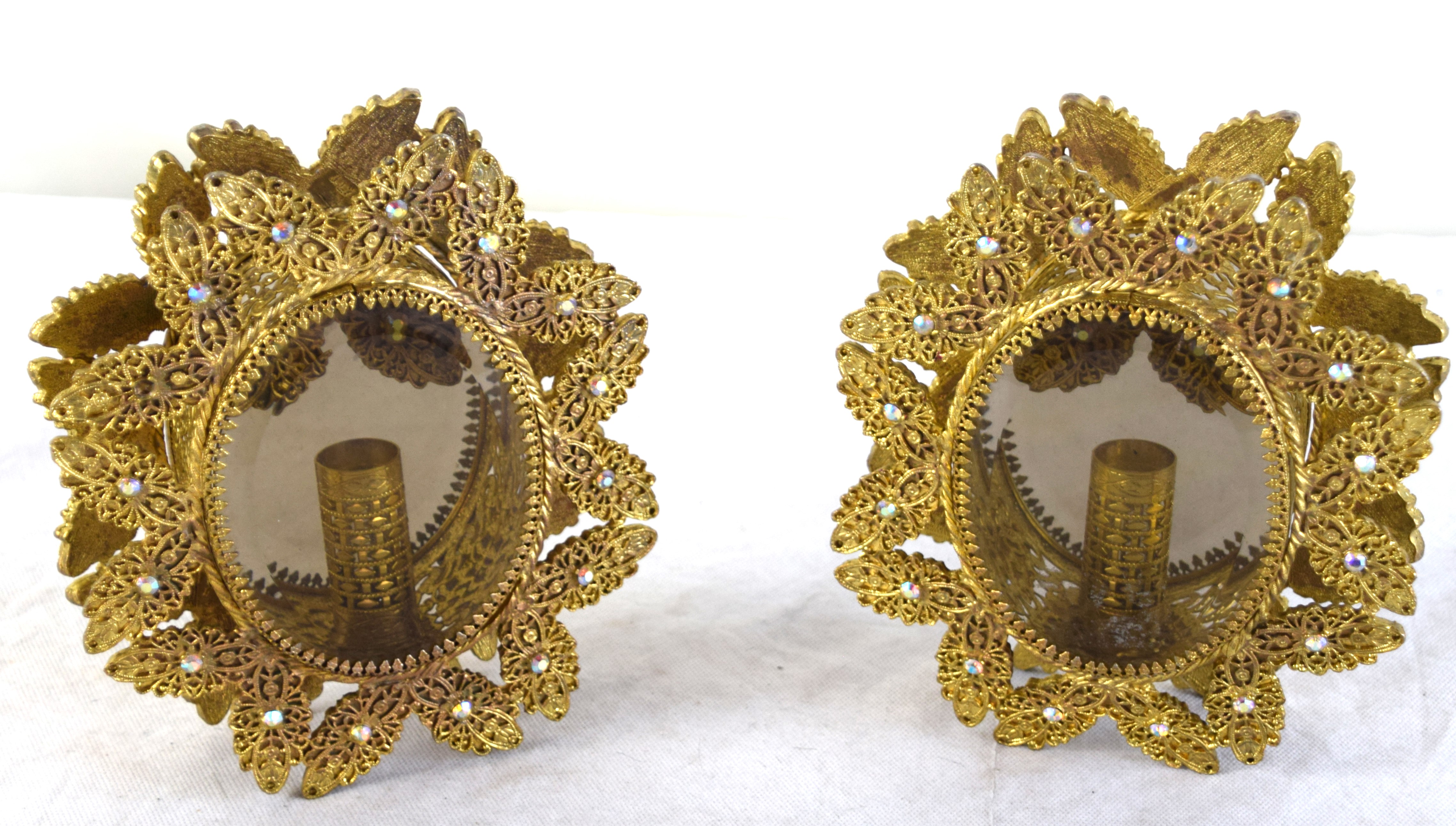 Pair of ornate brass candleholders in a shadow box with exquisite decorations with stones on front and back with beveled glass. Dimensions: 7″ H x 6″ W