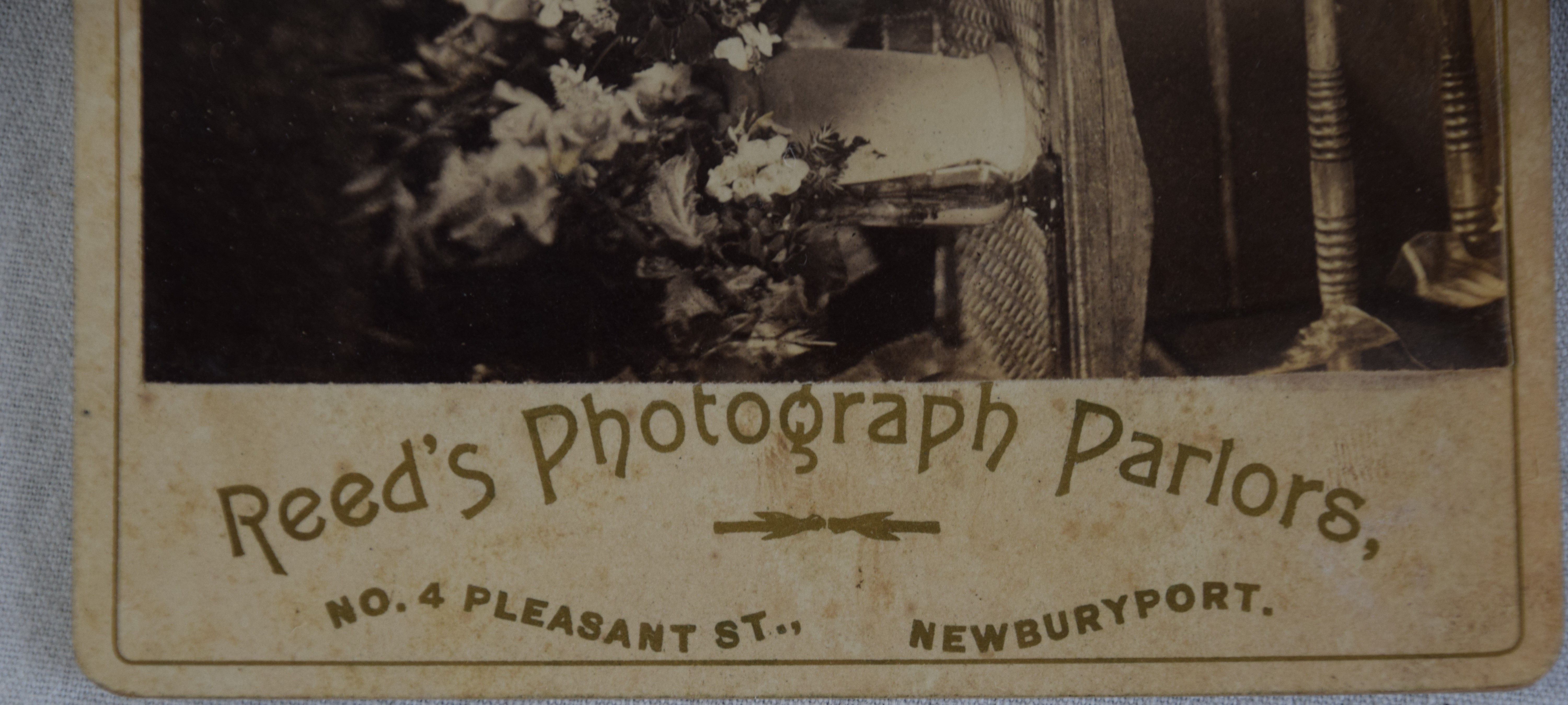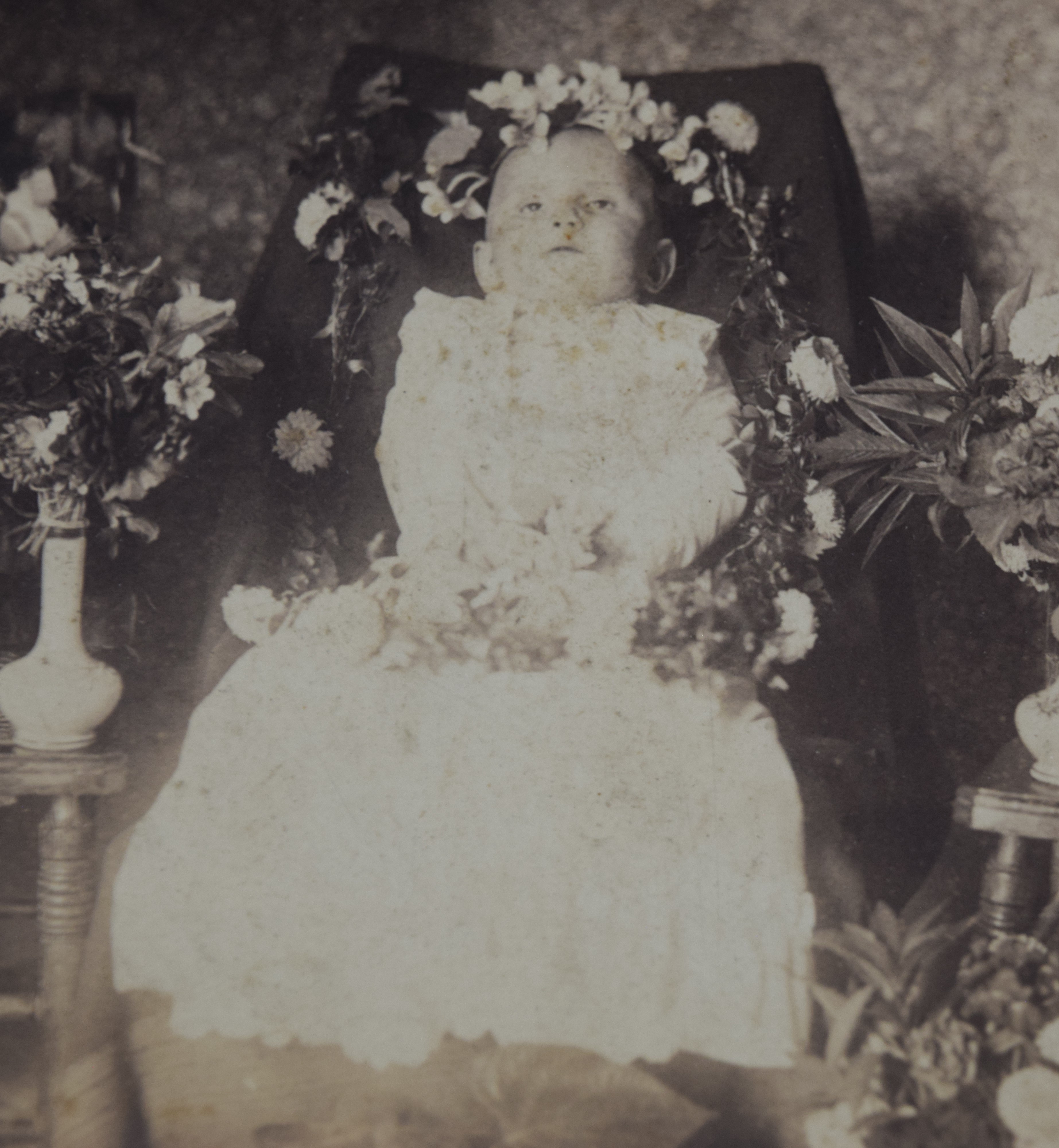 Two post mortem photos-one cabinet card baby o chair (7″ x 4.25″) and one tin type baby in casket on stuffed pillow (2.25″ x 3.5″