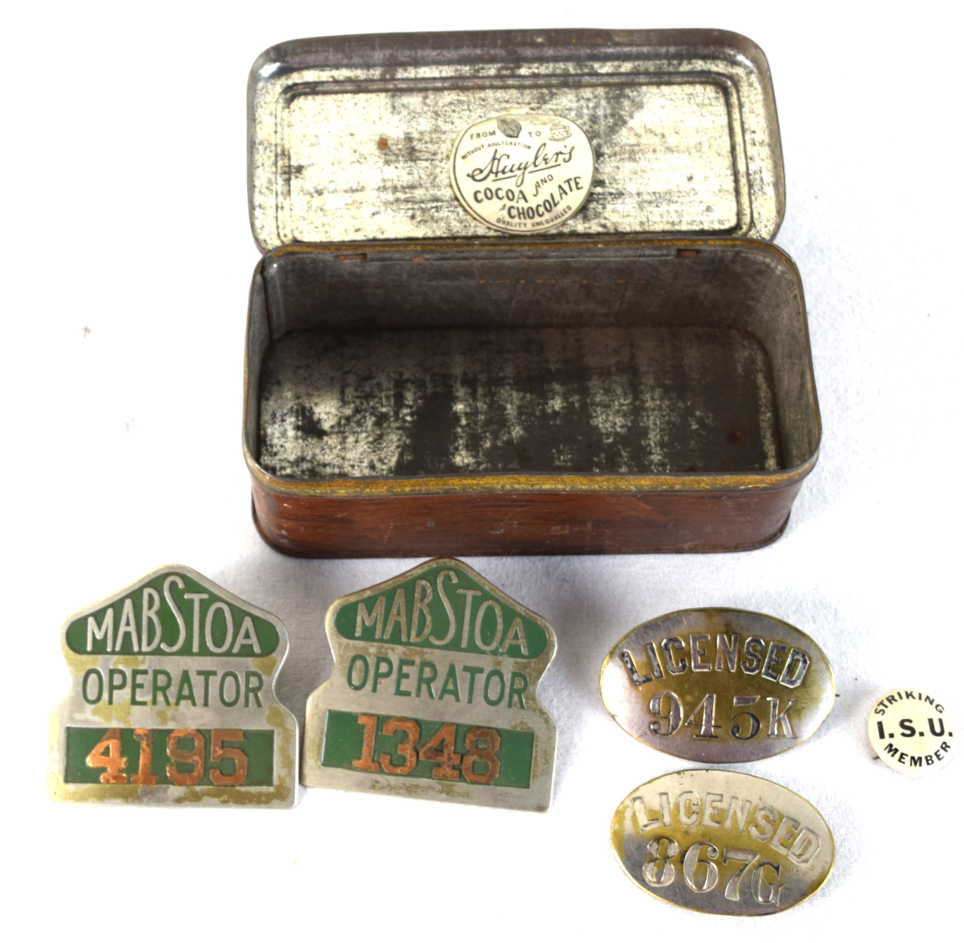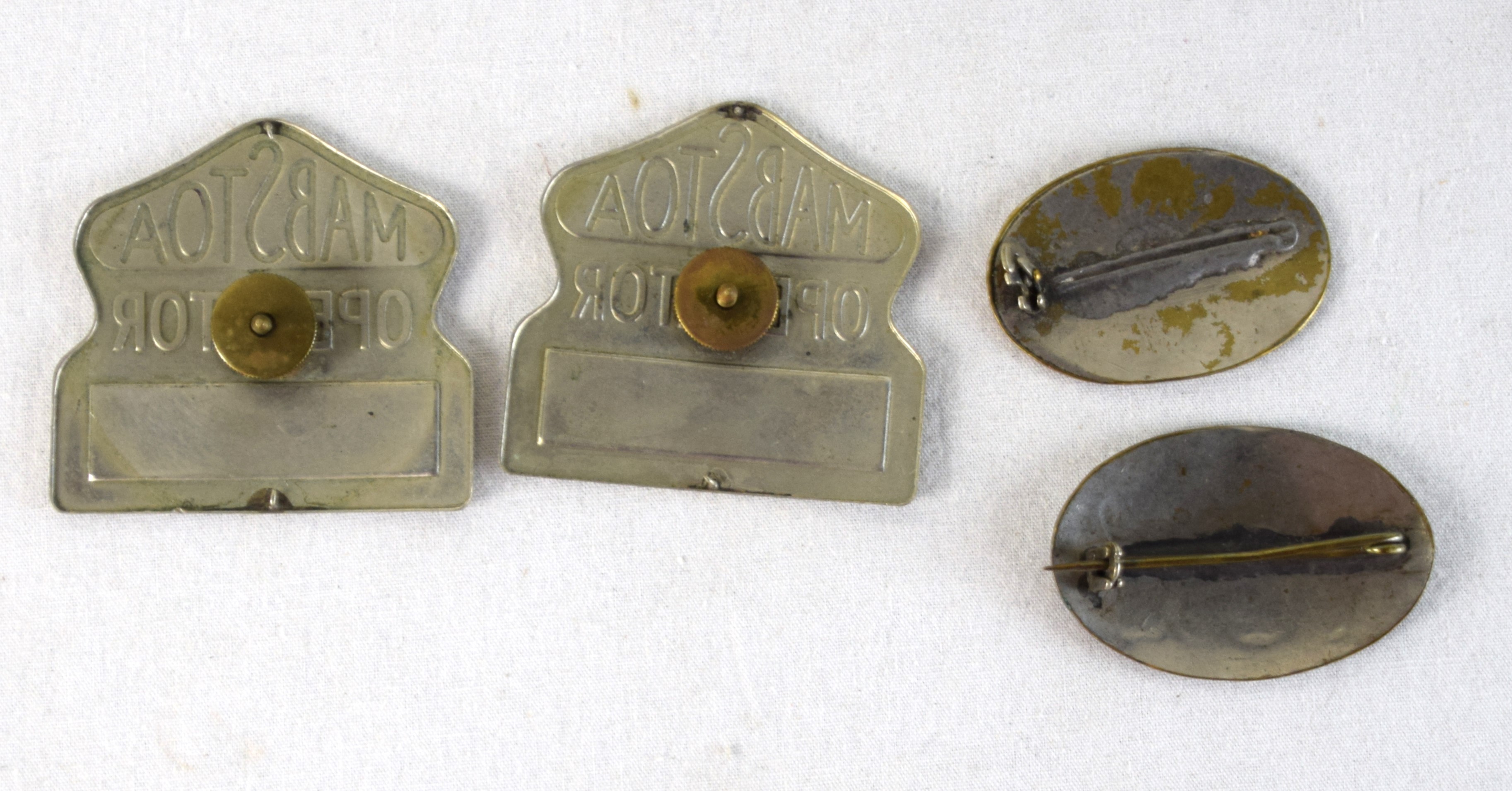 Four old licenses to include two oval taxi medals numbered 945K and 867G and Mabstoa (Manhattan and Bronx Surface Transit Operator Authority) Operator 1348 and 4195.