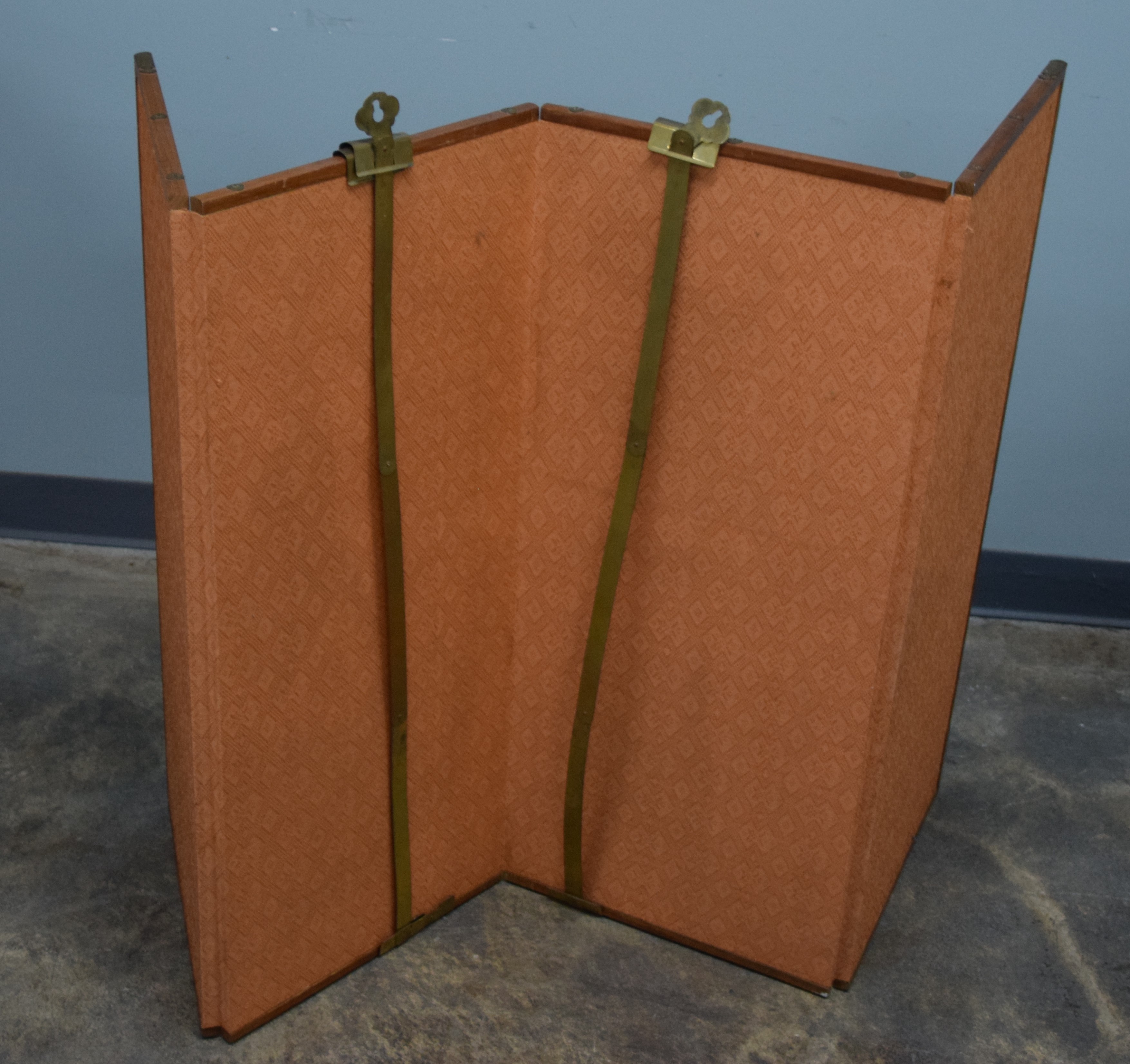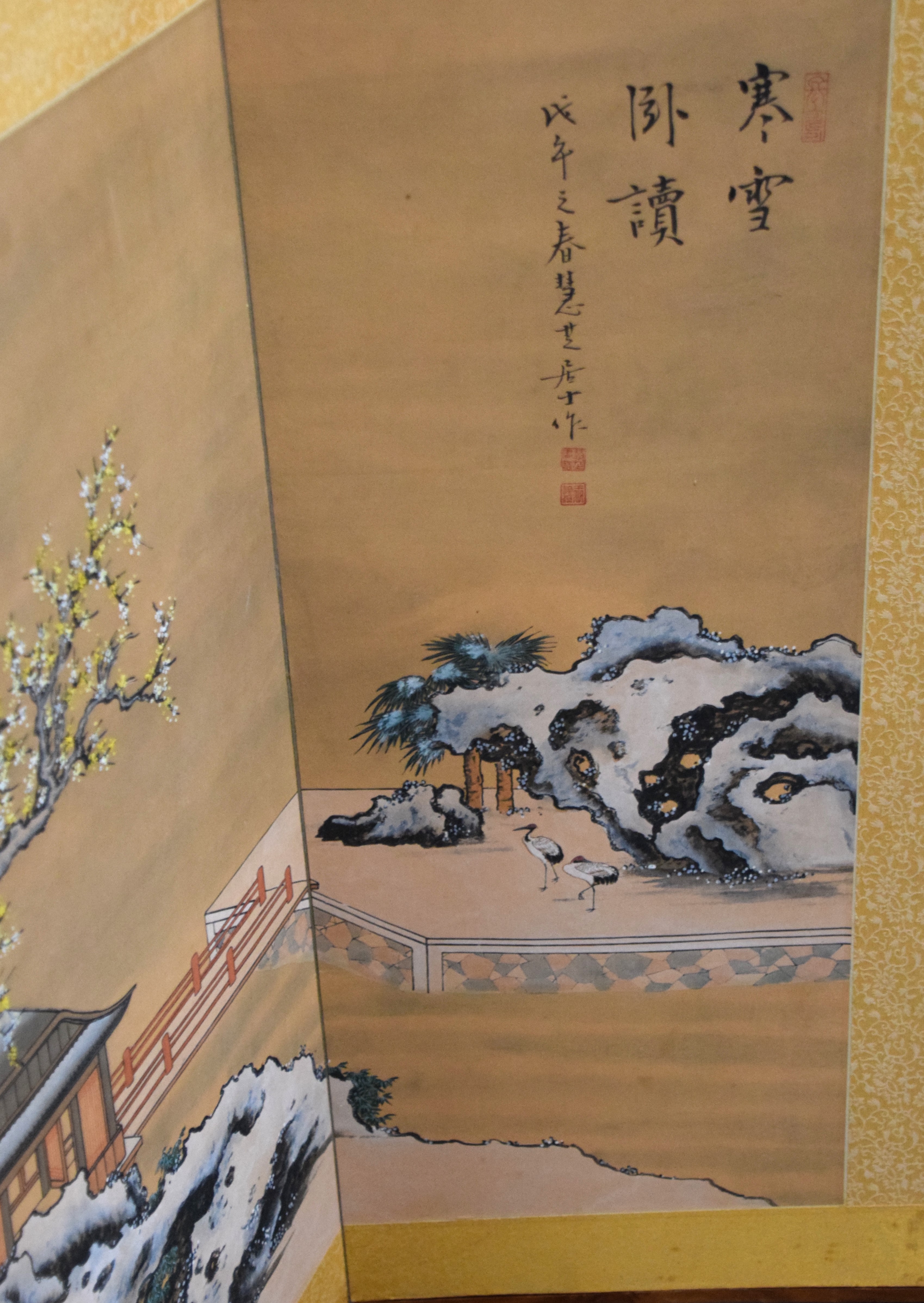 Japanese four panel screen with flowering trees, buildings and a bridge with two brass hangers. Dimensions: 35″ x 15″ Each Panel
