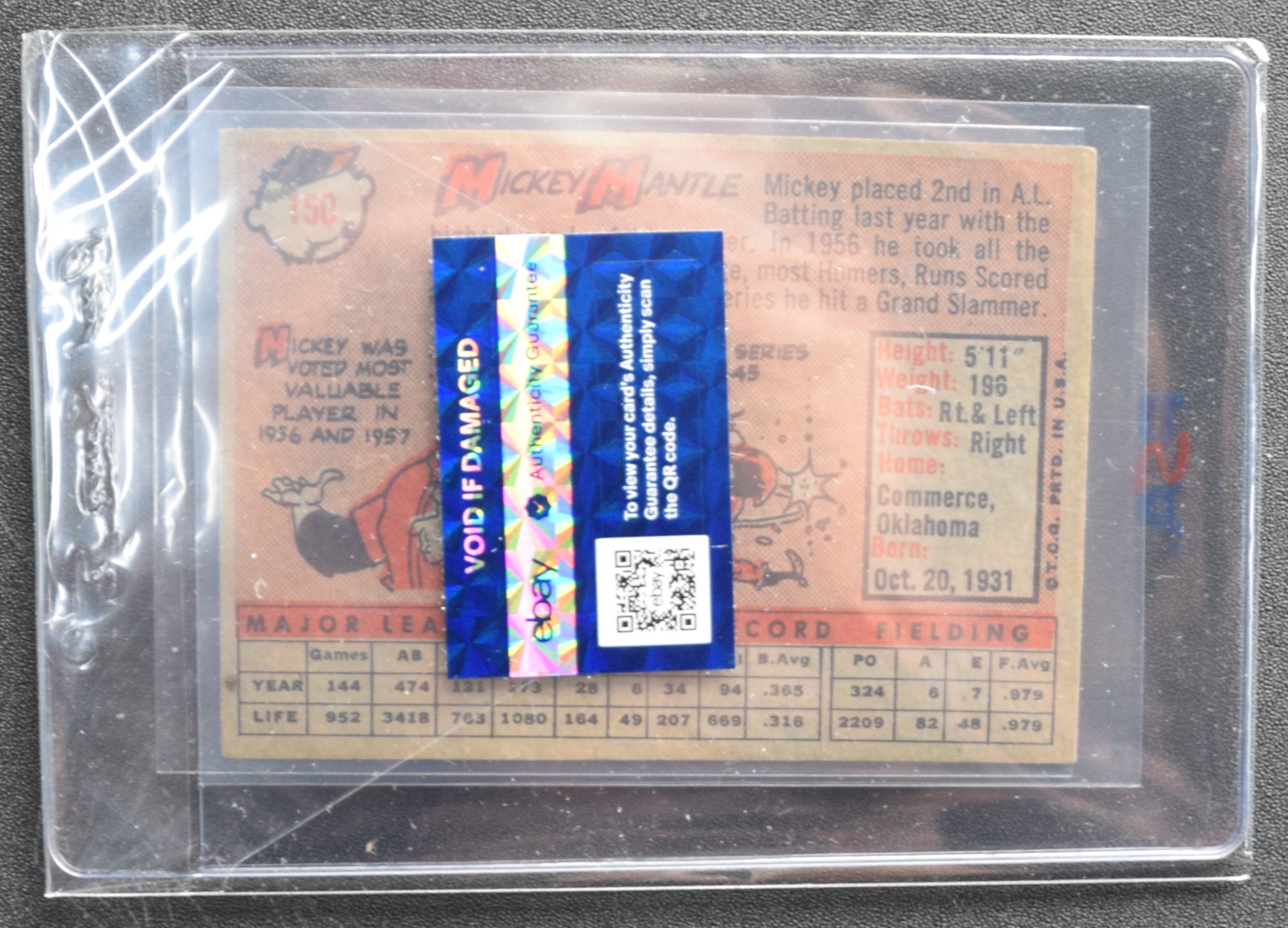 1958 Topps baseball card of Mickey Mantle, New York Yankees, Card # 150, PSA Authenticated