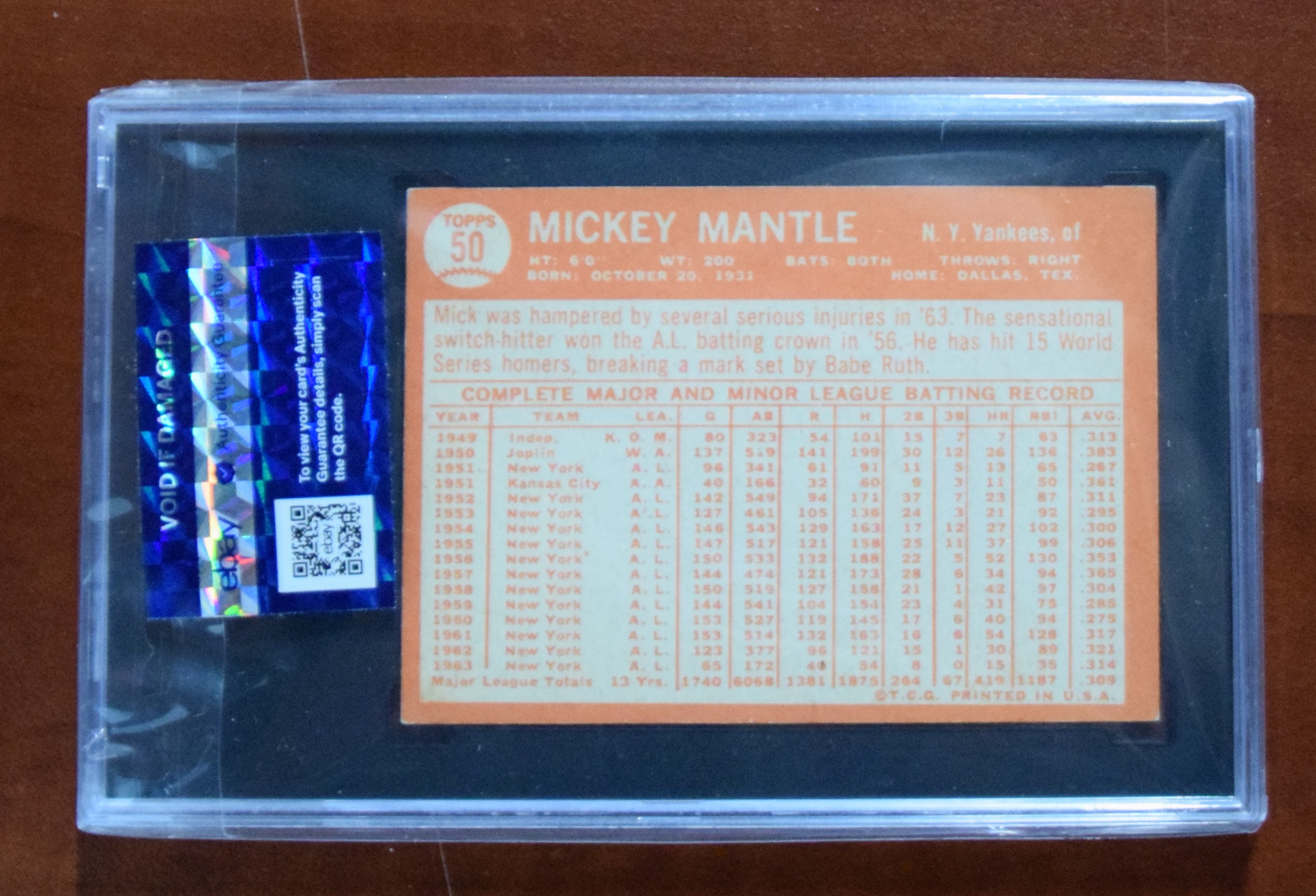 1964 Topps Mickey Mantle baseball card of New York Yankees, Card # 50, graded 5.5