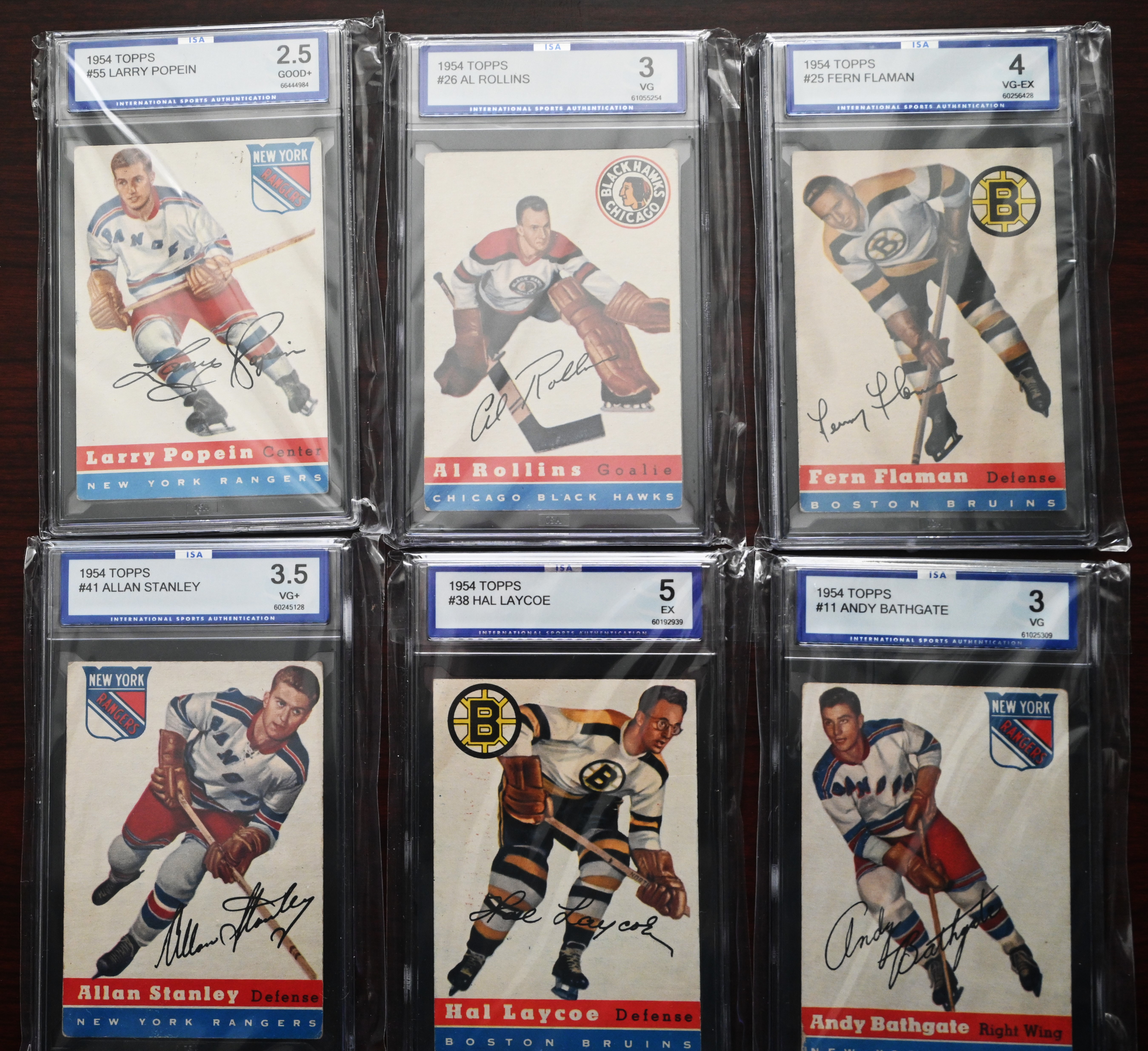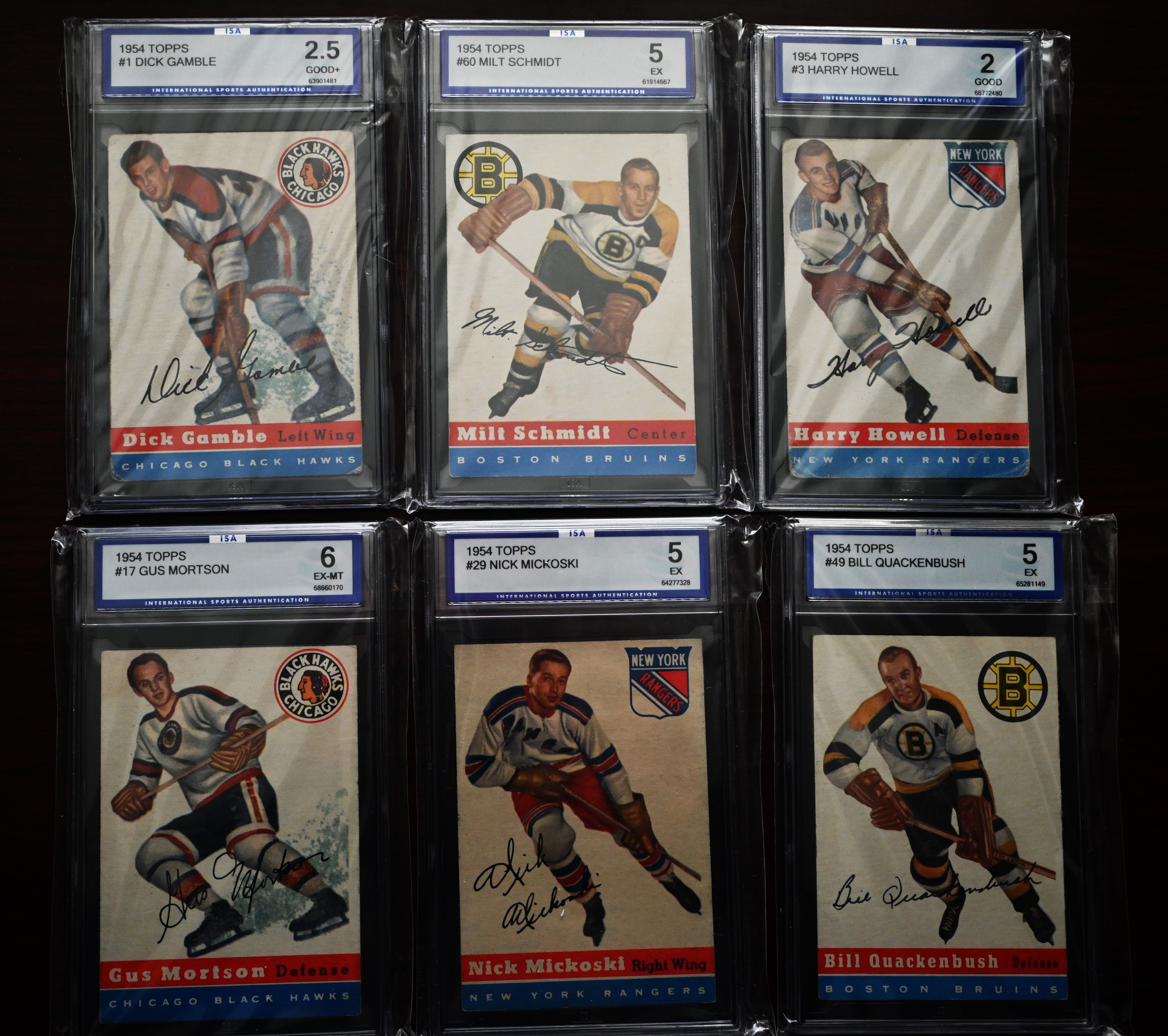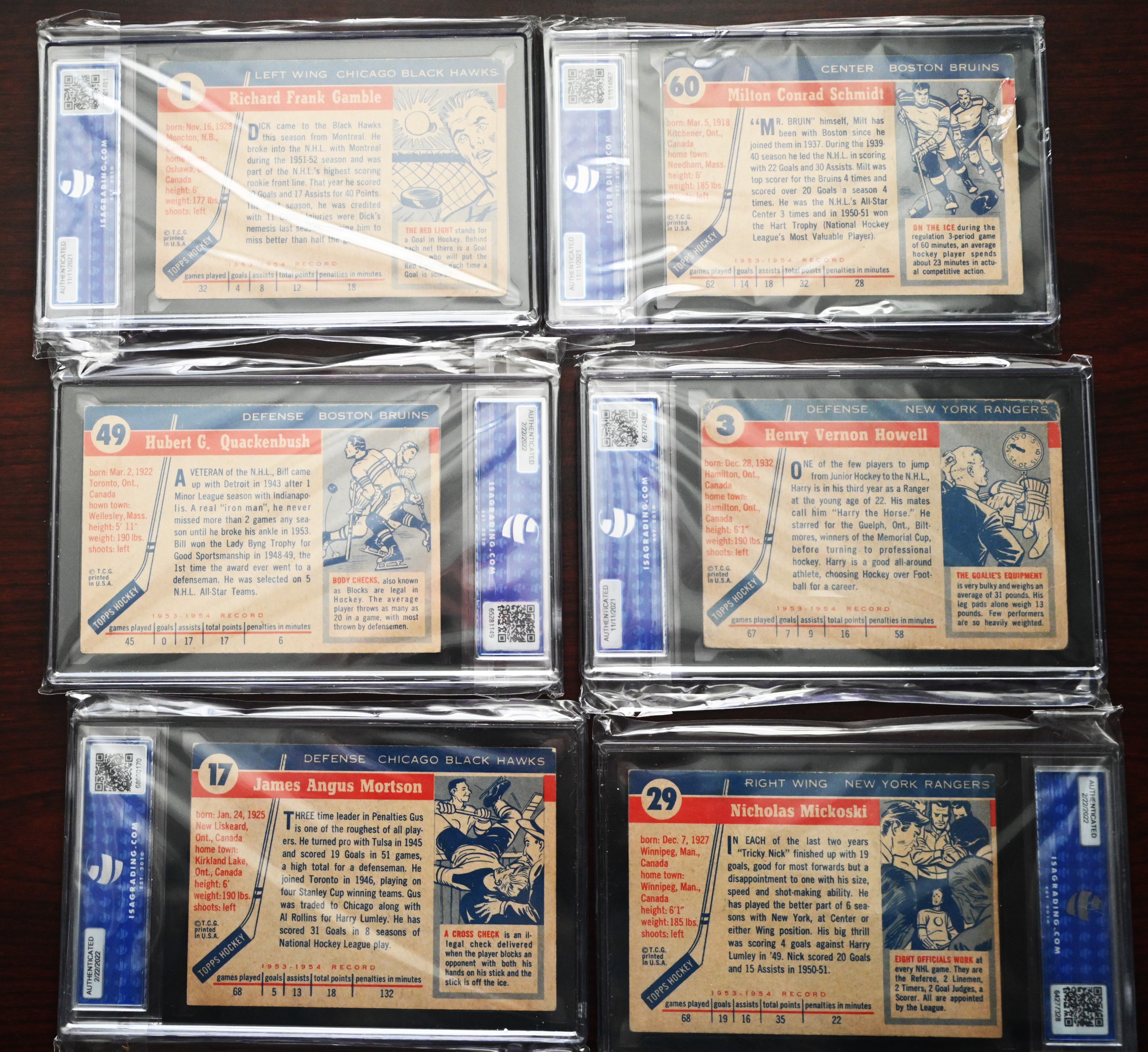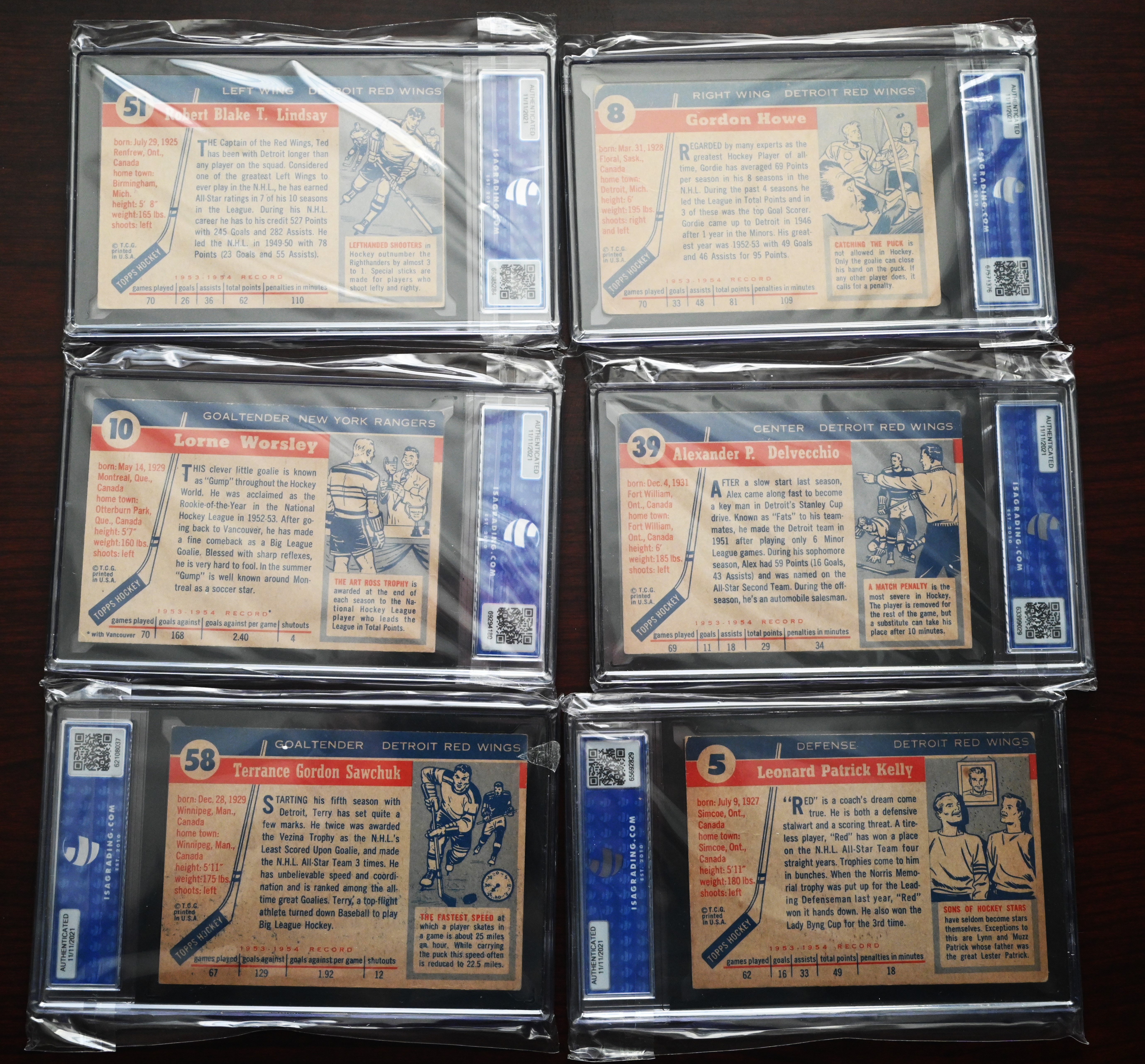 Rare complete set of 1954 Topps Hockey cards to include several Hall Of Famers including Gordie Howe, Terry Sawchuck, Alex Delvecchio, Red Kelly, Harry Howell, Gump Worsley, Ted Lindsey, Milt Schmidt and Dick Gamble. Half the cards are ISA graded and half are in unopen packages which may be in excellent condition.