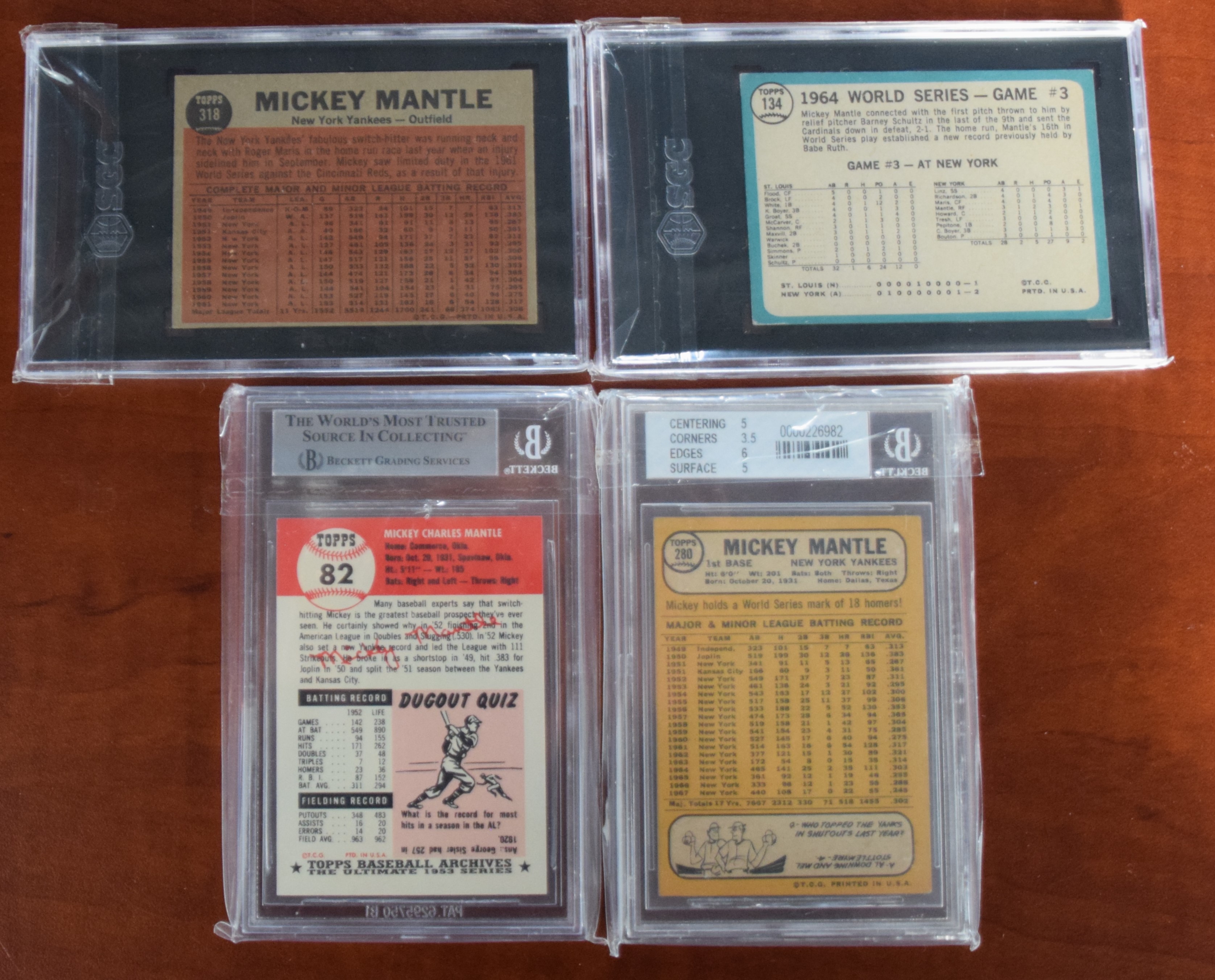 Four Topps Mickey Mantle Baseball Cards including 1962 “The Switch Hitter Connects” card # 318 (PSA grade 5), Mantle 1965 World Series Clutch Home Run card # 134 (PSA grade 5.5), 1968 Mickey Mantle card #280 (PSA grade 4) and 1991 Topps archive-1953 Mickey Mantle card # 82 (PSA grade 8.5)
