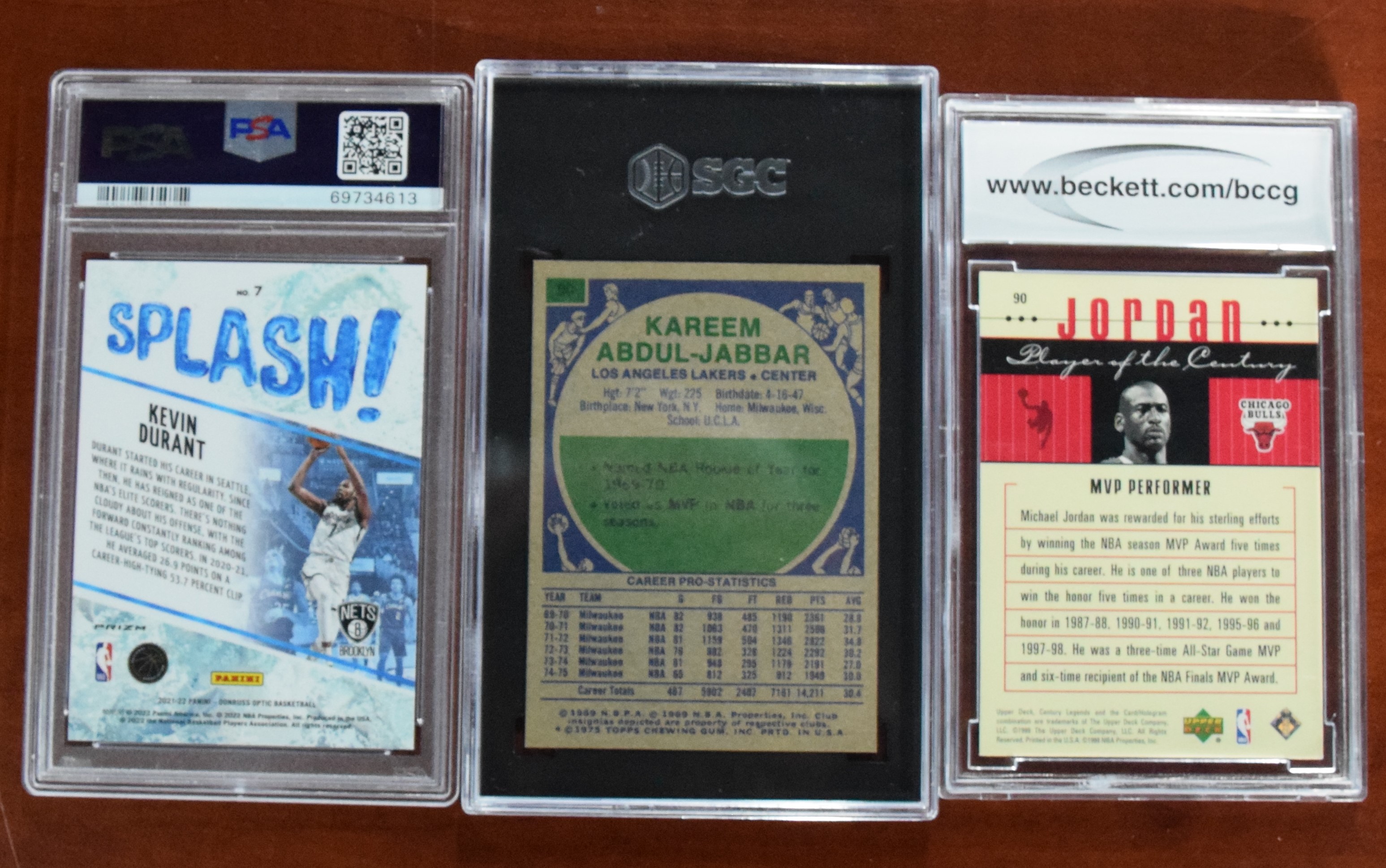 Three NBA Basketball card greats including a 1975-76 Topps Kareem Abdul Jabbar card # 90 (Graded 7), 1999 Upper Deck Legends, Michael Jordan card # 90 (Graded 10), and 2021 Kevin Durant Splash Purple card #7 (Graded 10)