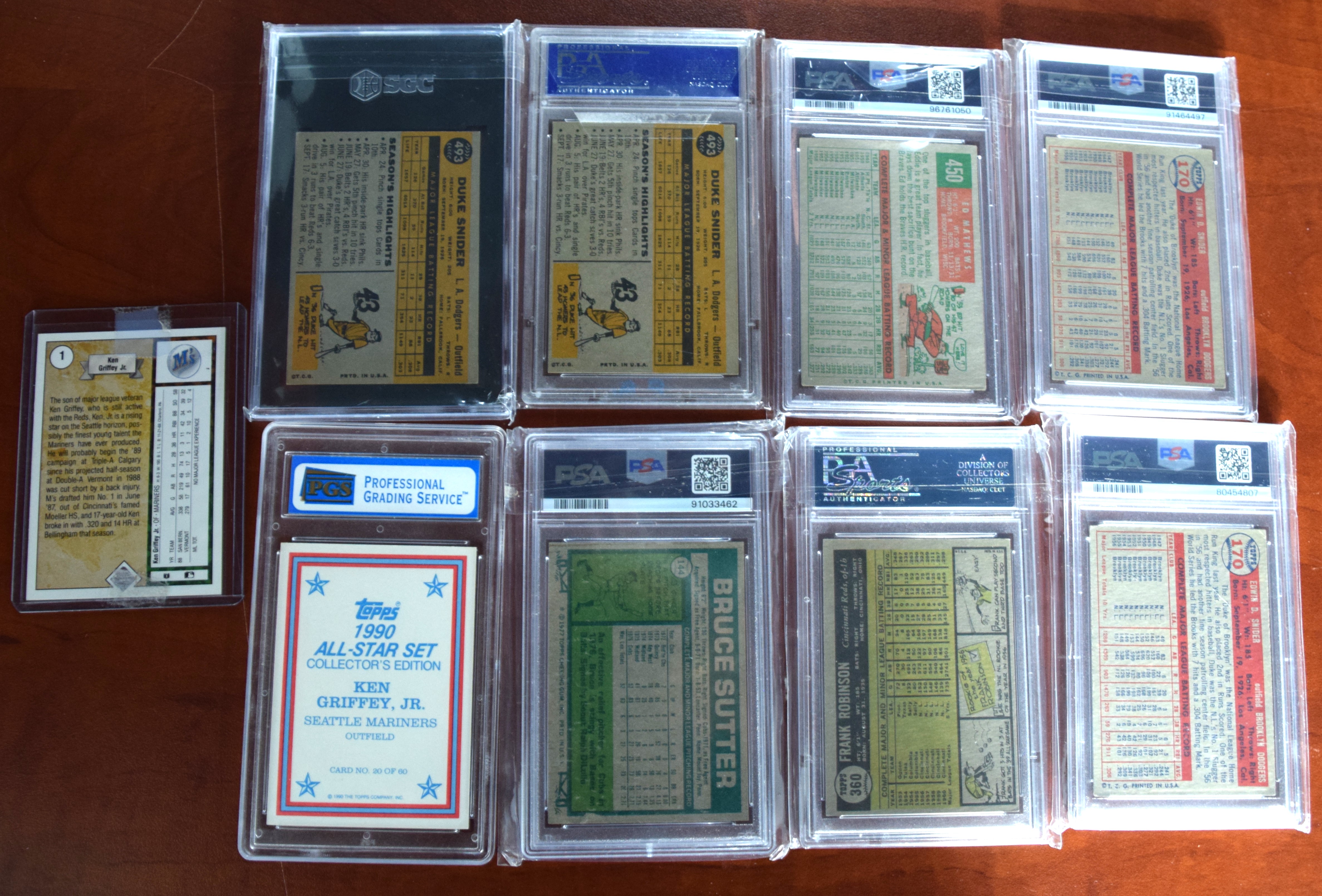 Nine Hall Of Fame baseball cards to include two Topps 1957 Duke Snider, Brooklyn Dodgers, card # 170 (PSA grades 3.5 and 4.0); 1959 Topps Ed Mattews, Milwaukee Braves, card # 450 (PSA grade 3); two 1960Topps Duke Snider, card 493 (PSA grade 5.5 and 6); 1961 Frank Robinson, Cincinnati Reds, card #360 (PSA grade 6); 1977 Topps Bruce Sutter, Chicago Cubs, card # 144 (PSA grade 4); 1990 Ken Griffy Jr Allstar Glossy, Topps card #20 (PSA grade 9); and one other ungraded Ken Griffy card