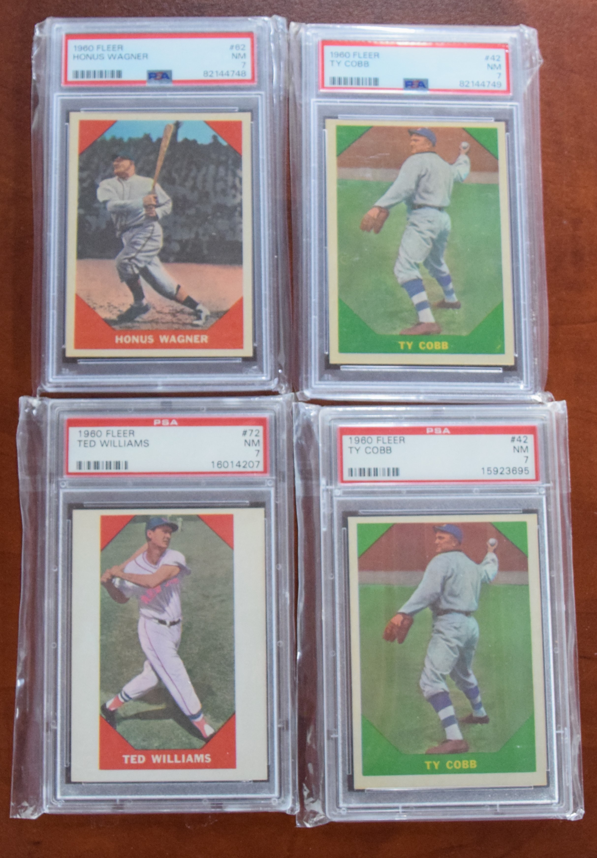 Four Fleer baseball cards to include two 1960 Ty Cobb card #42 (PSA grade 7), 1960 Honus Wagnor card #62 (PSA grade 7), 1960 Ted Williams card# 72 (PSA grade 7)