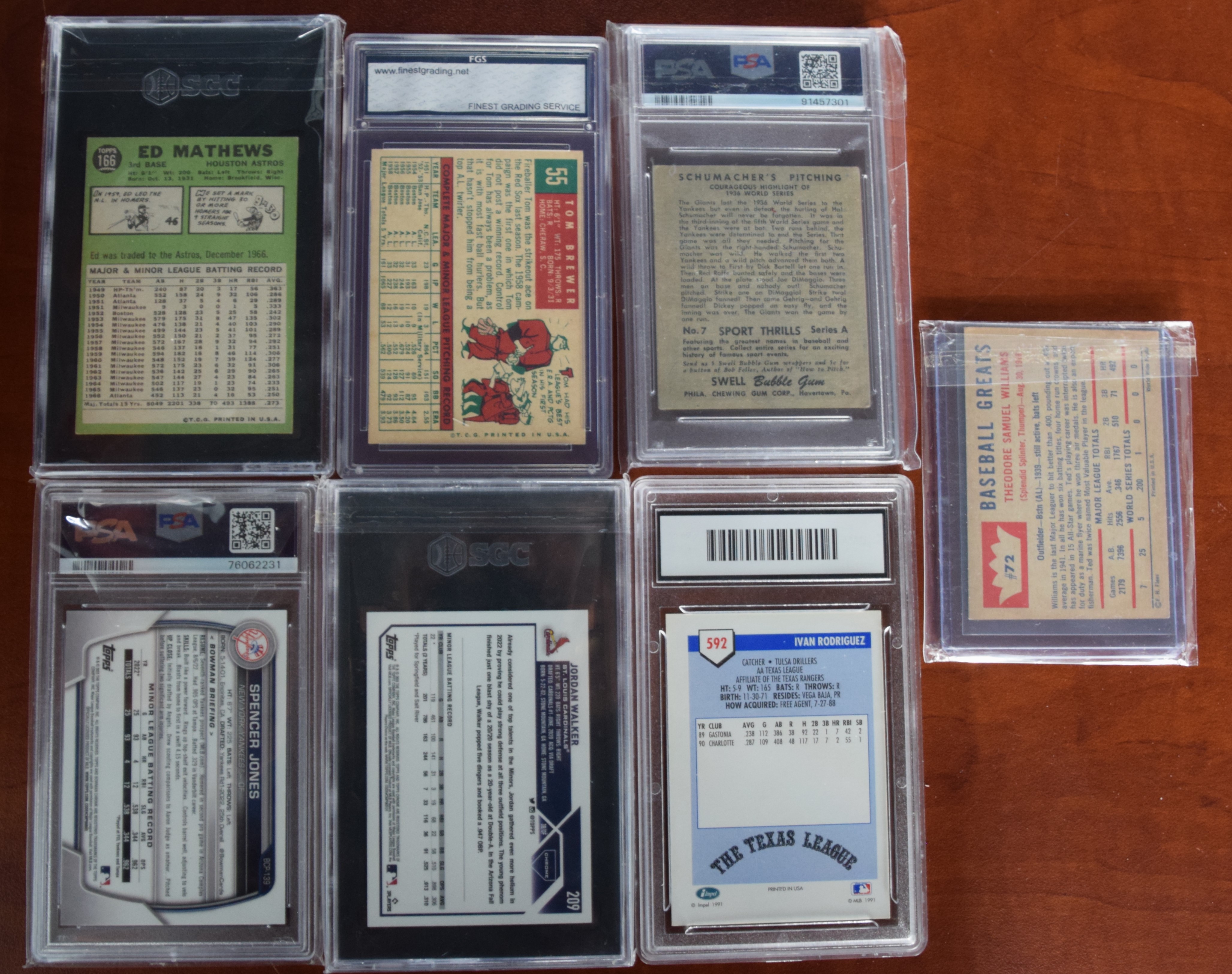 Assorted lot of 7 baseball cards to include a Fleer Baseball Greats Ted Williams, card # 72, 1948 Hal Schumacher “Never Say Die Pitcher” card #7, (PSA Gr4aded 2), 1959 Topps Tom Brewer, Boston Red Sox card # 58 (PSA grade 9.5), 1967 Topps Ed Matthews, Houston Astros, card # 166 (Graded 6), 1991 Ivan Rodriquez rookie card (graded 8.5), 2023 Topps Chrome Jordan Walker card # 209 (graded 9.5), and 2023 Bowman Spencer Jones Chrome Prospects(Graded 9)