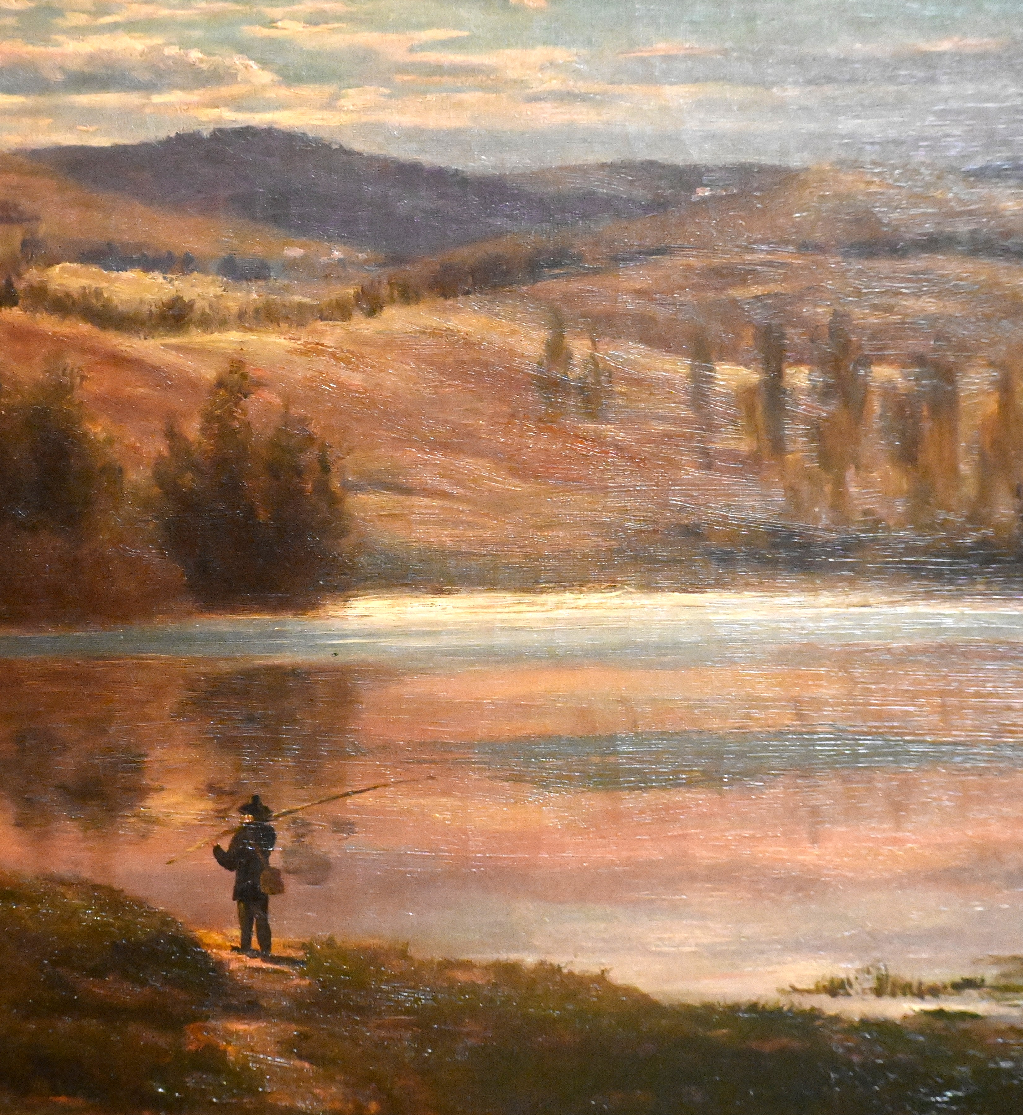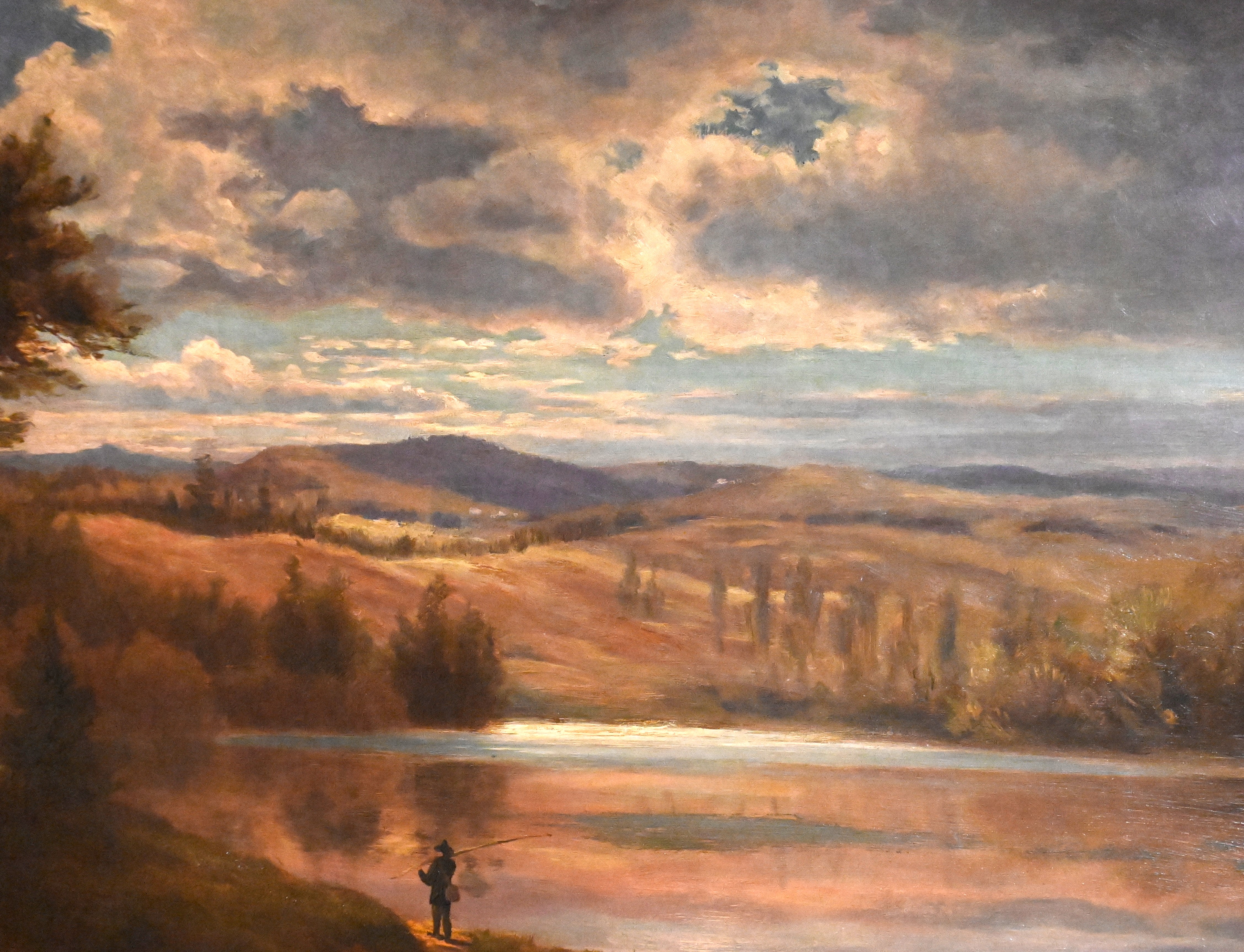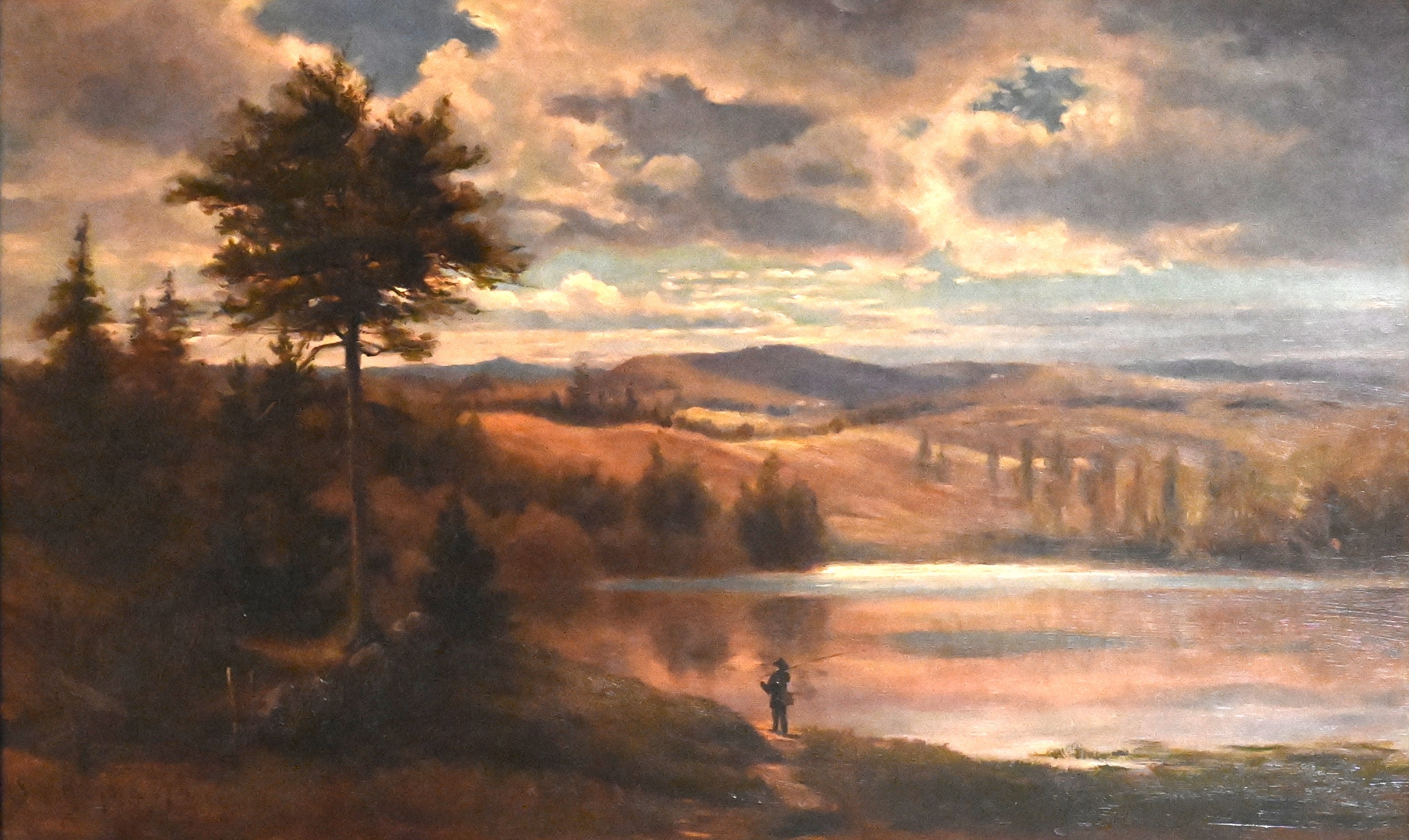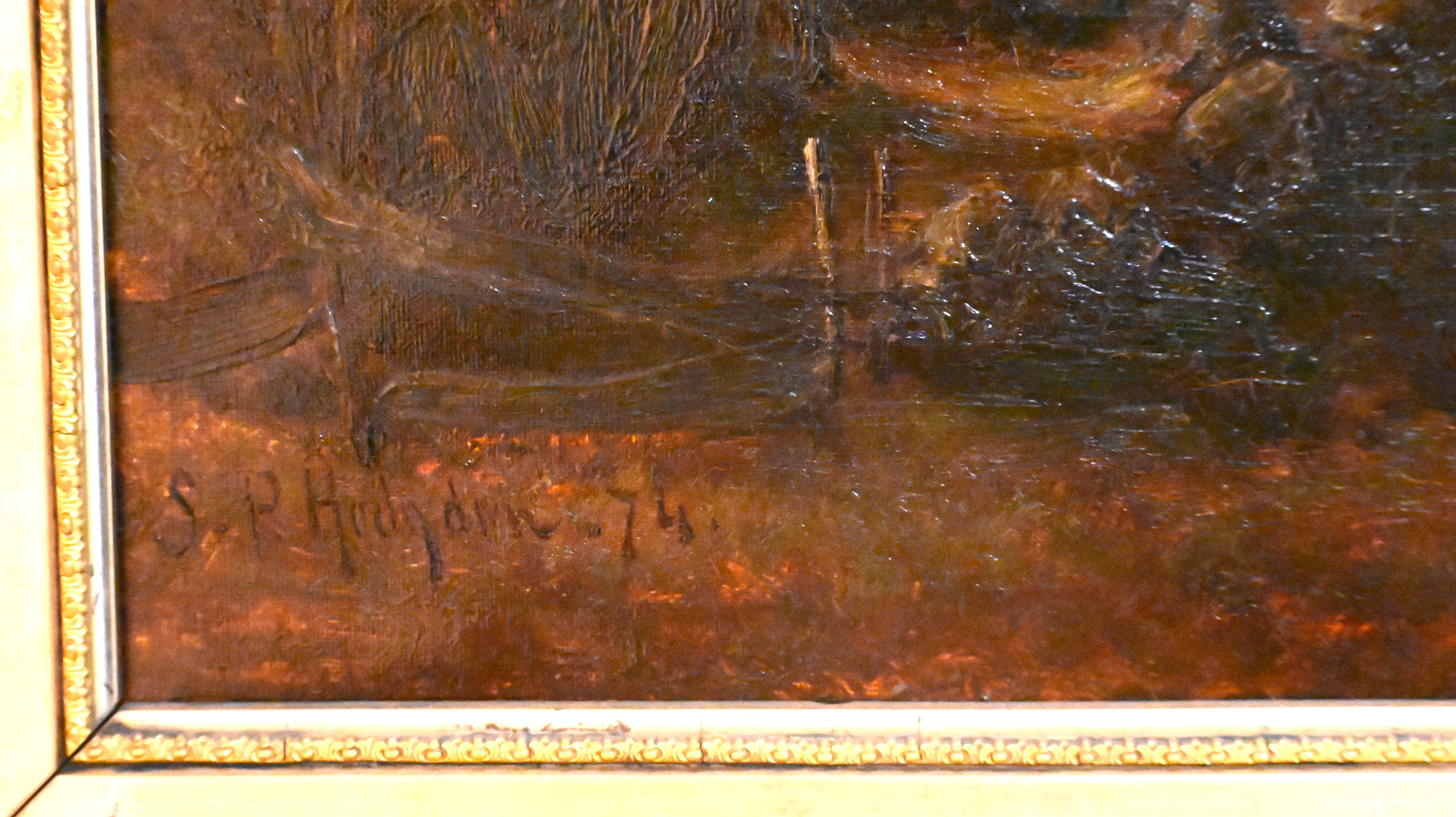 Framed oil on canvas of a White Mountain scene signed by S.P. Hodgdon 1874 lower left, depicting a lake, fisherman, fields and trees. Sylvester Phelps Hodgdon (1830 – 1906) worked in Maine and Massachusetts and is known for White Mountain landscapes and coastal scenes. Dimensions: 15″ x 25″ Image size