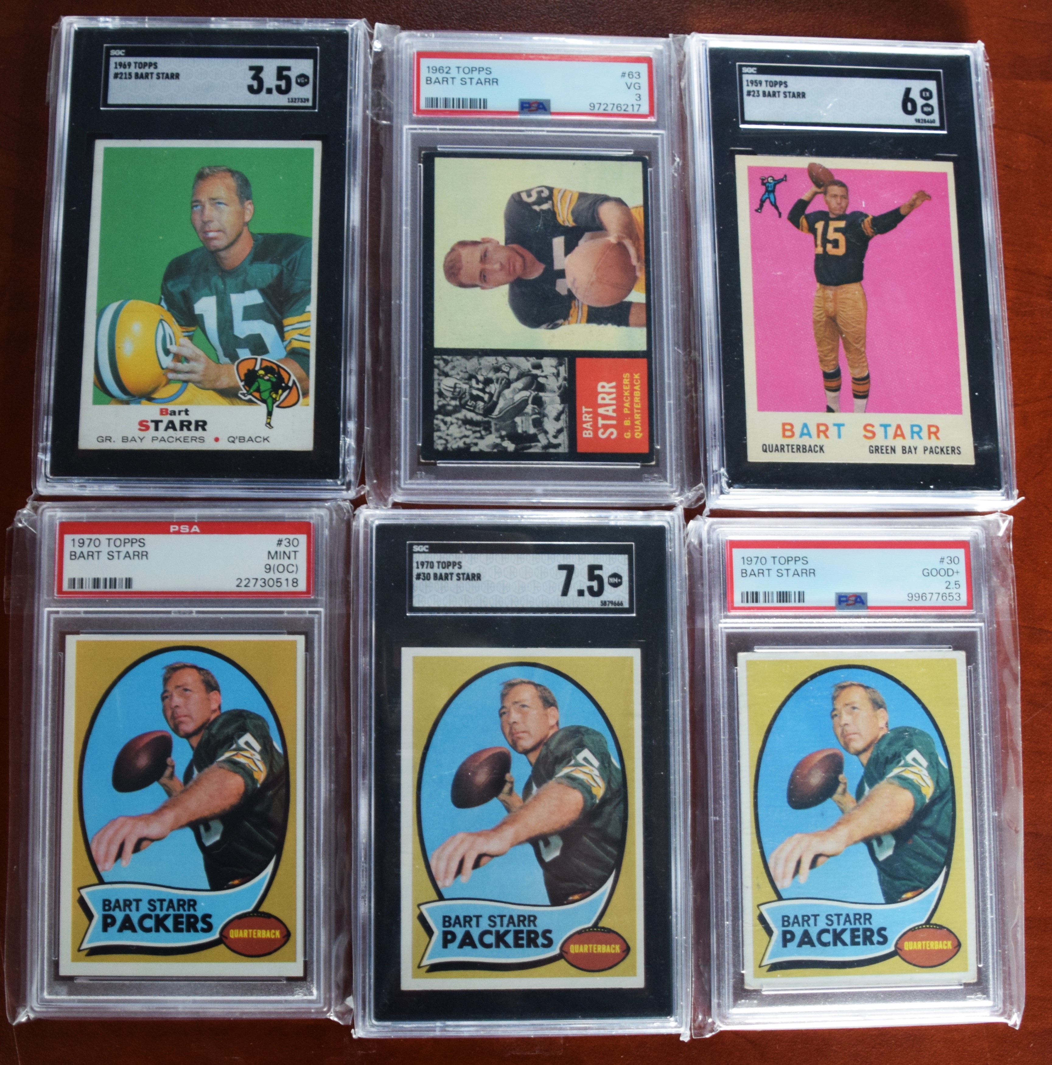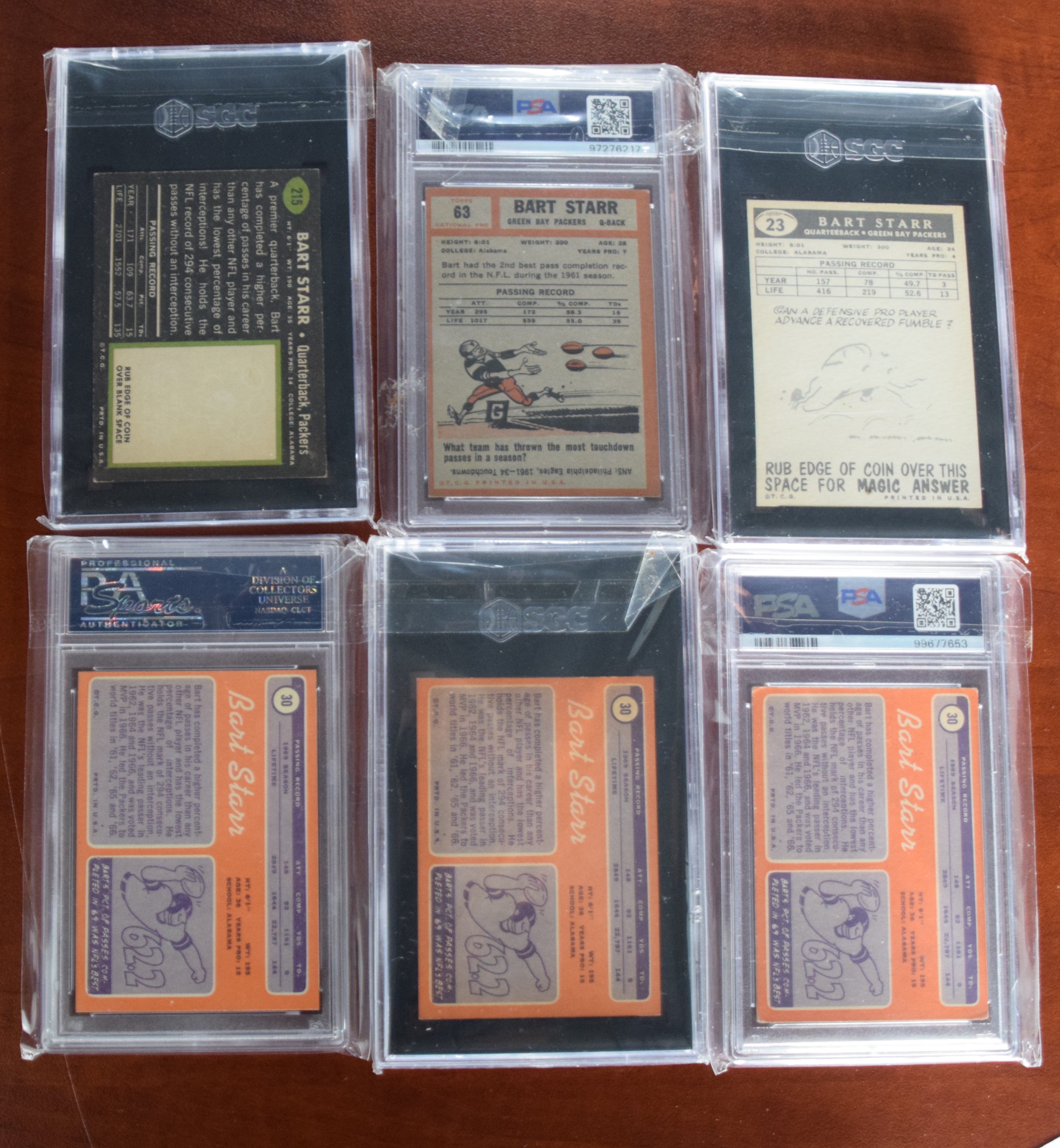 Topps Bart Starr football collection of 6 cards including 1959 card #23 (Graded 6), 1962 card #63 (Graded 3), 1969 card #215 (Graded 3.5) and three 1970 card #30 (Graded 3.5,7.5,9)
