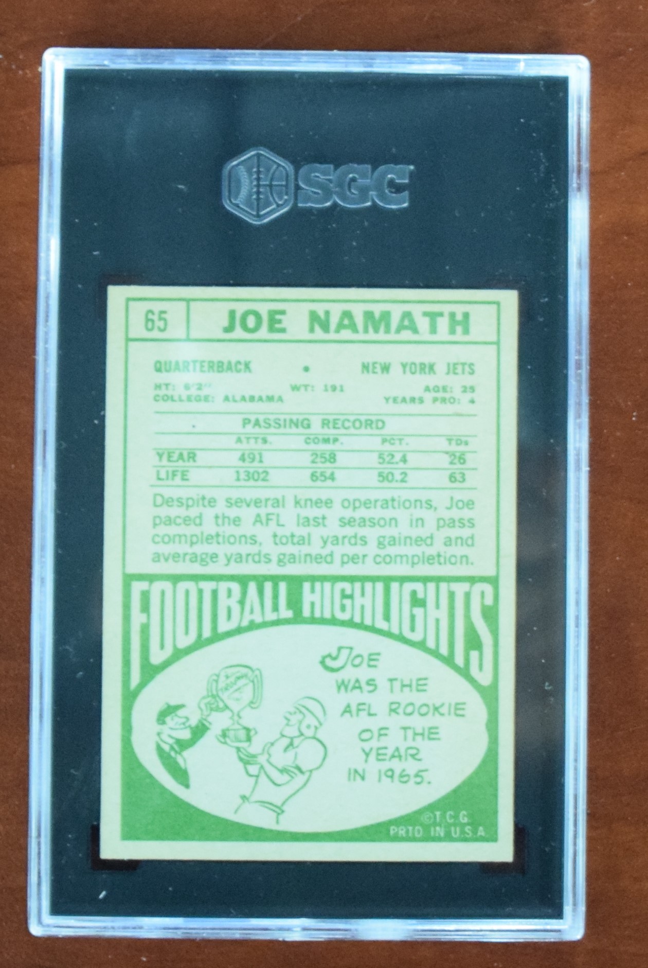 1968 Topps football card of Joe Namath, card #65 (Graded 7)