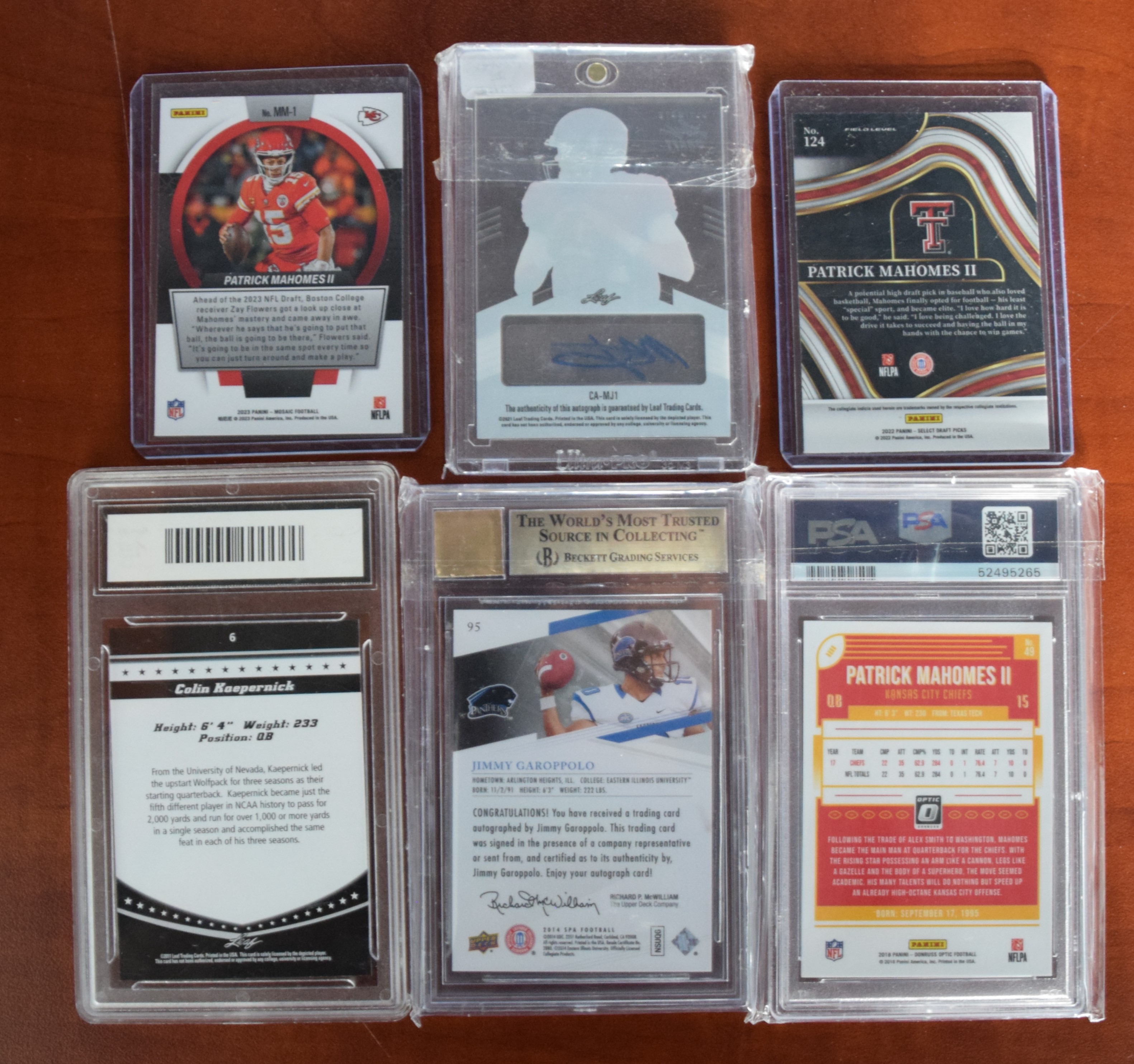 Six quarterback cards including 2018 Patrick Mahomes II card #49 (PSA grade 9) and two other Patrick Mahomes including one playing at Texas Tech, Mac Jones card 29/30, Colin Kaepernick rookie card #6 (Graded 10), and a Jimmy Garoppolo card # 95 (Graded 9.5)