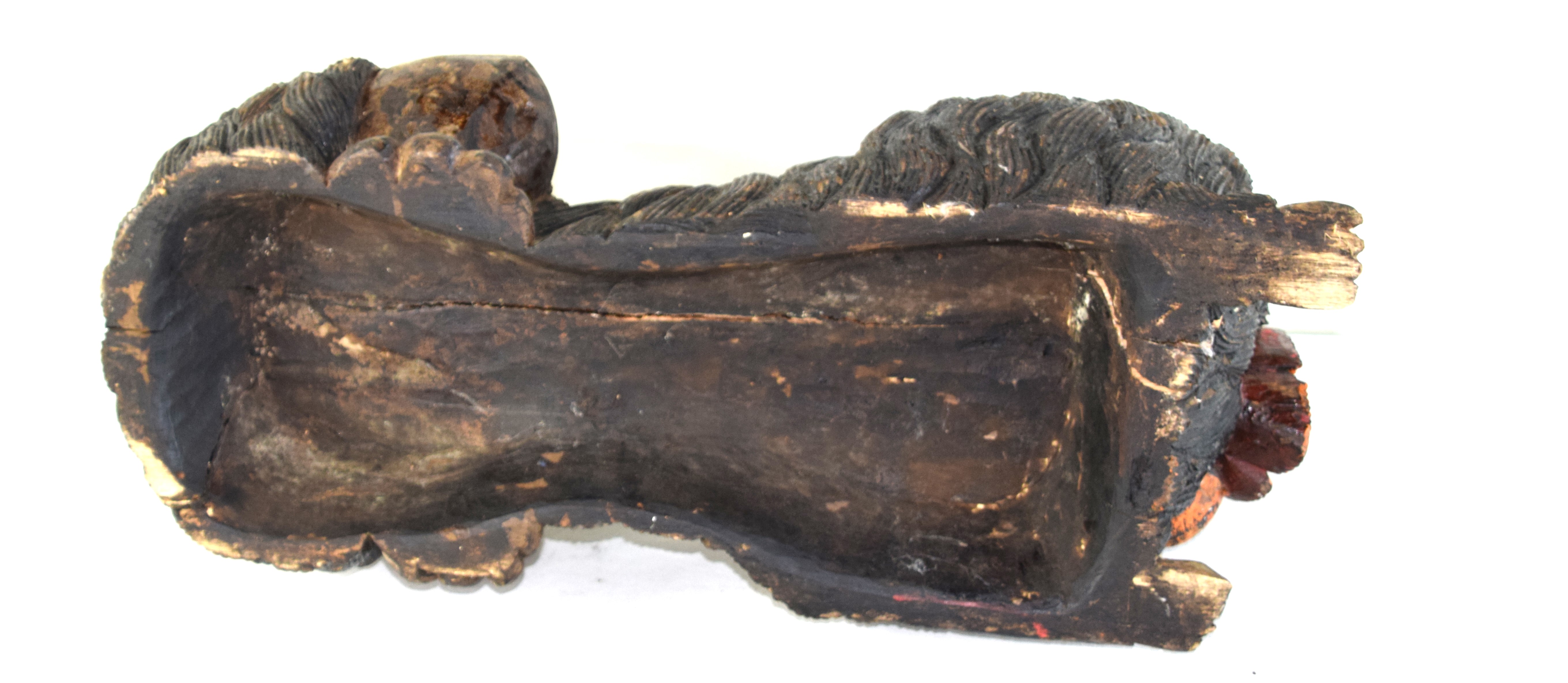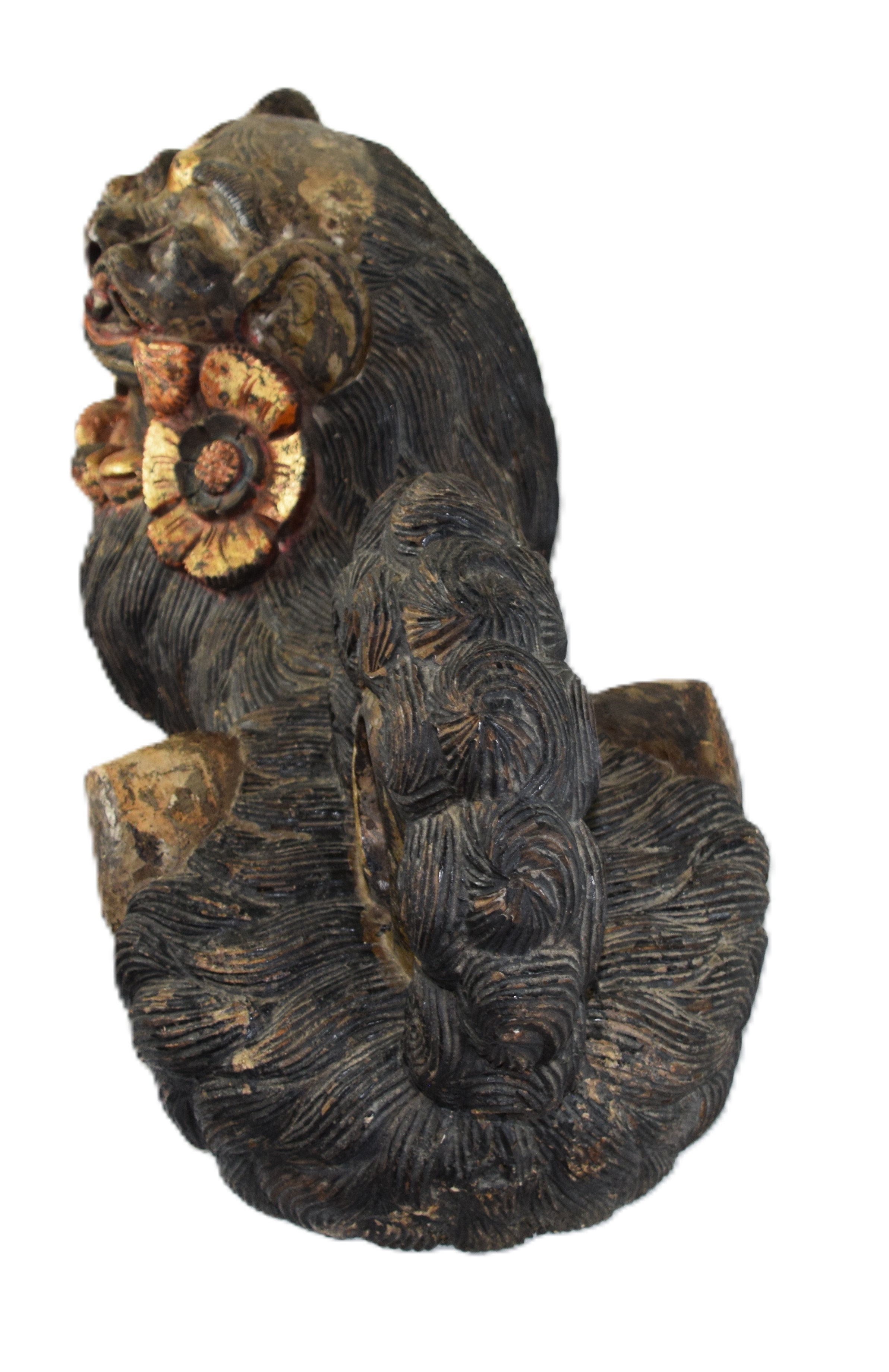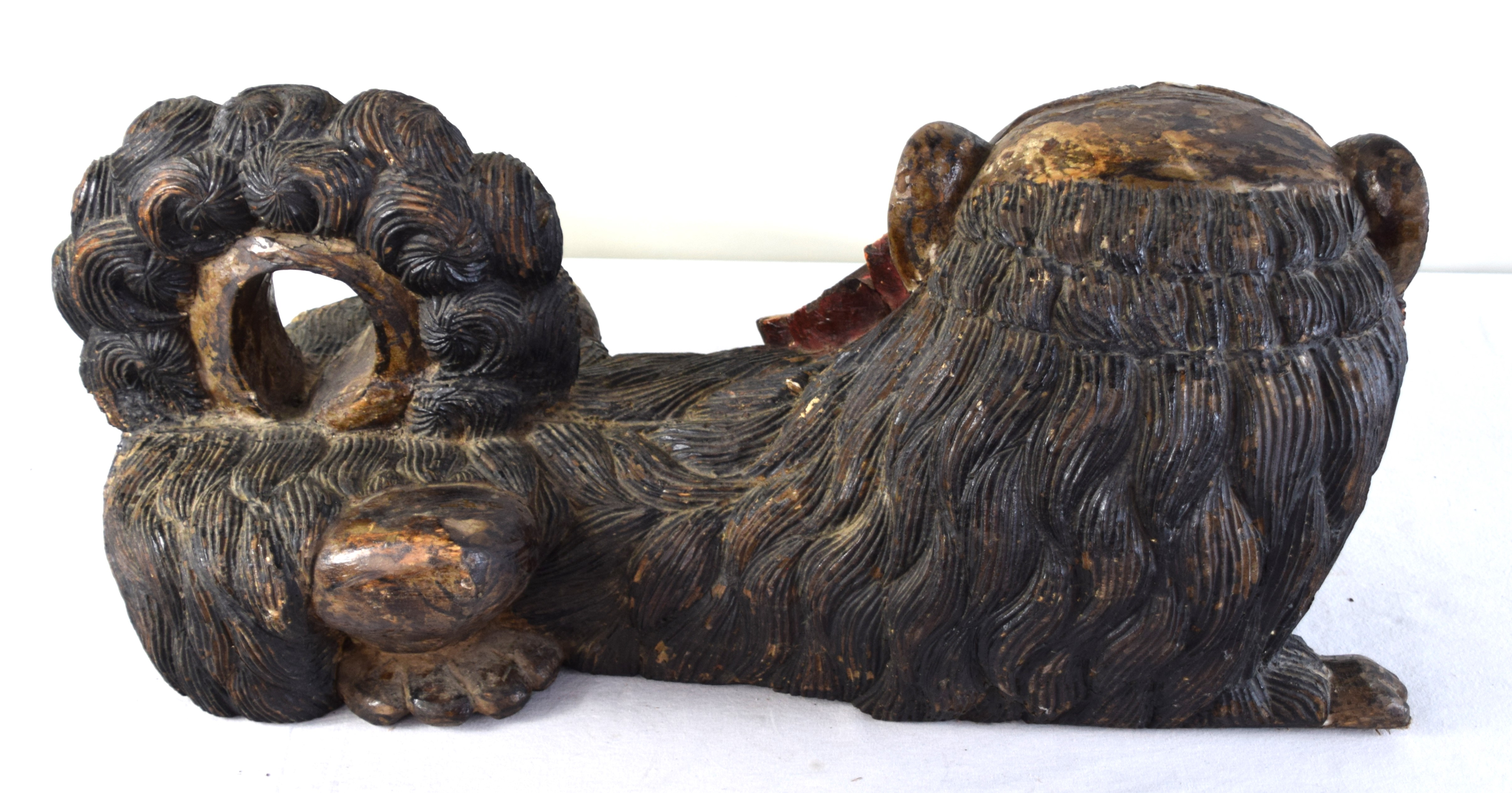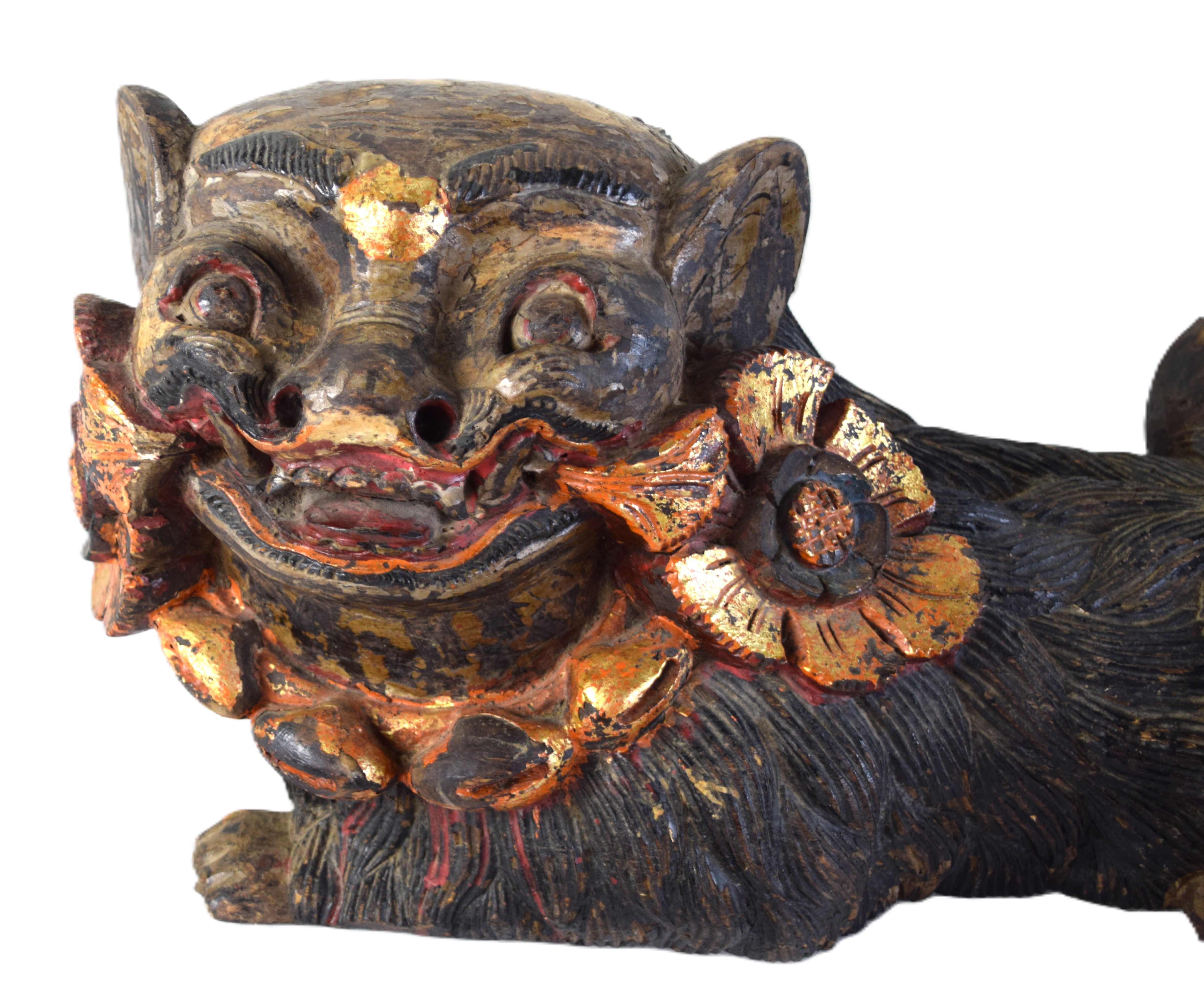 A large well carved, reclining wooden Foo Dog with gilt wood elements. Dimensions: 11″ H x 25″ L x 10″ W