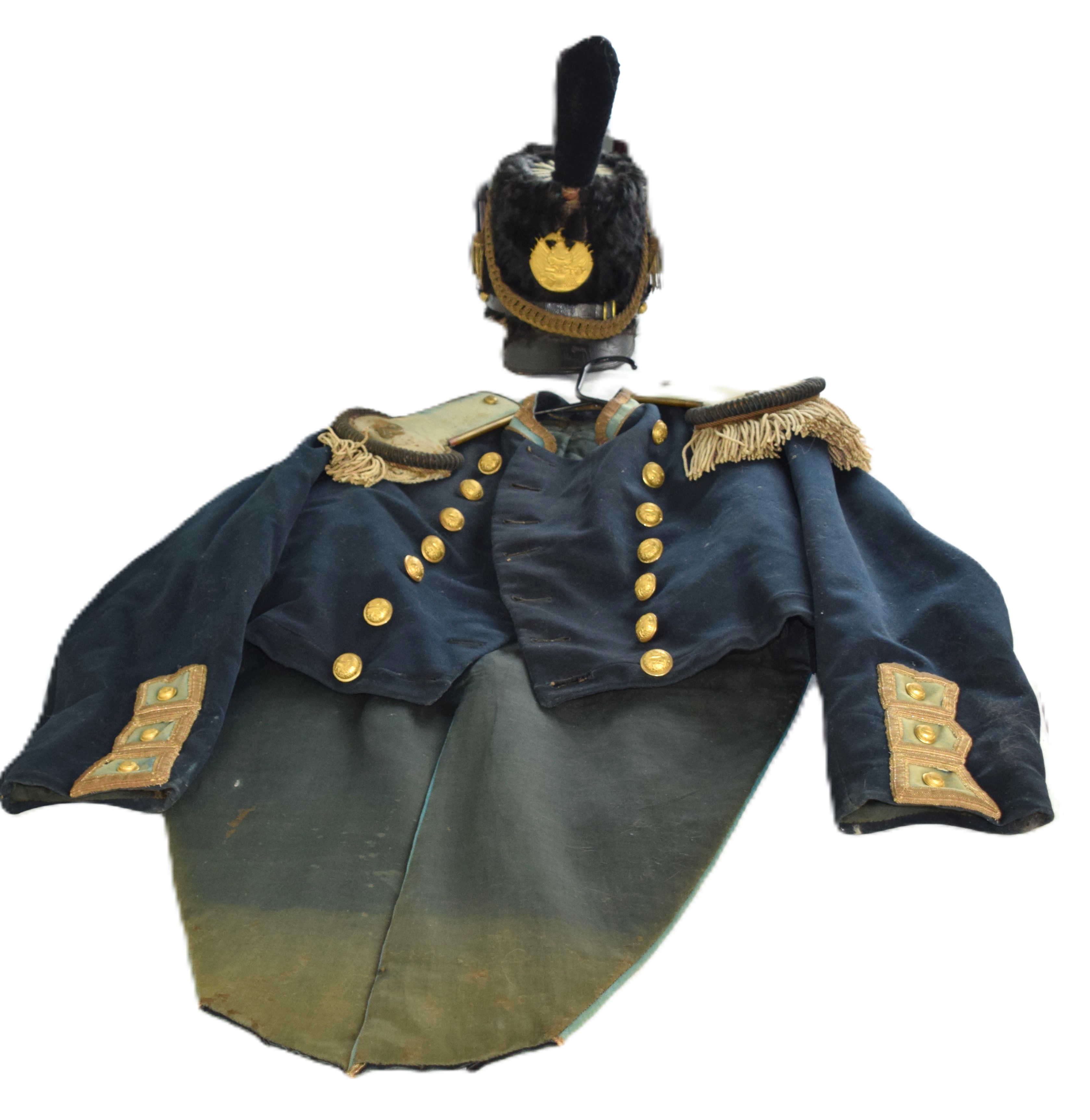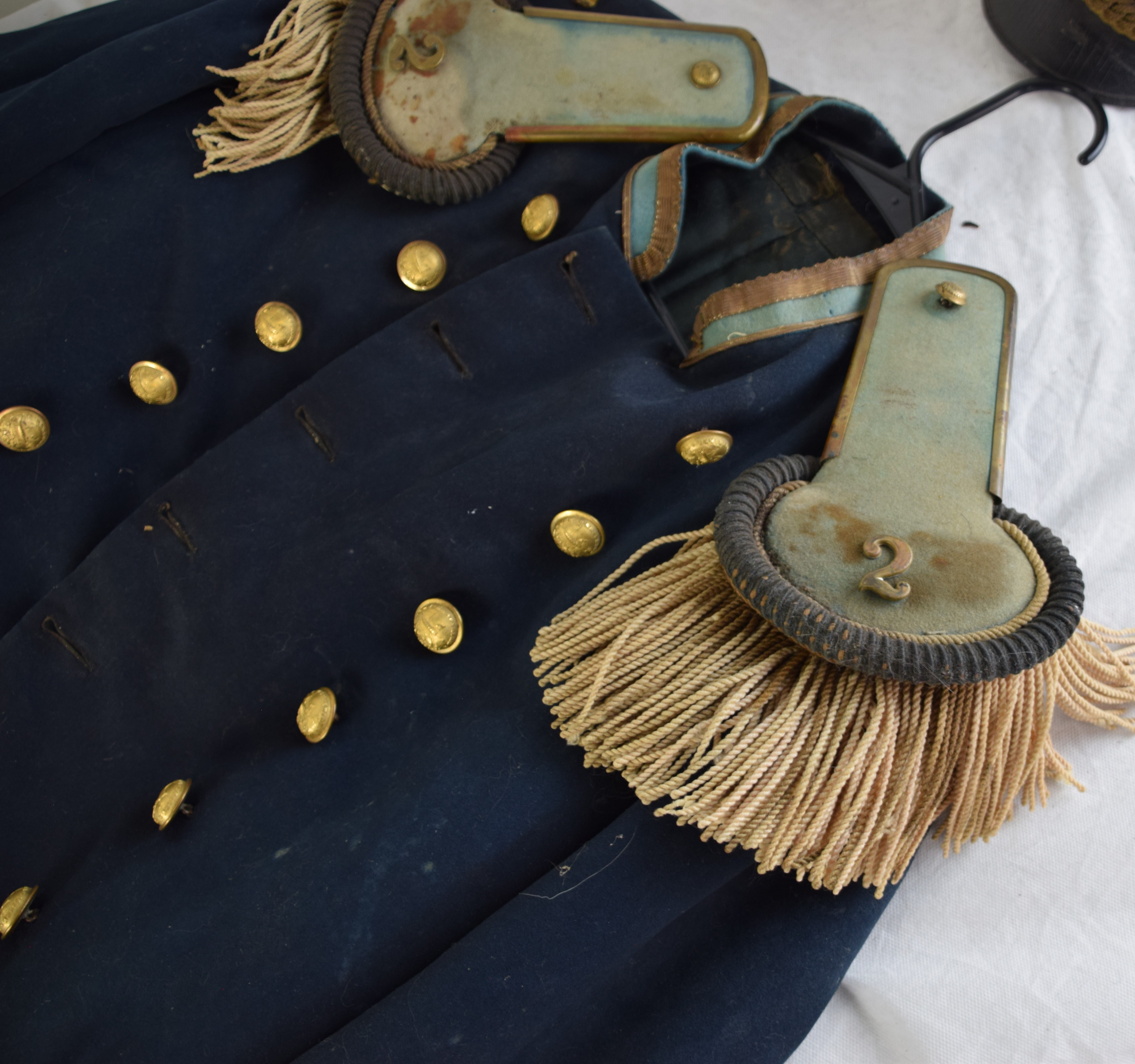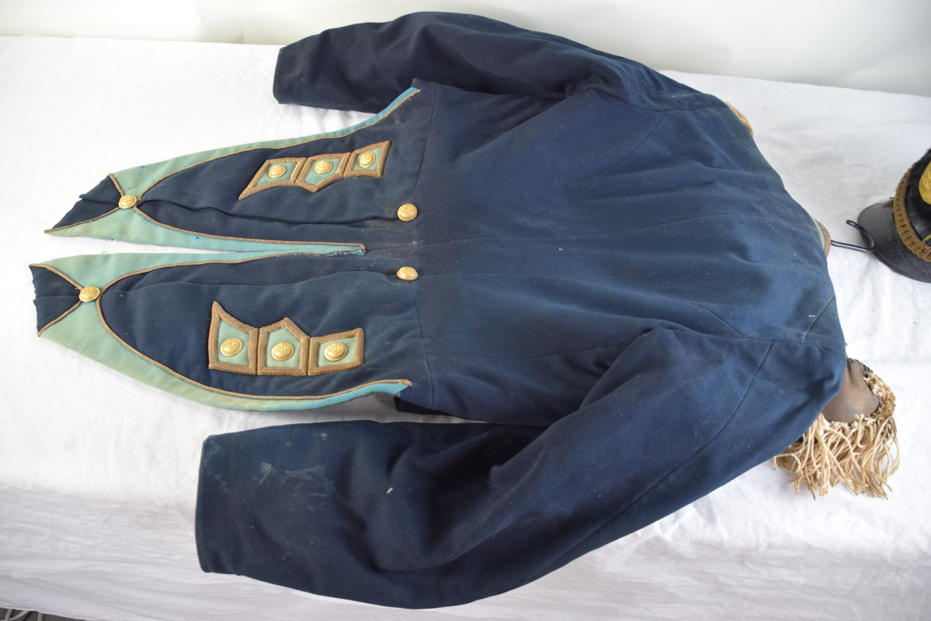 Post War of 1812 New Hampshire dress infantry jacket with 14 NH seal buttons, with 2nd Regiment epaulets and a rare full dress bucket hat with fancy emblem and feather covering.