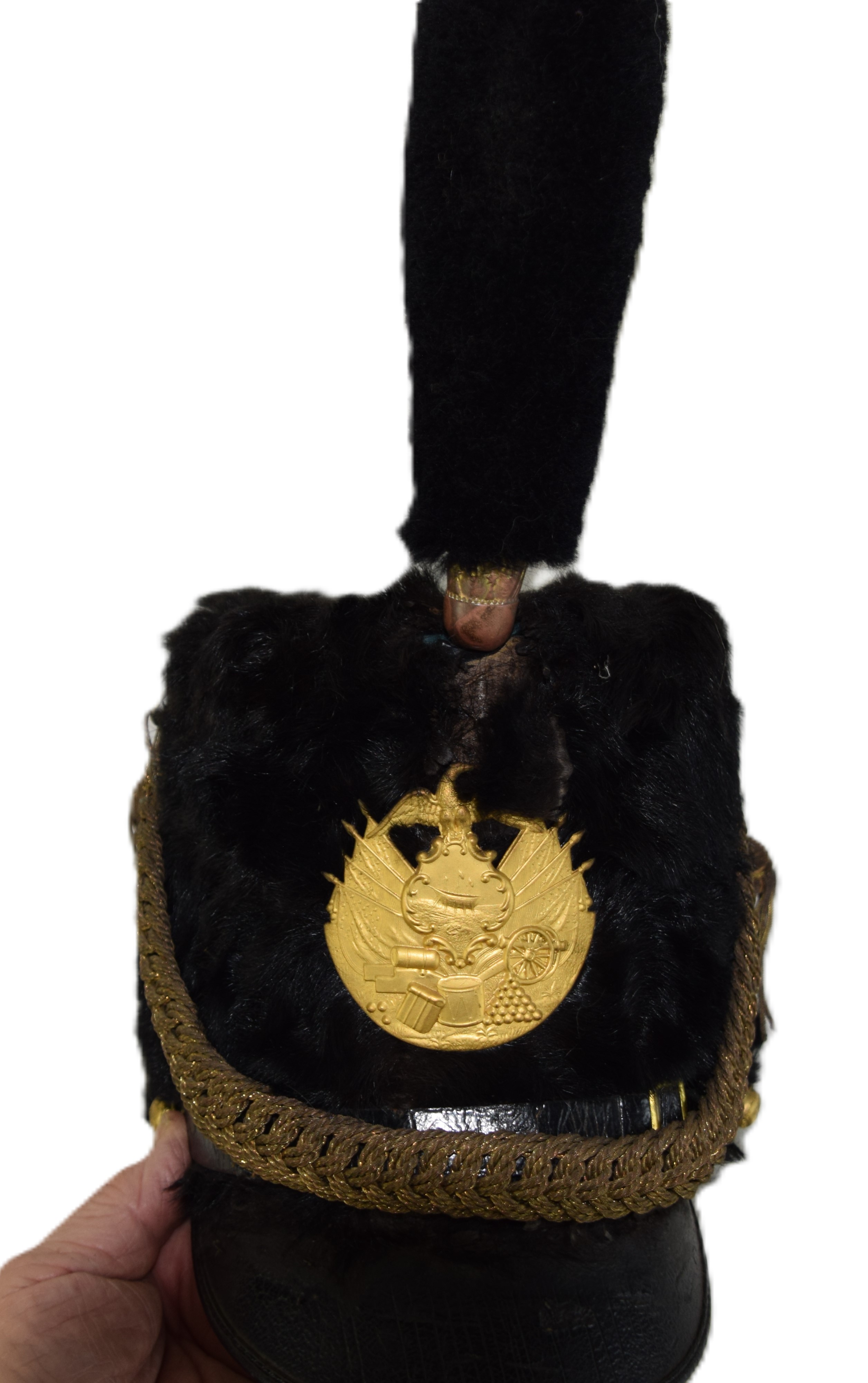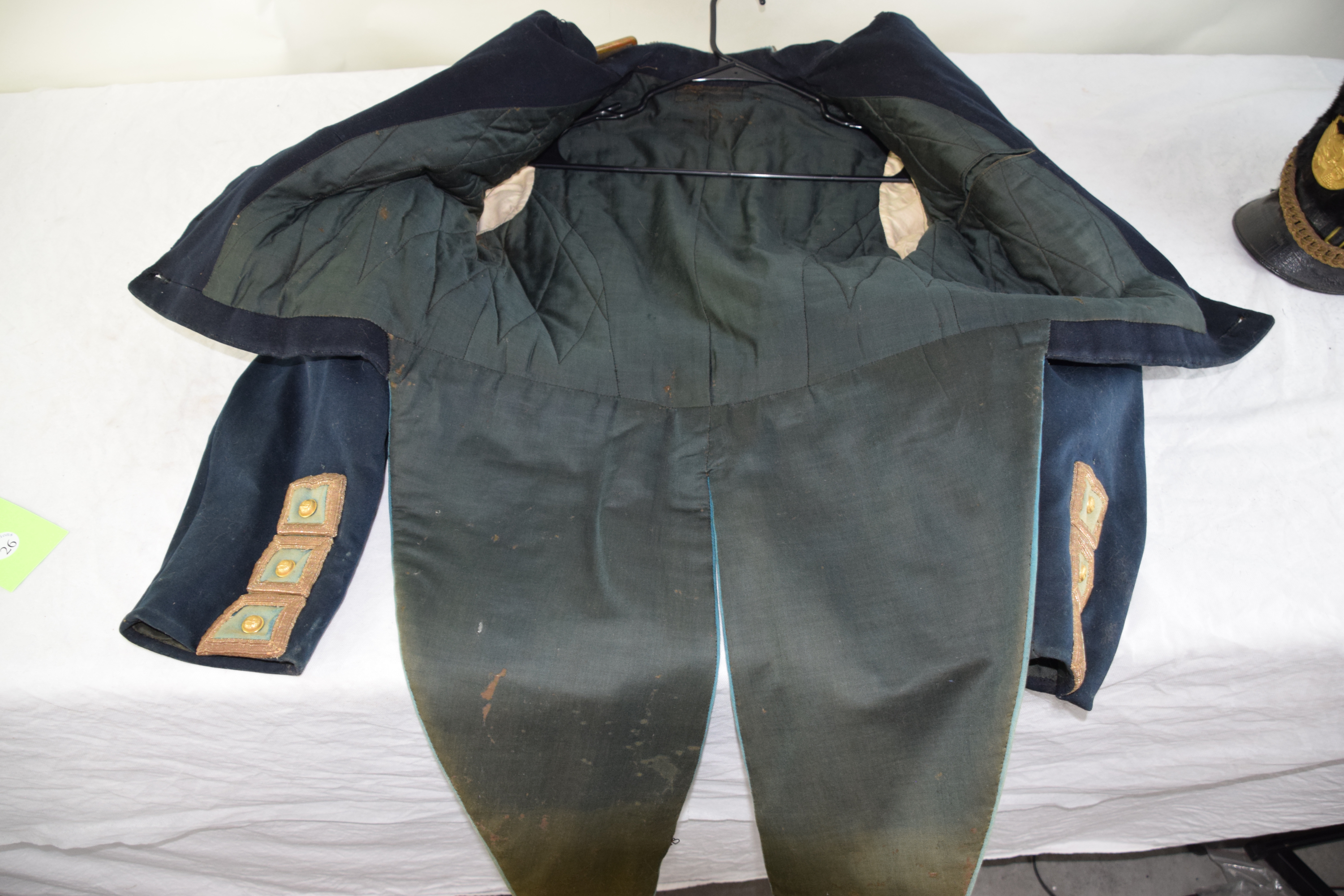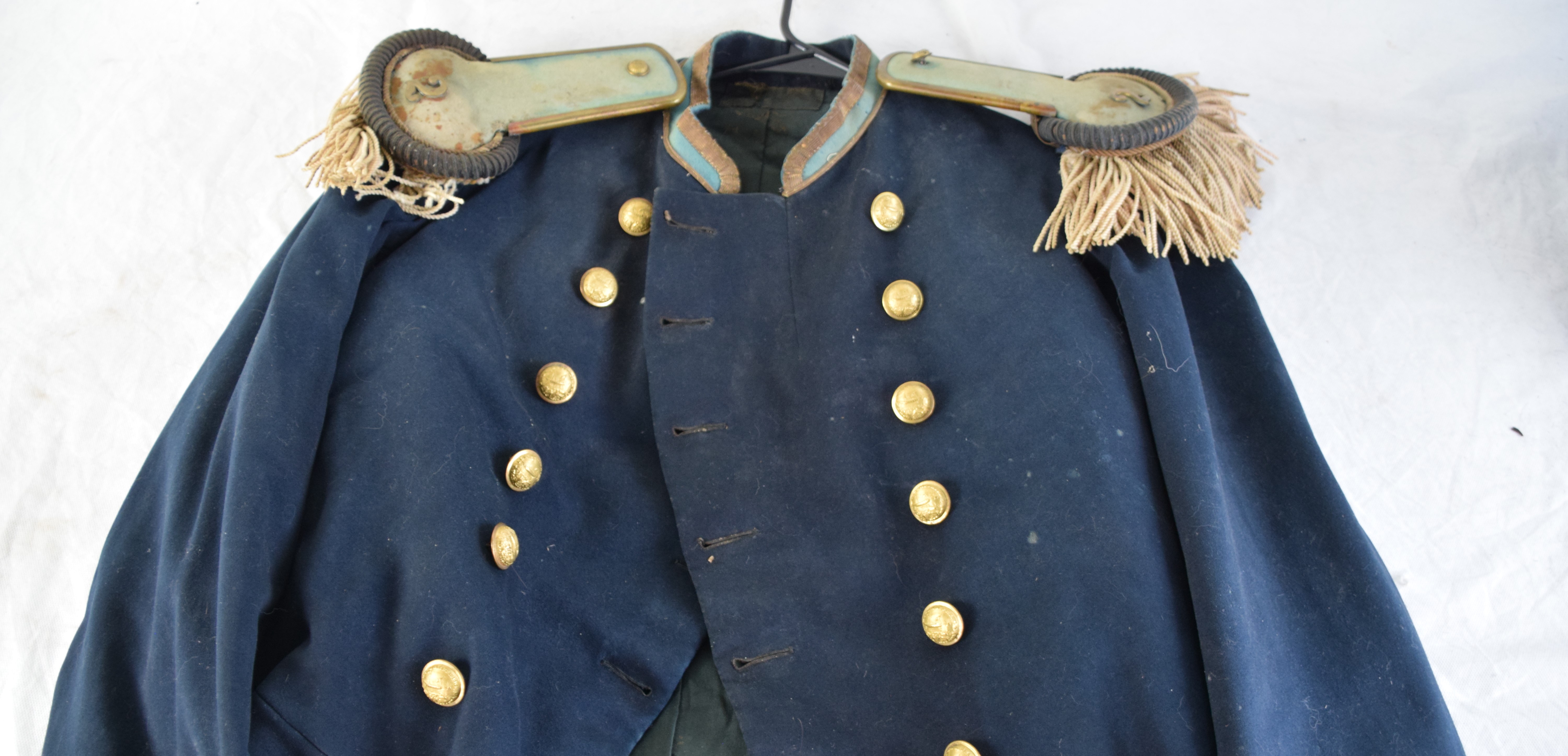 Post War of 1812 New Hampshire dress infantry jacket with 14 NH seal buttons, with 2nd Regiment epaulets and a rare full dress bucket hat with fancy emblem and feather covering.