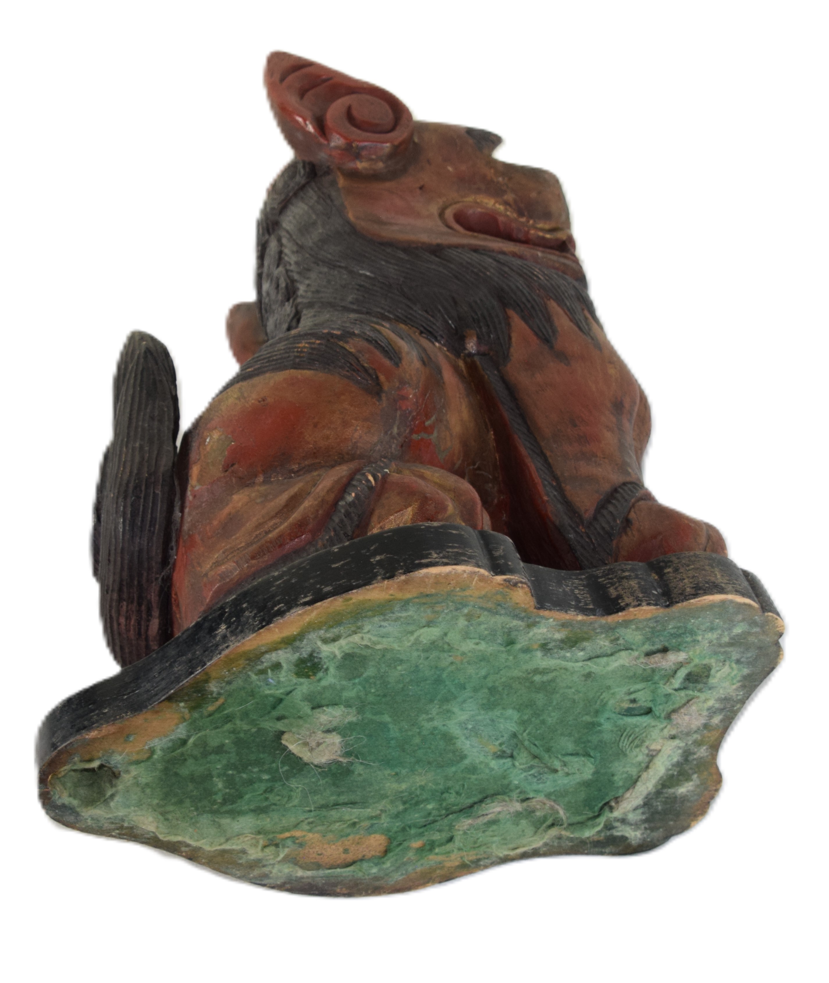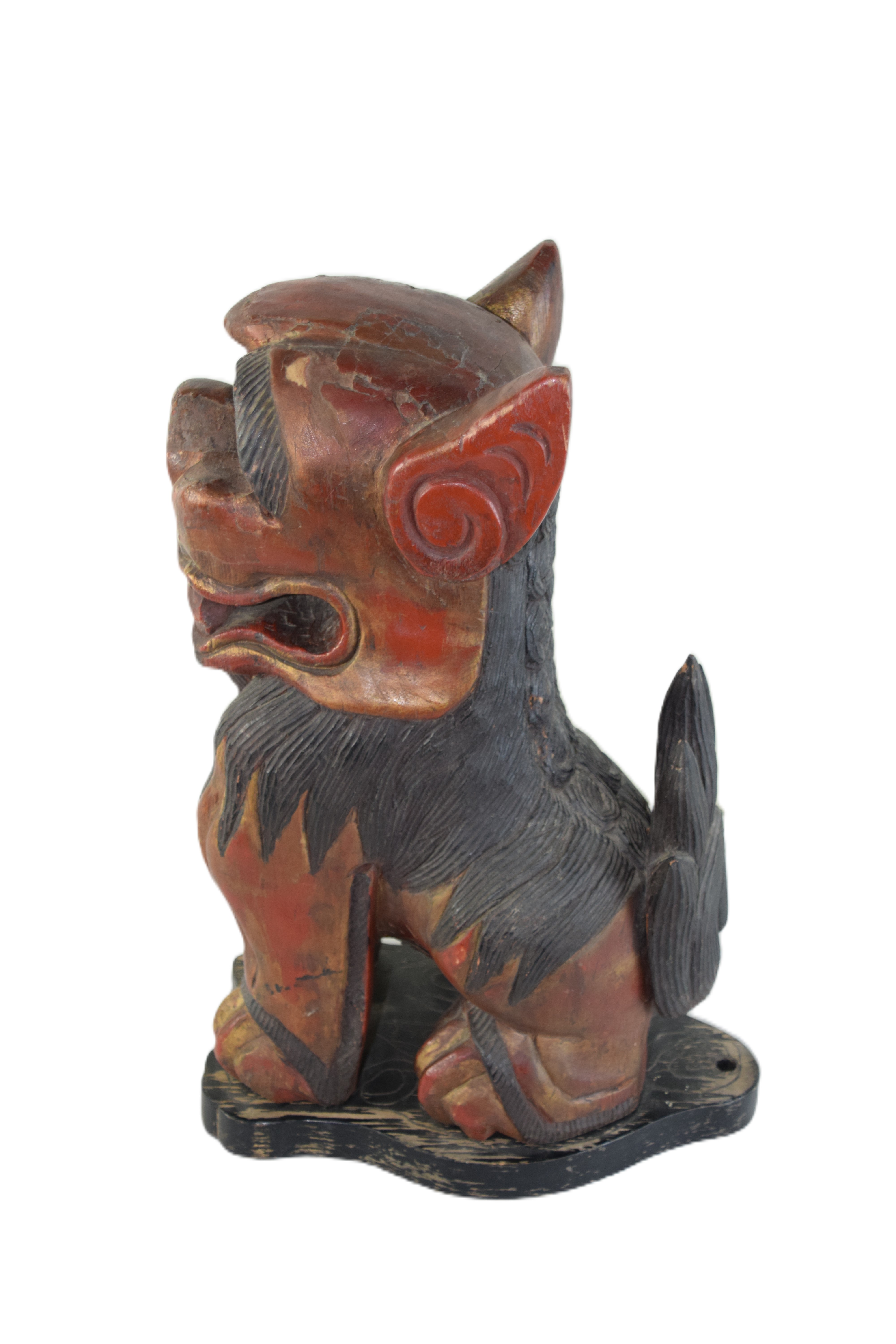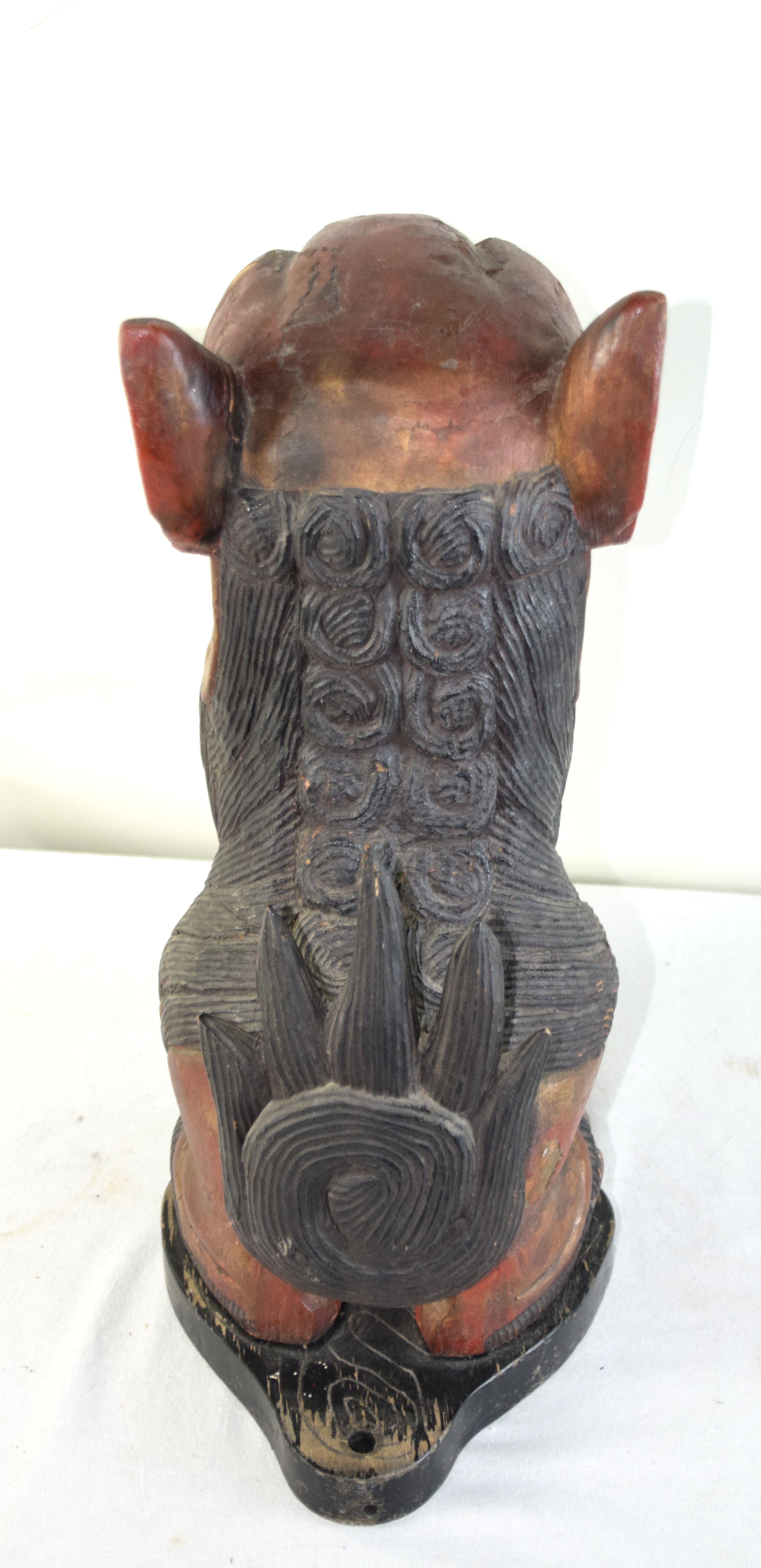 Large hand carved Chinese wooden Foo Dog in a seated position. Well carved. Dimensions: 19″ H x 13″ D x 8″ W