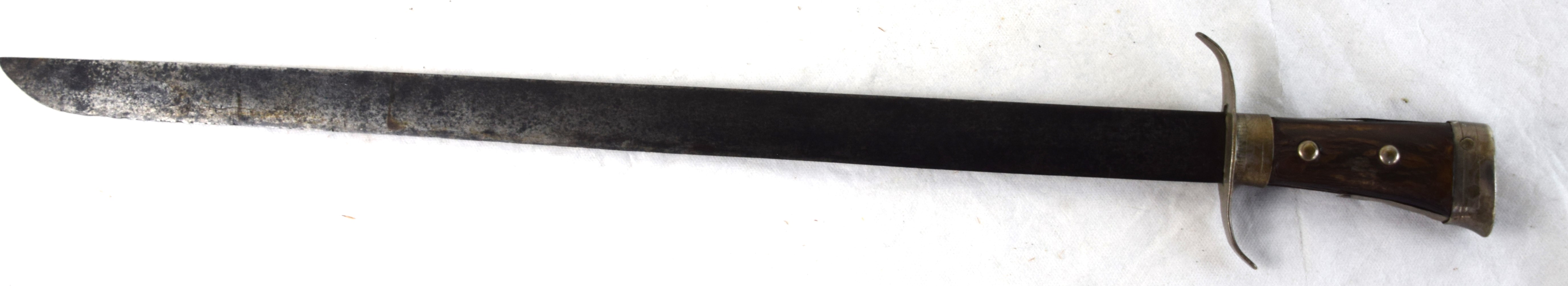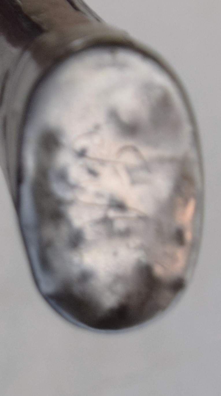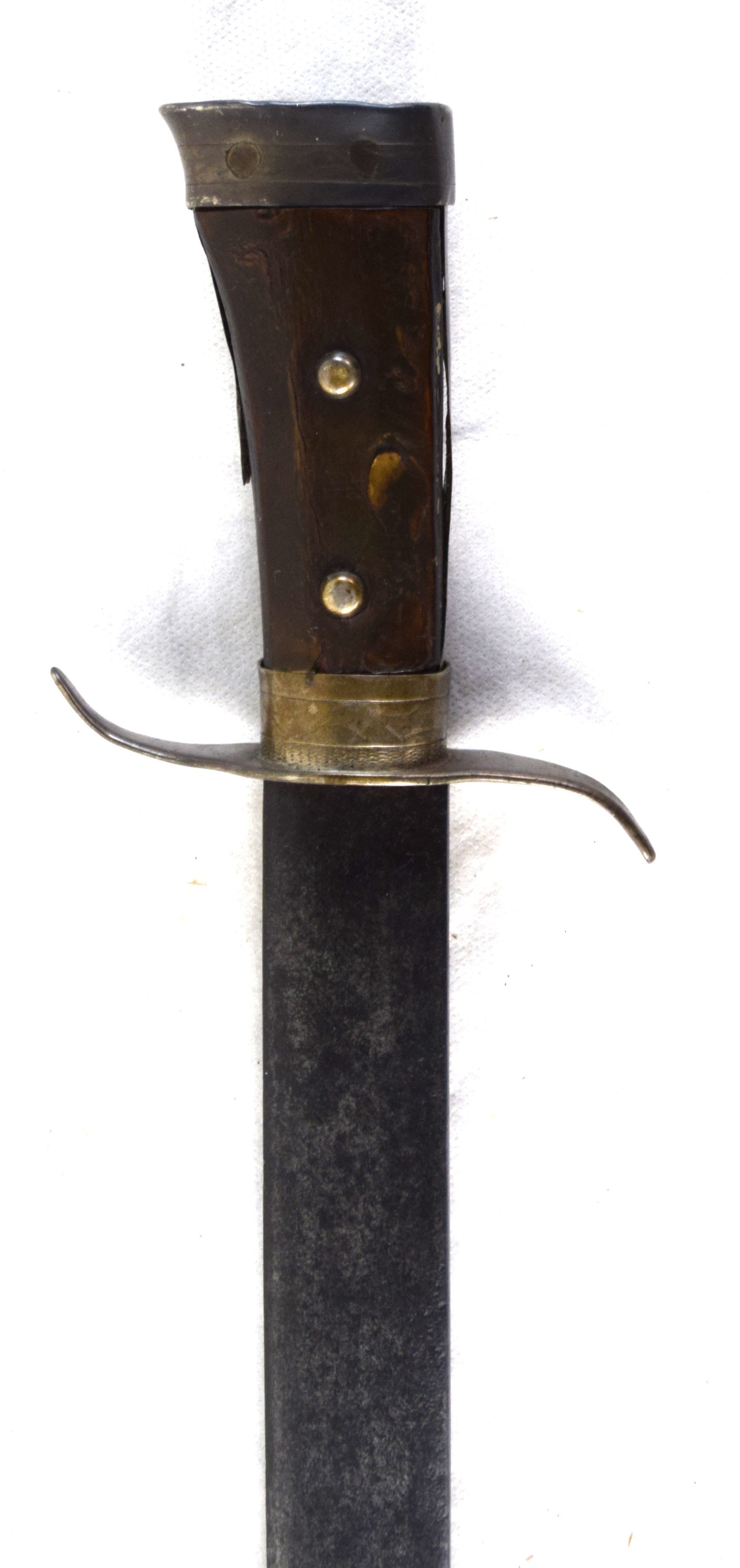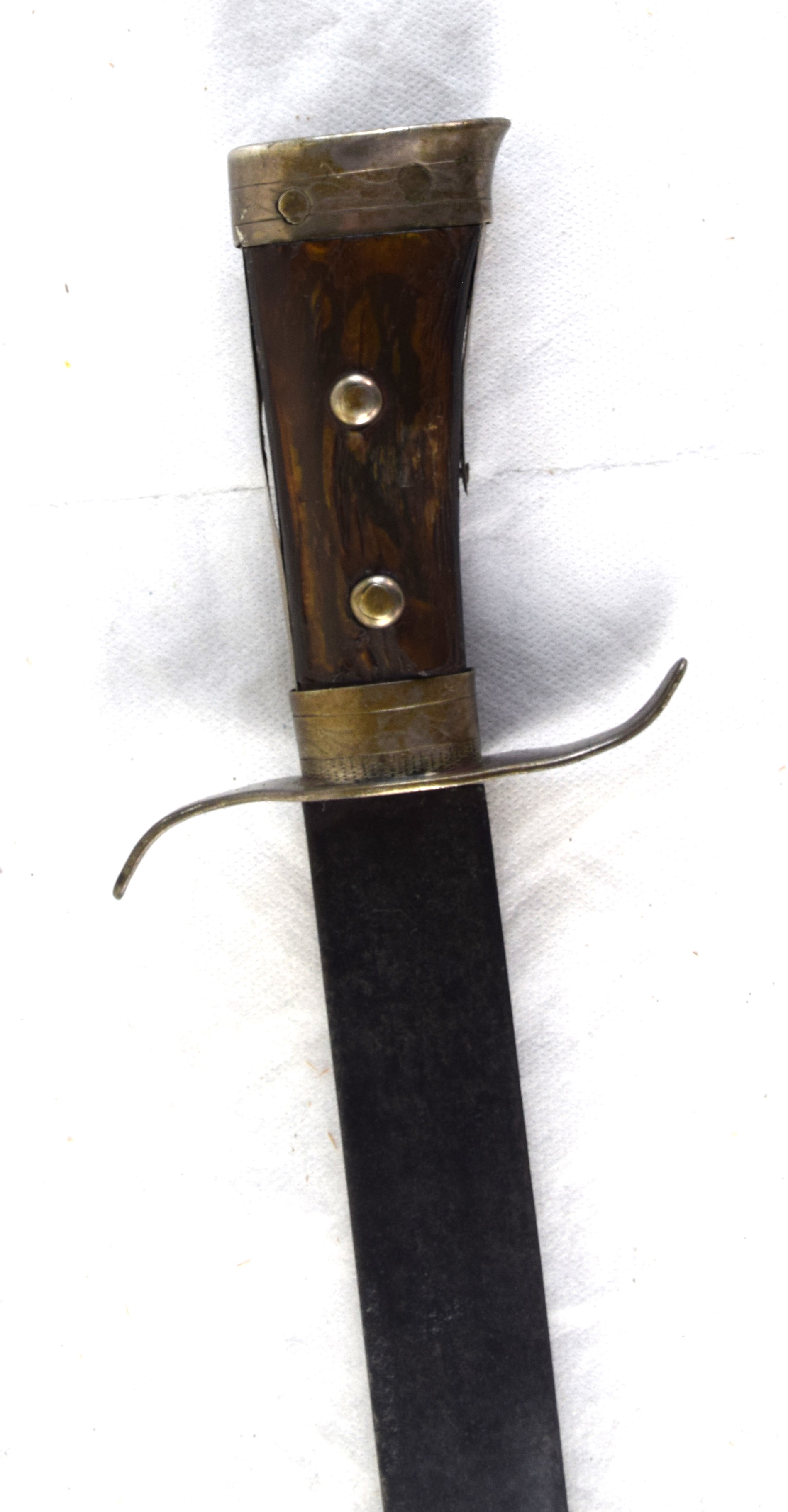 Rare circa 1770 officer /hunting silver mount sword by C. Chousco (See Petersen’s “The American Sword” p 17 in American Silver Mounted Swords). The sword has a horn grip, silver flat pommel with initials of owner (J A). Chouso worked in the Hudson Valley around 1750-1780. One of his hunting swords was owned by General Artemis Ward, an exact replica of this one. Dimensions: 23″ Blade L, 27.5″ Overall