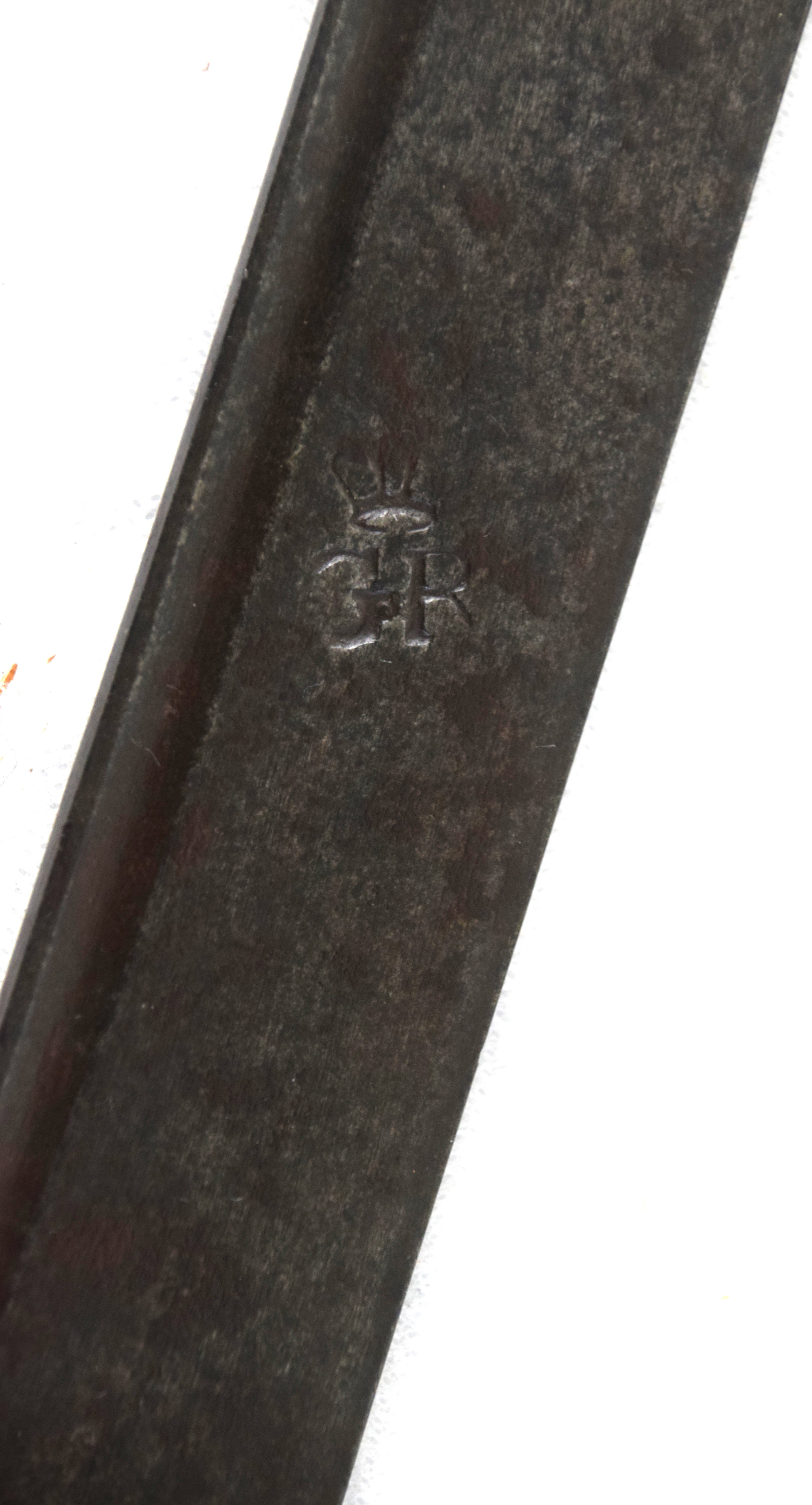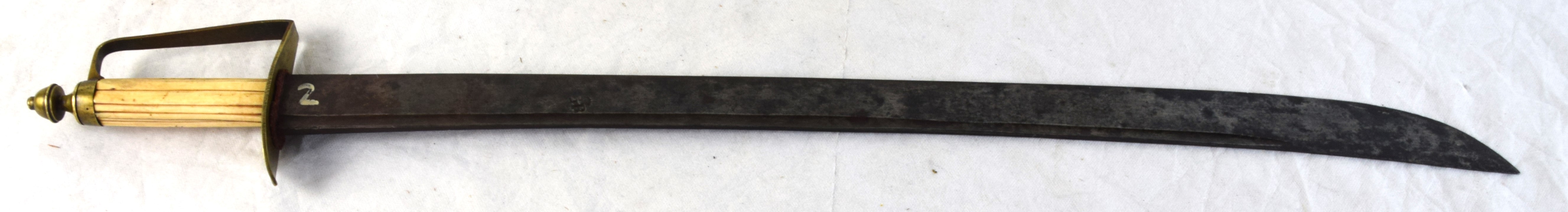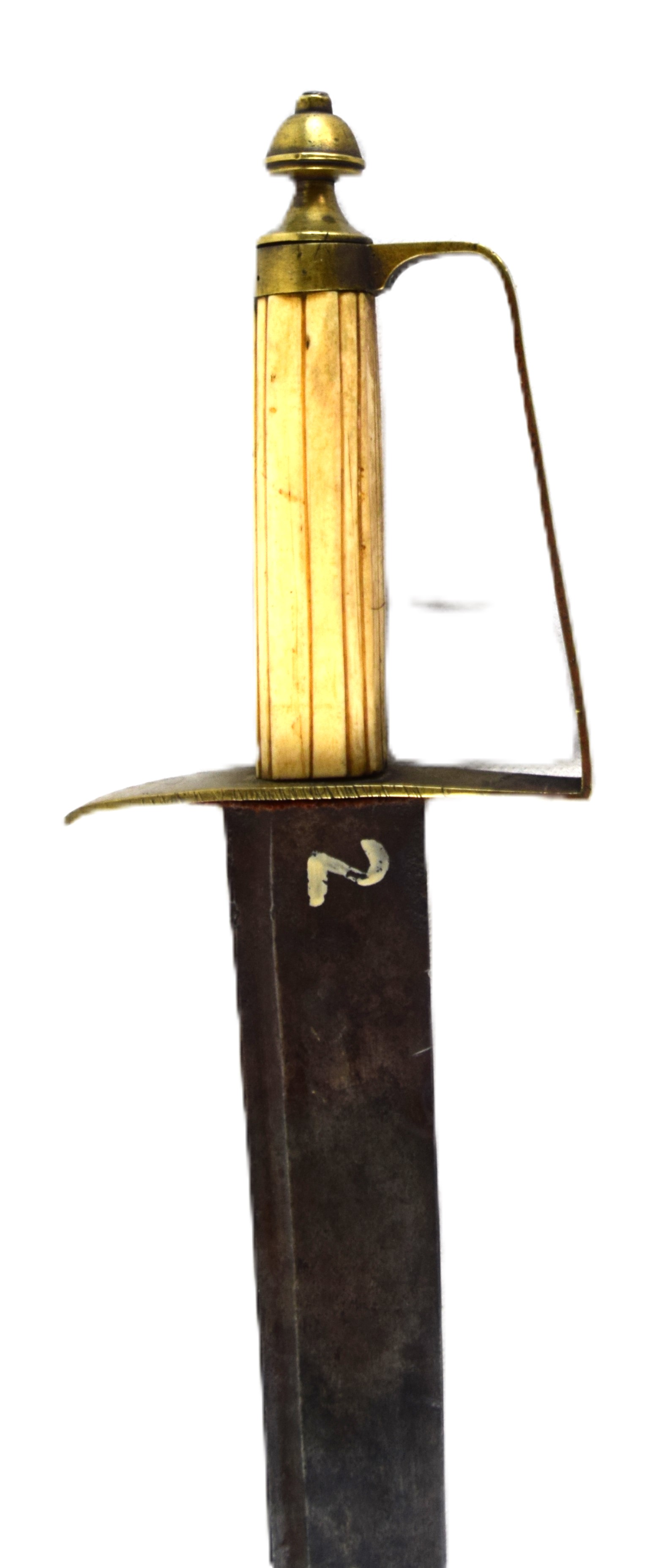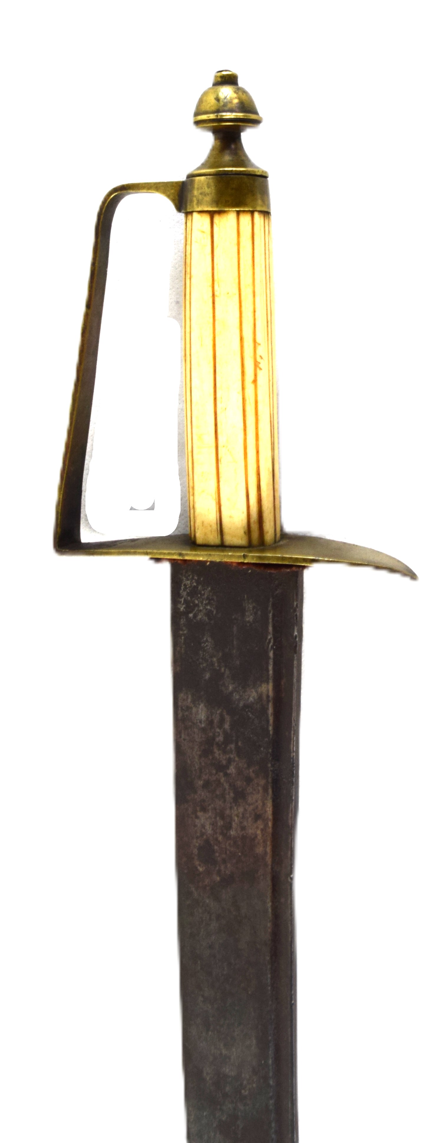 English hanger circa 1780 with fluted bone grip, brass pommel and brass stirrup guard with single fuller. Blade is marked GR with crown on both sides. Dimensions: 27″ Blade, 32.5″ Overall