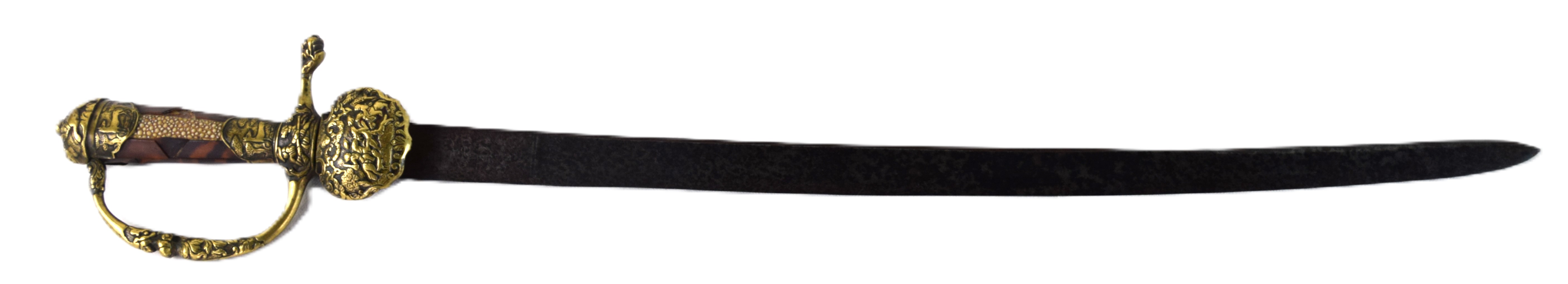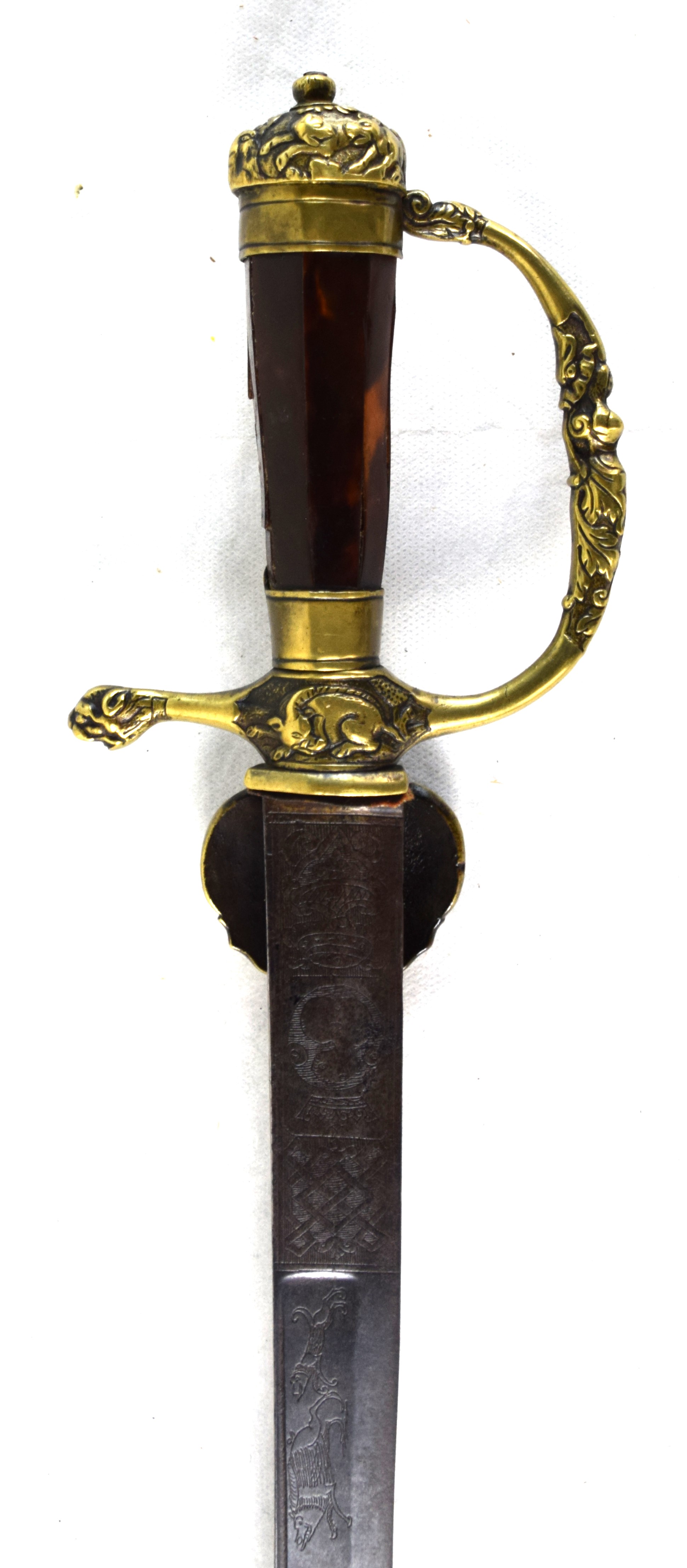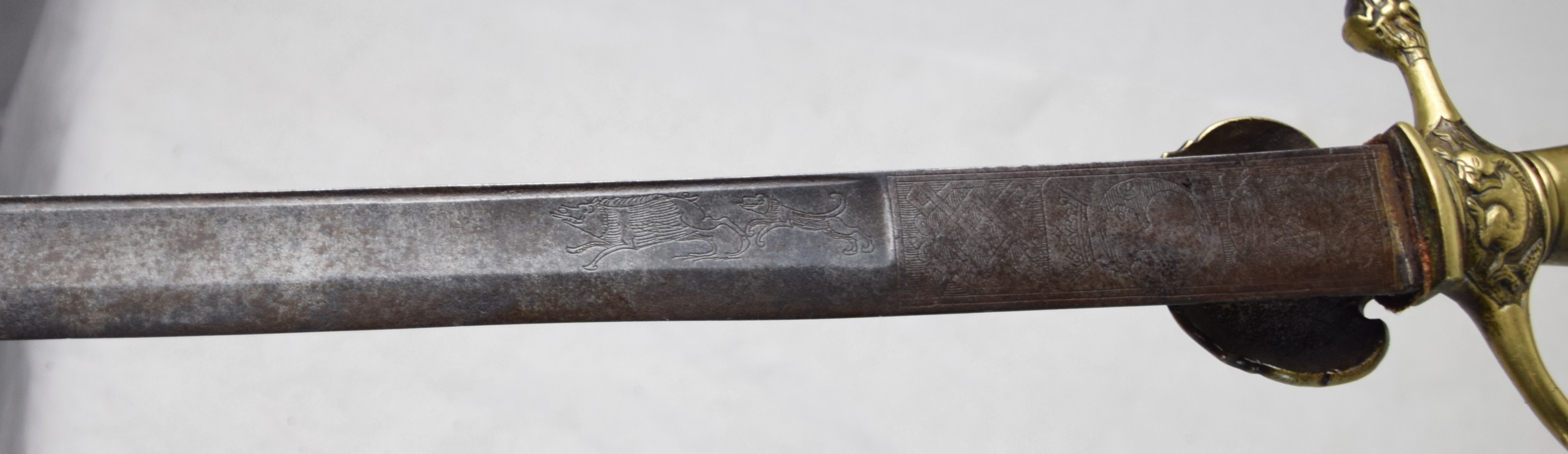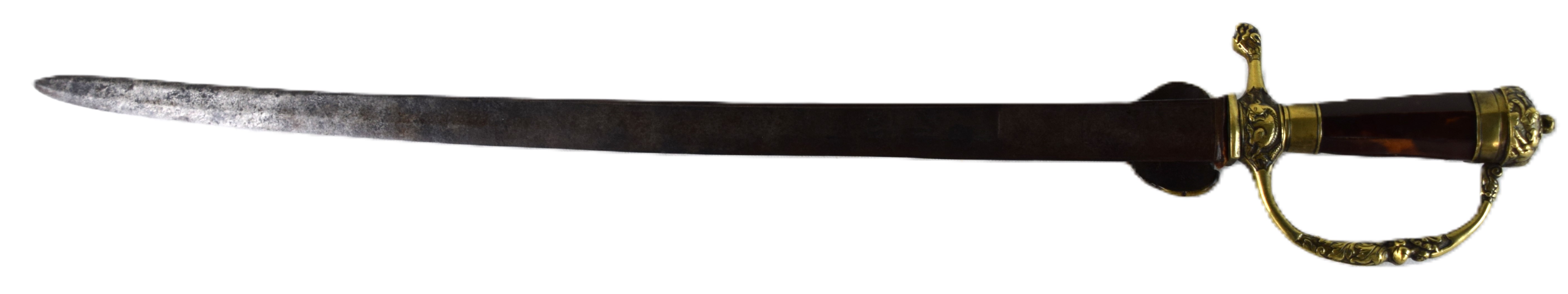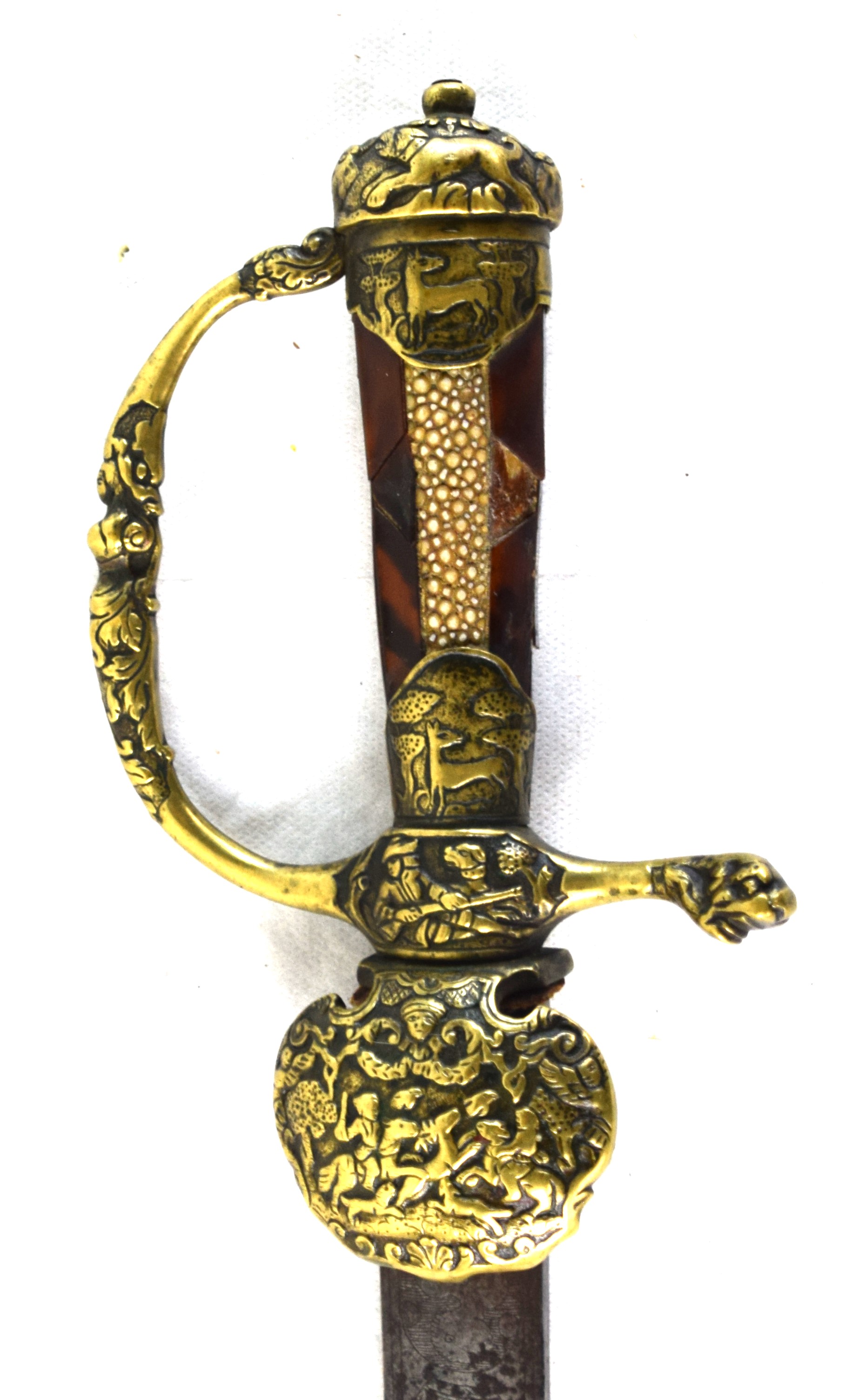 Late 18th century English elegant hunting sword with tortoise and snake grip, brass pommel with animal designs, D Guard with animal designs and hunting scenes on the blade. Dimensions: 22.5″ Blade L, 28.5″ Overall