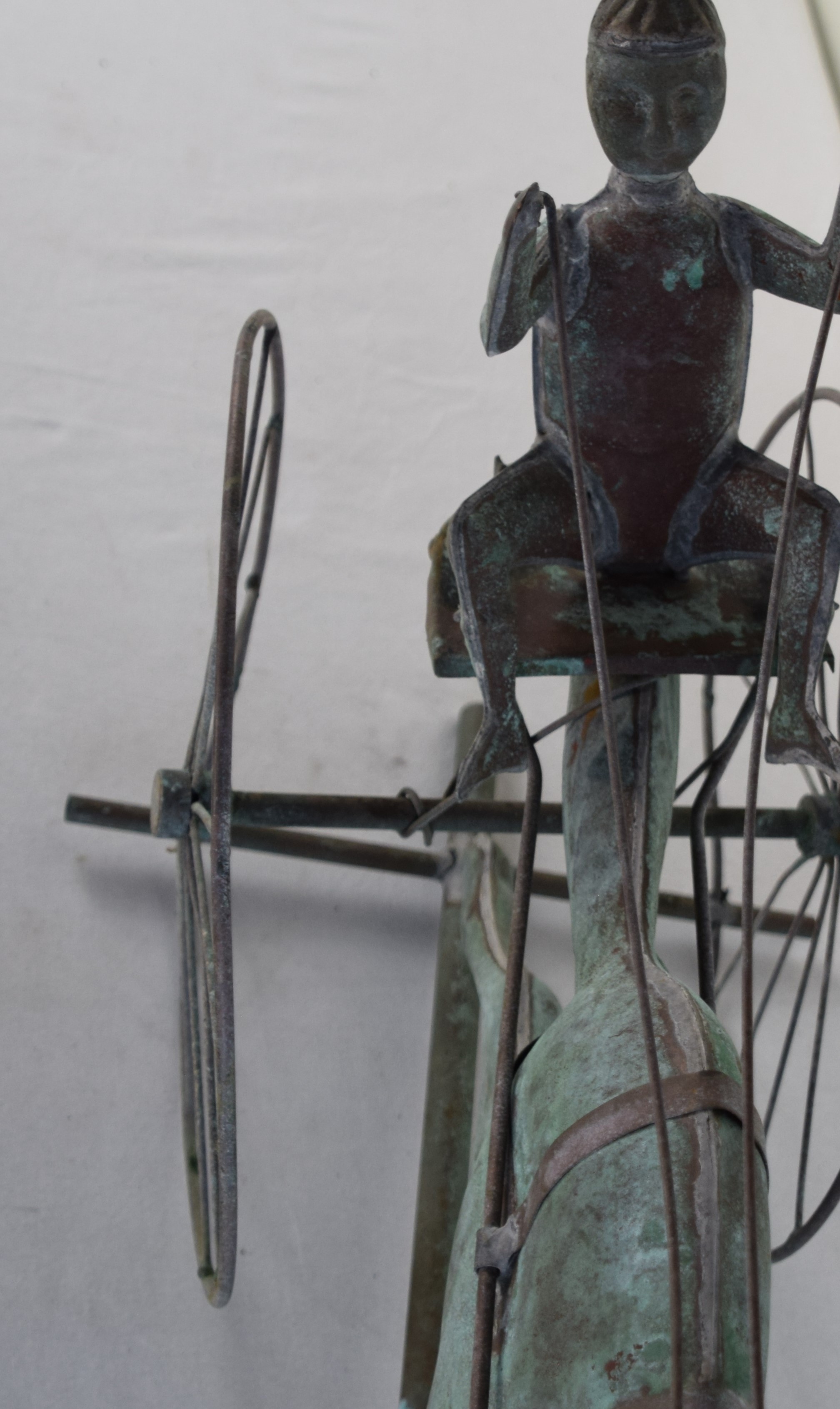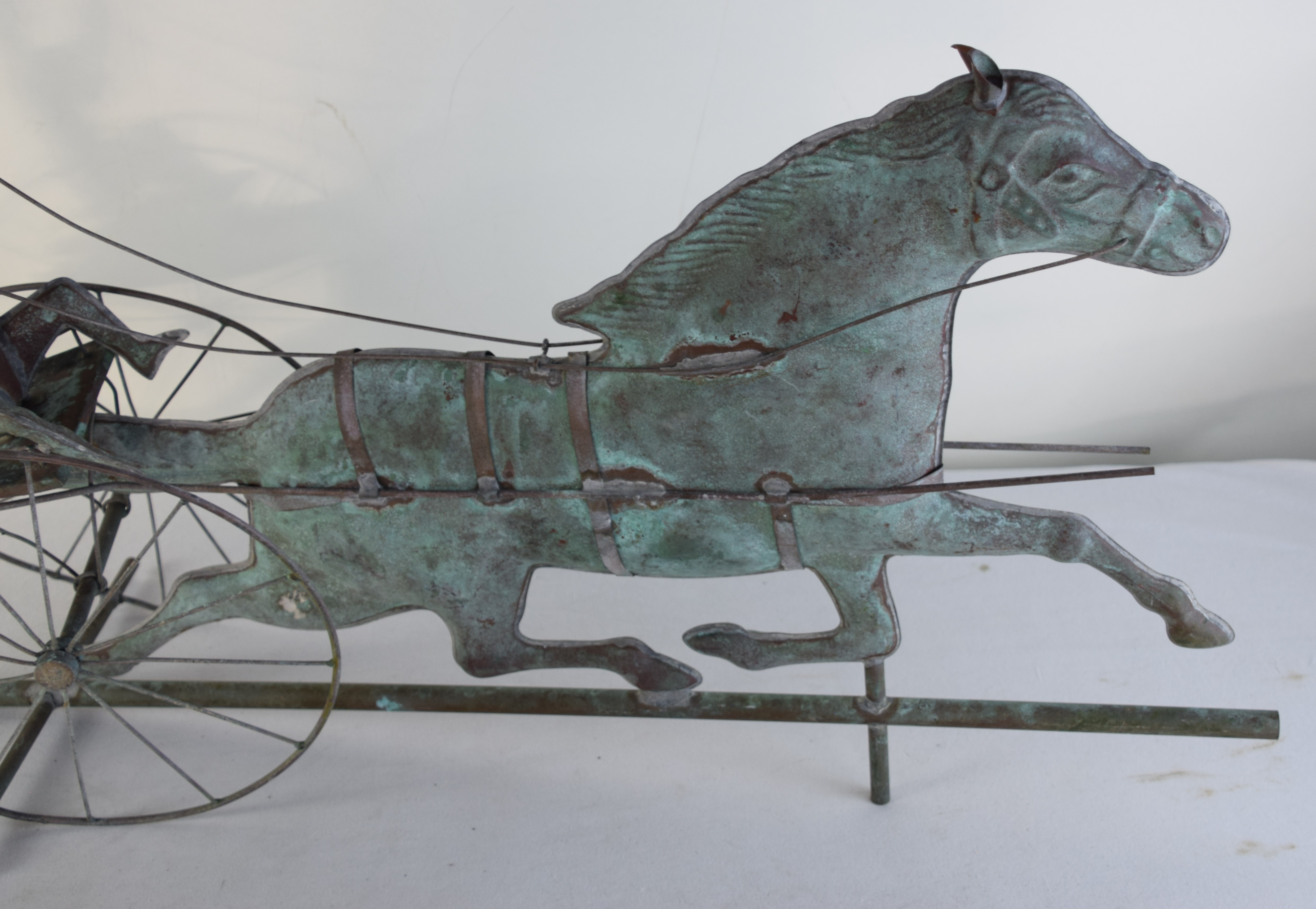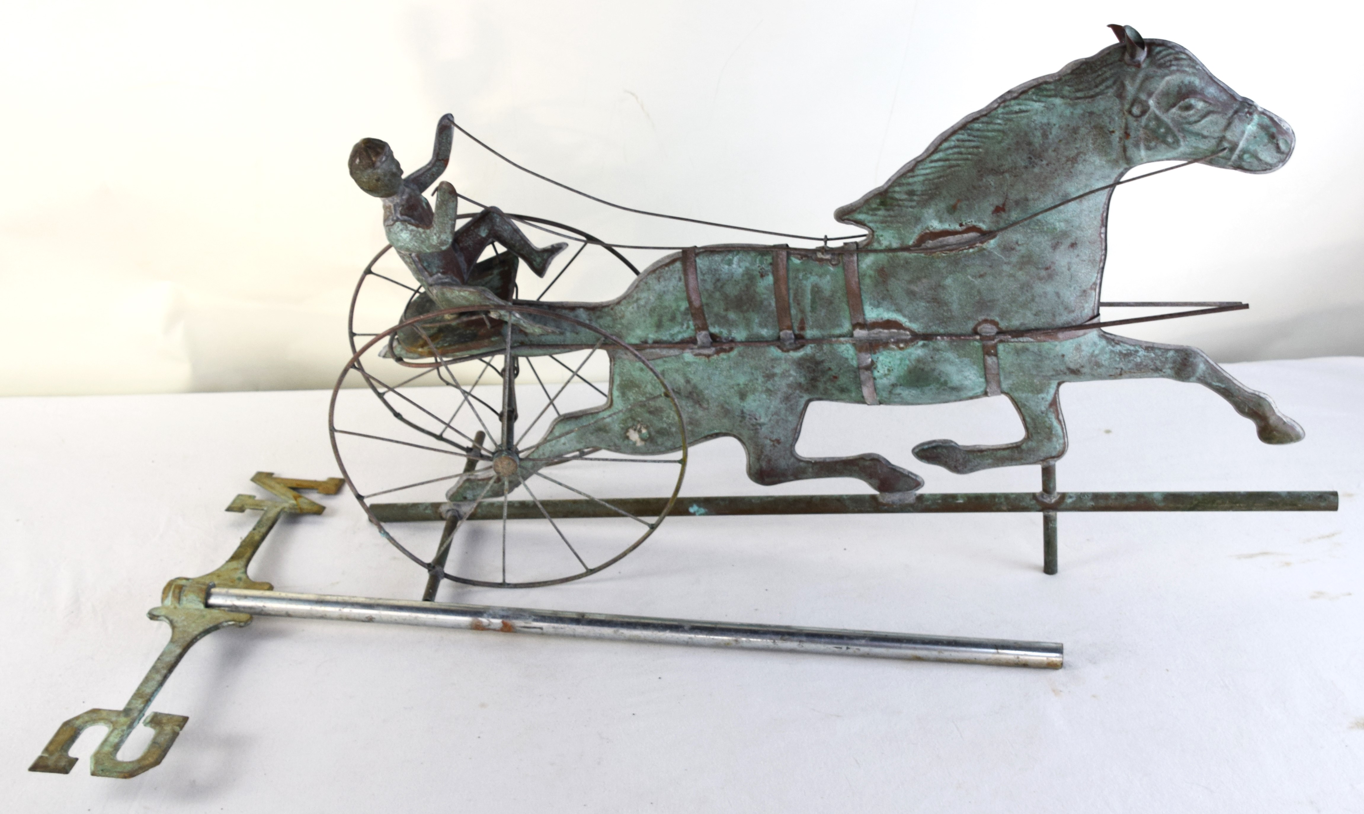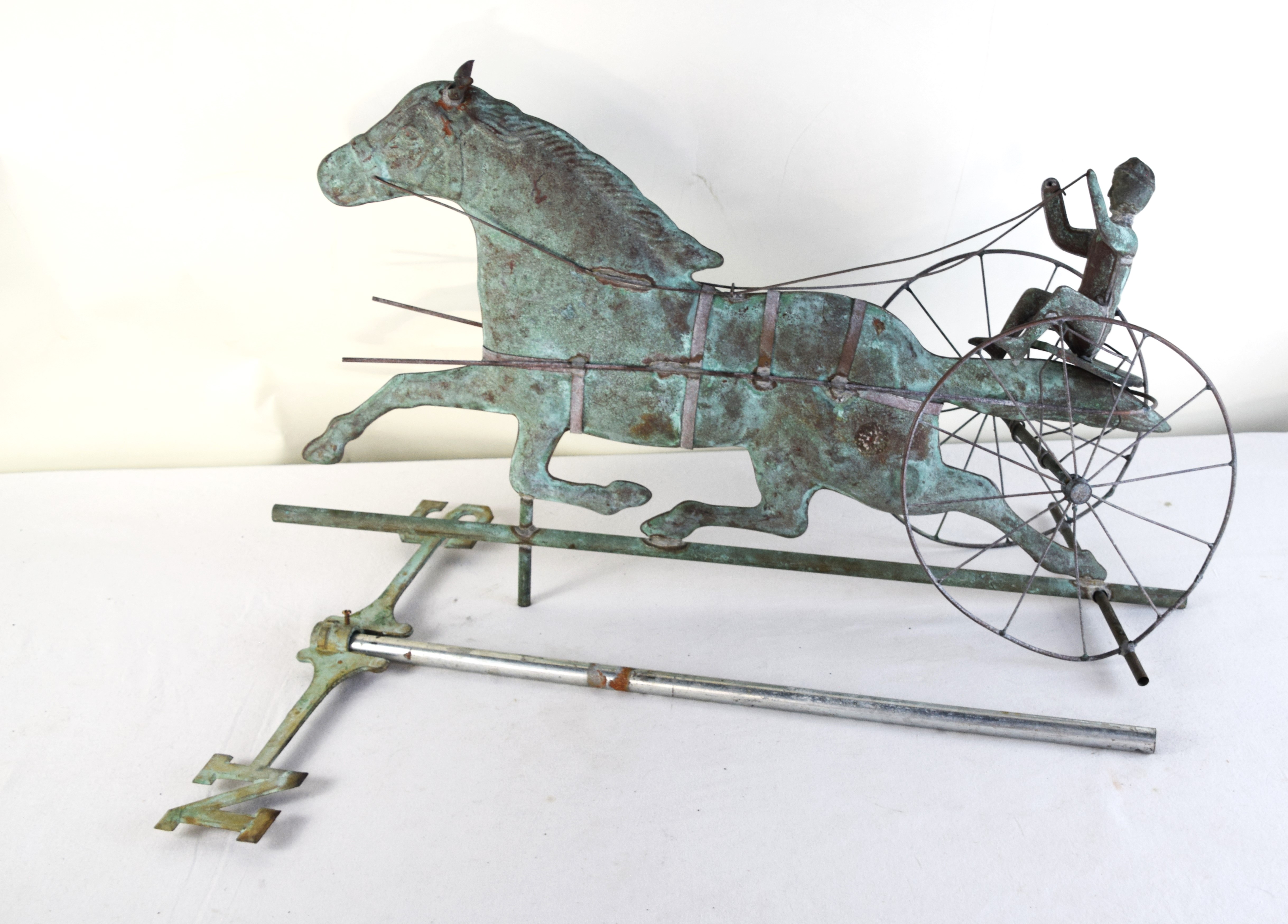 Running horse sulky weathervane in copper with the driver and sulky and with a N and S directional indicator. Dimensions: 31″ L x 18″ H