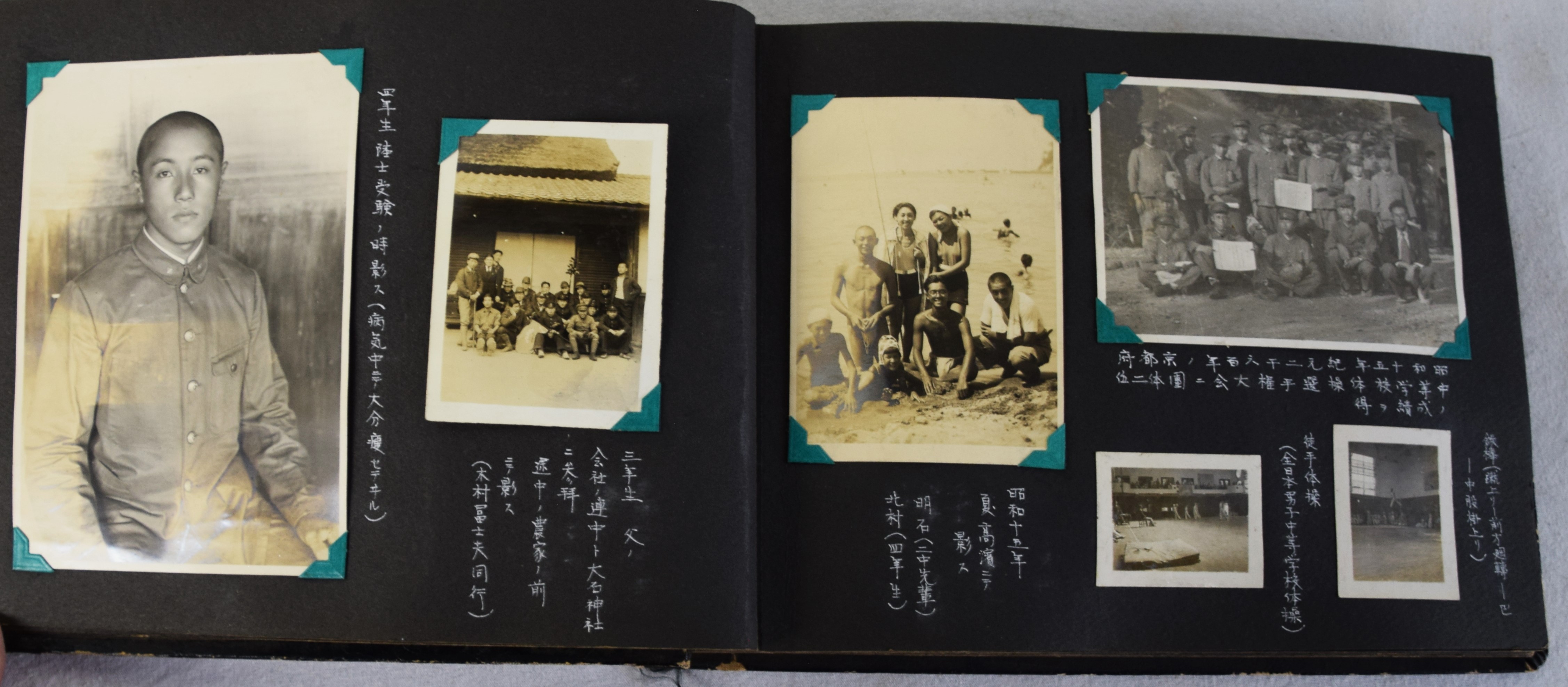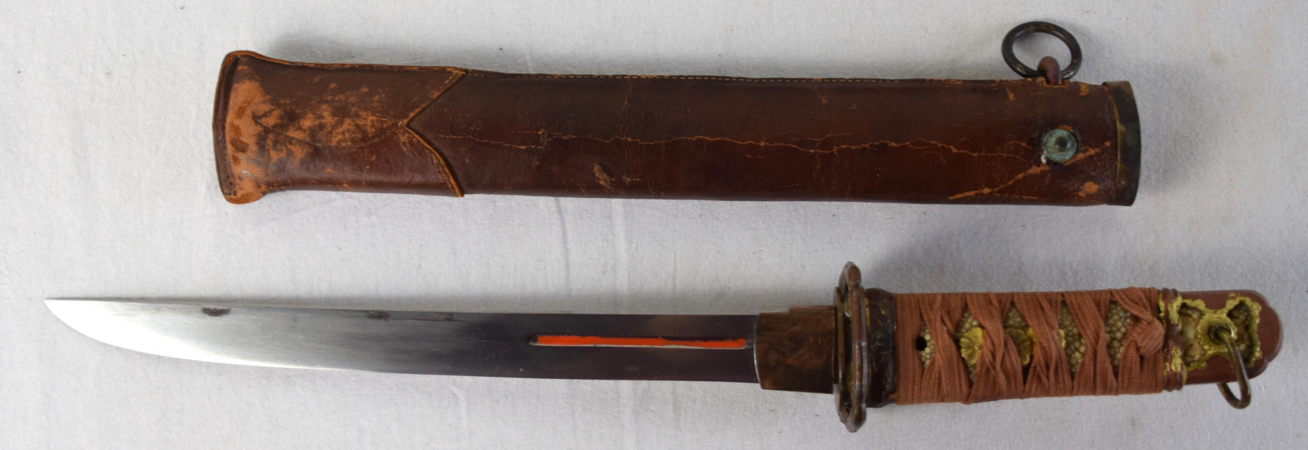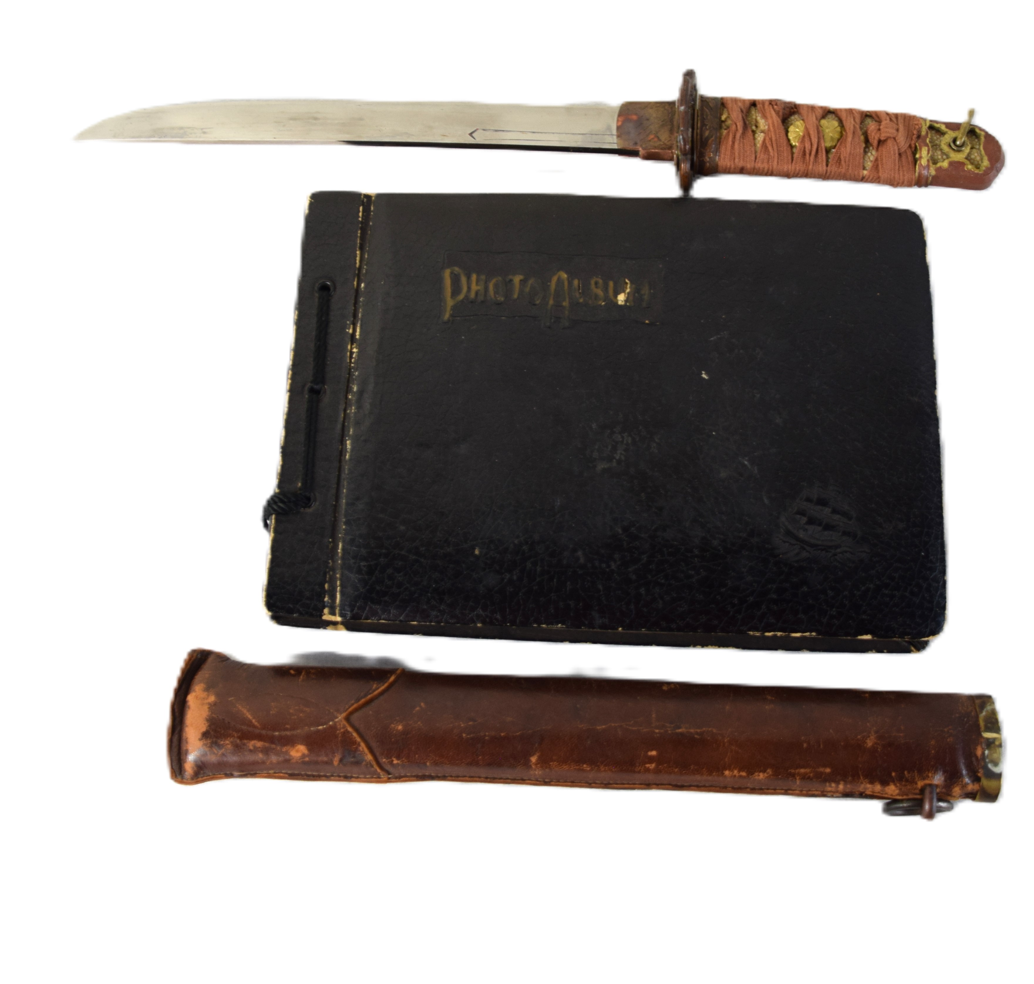 Photo album of 40 pages showing the life of a Kamikaze pilot from youth to military school to pilot training. Also included is a tanto sword with leather and wood scabbard, a highly regarded as one of the most respected samurai weapons used in history owned by the Kamikaze pilot. Dimensions: 10″ Blade, 17″ Overall