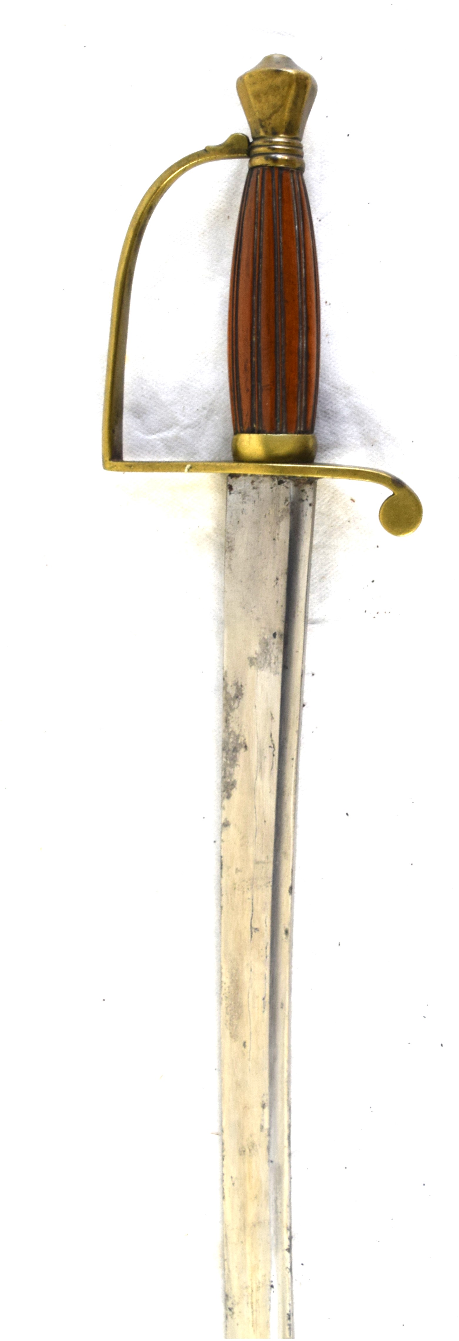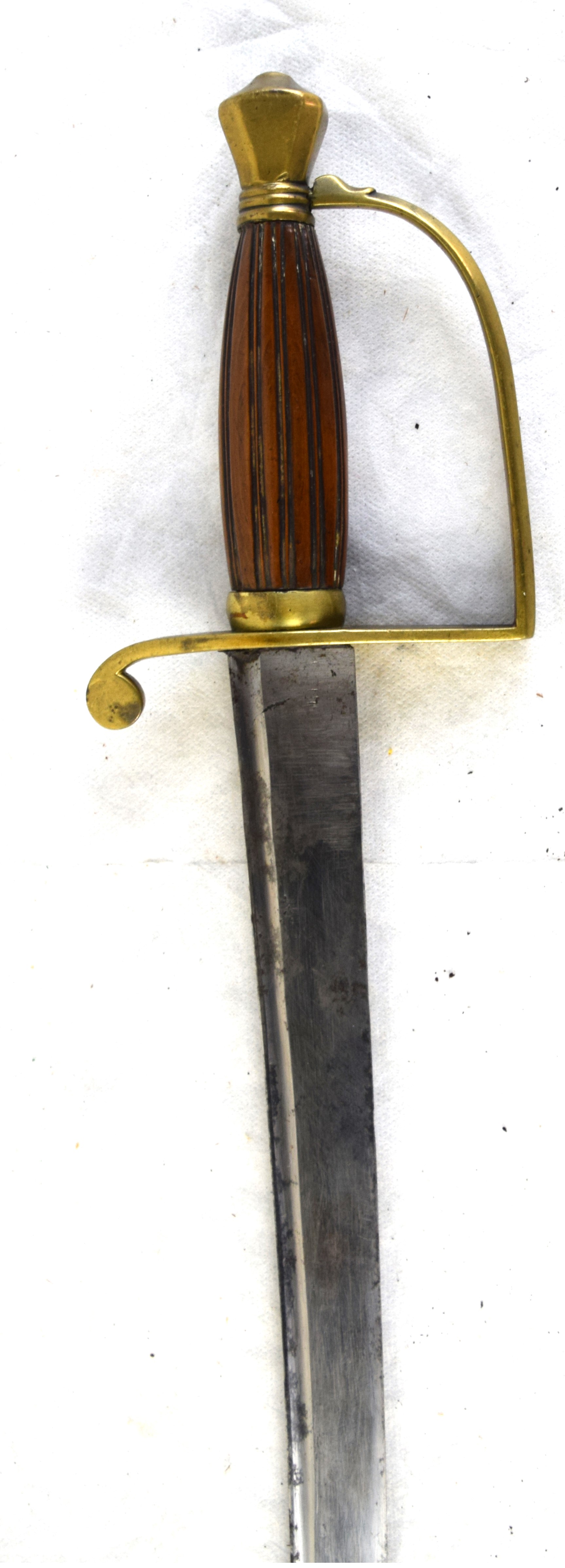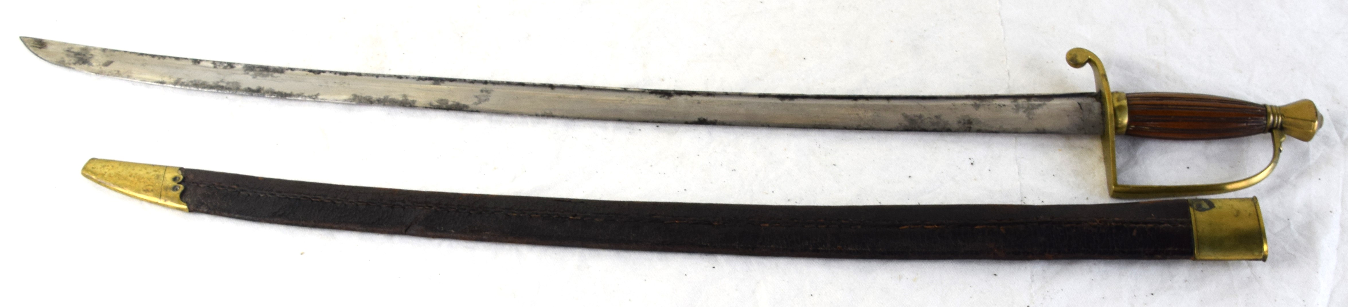 Civil War artillery officer sword with D guard, wood and fluted grip, curved sword with single fuller plain unmarked blade, with leather and brass scabbard. Dimensions: 27.5″ Blade, 33″ Overall