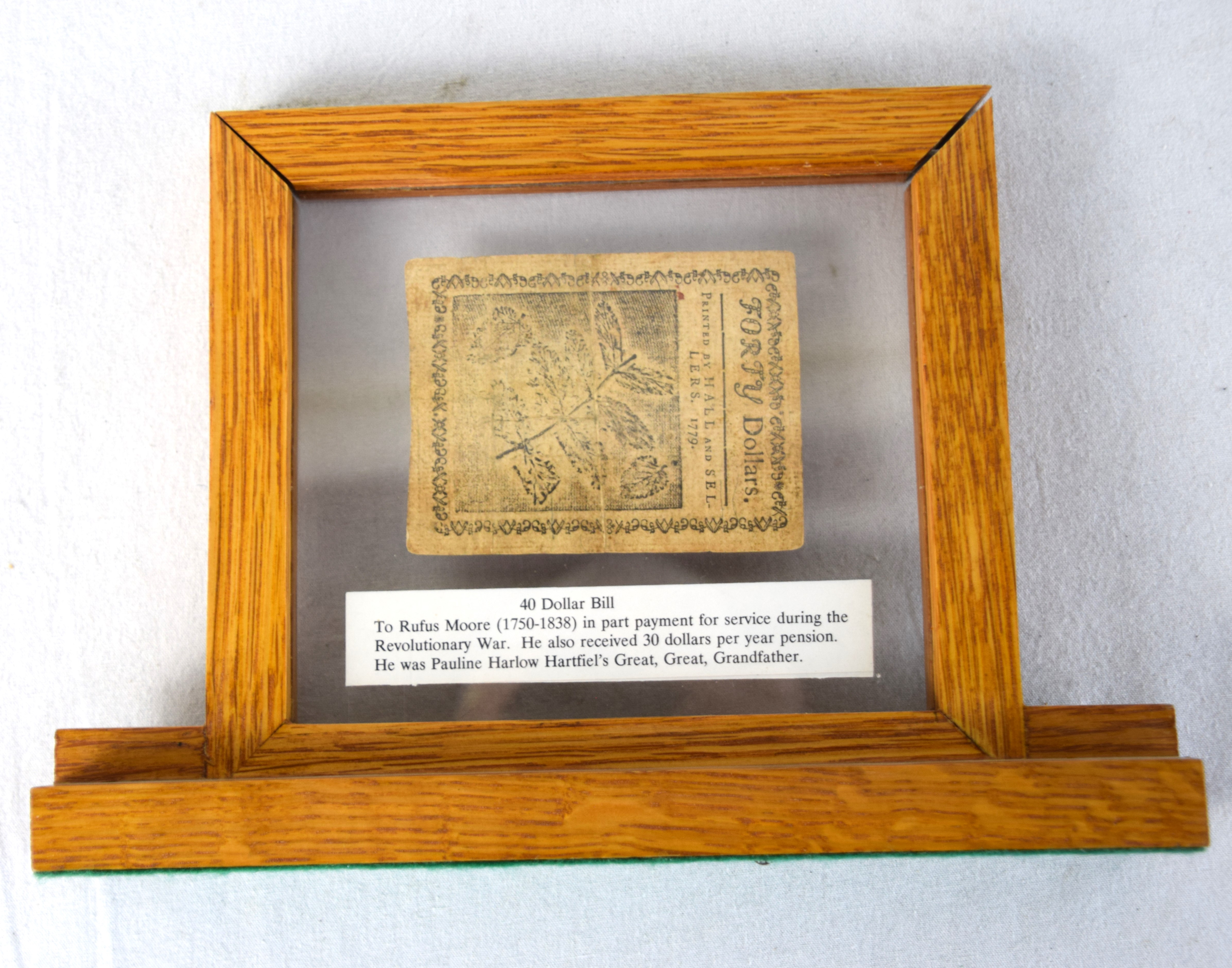 Framed $40 dollar note (numbered 86266) by Congress dated 14 January 1779 to Rufus Moore (1750-1838) in payment for his service in the Revolutionary War.
