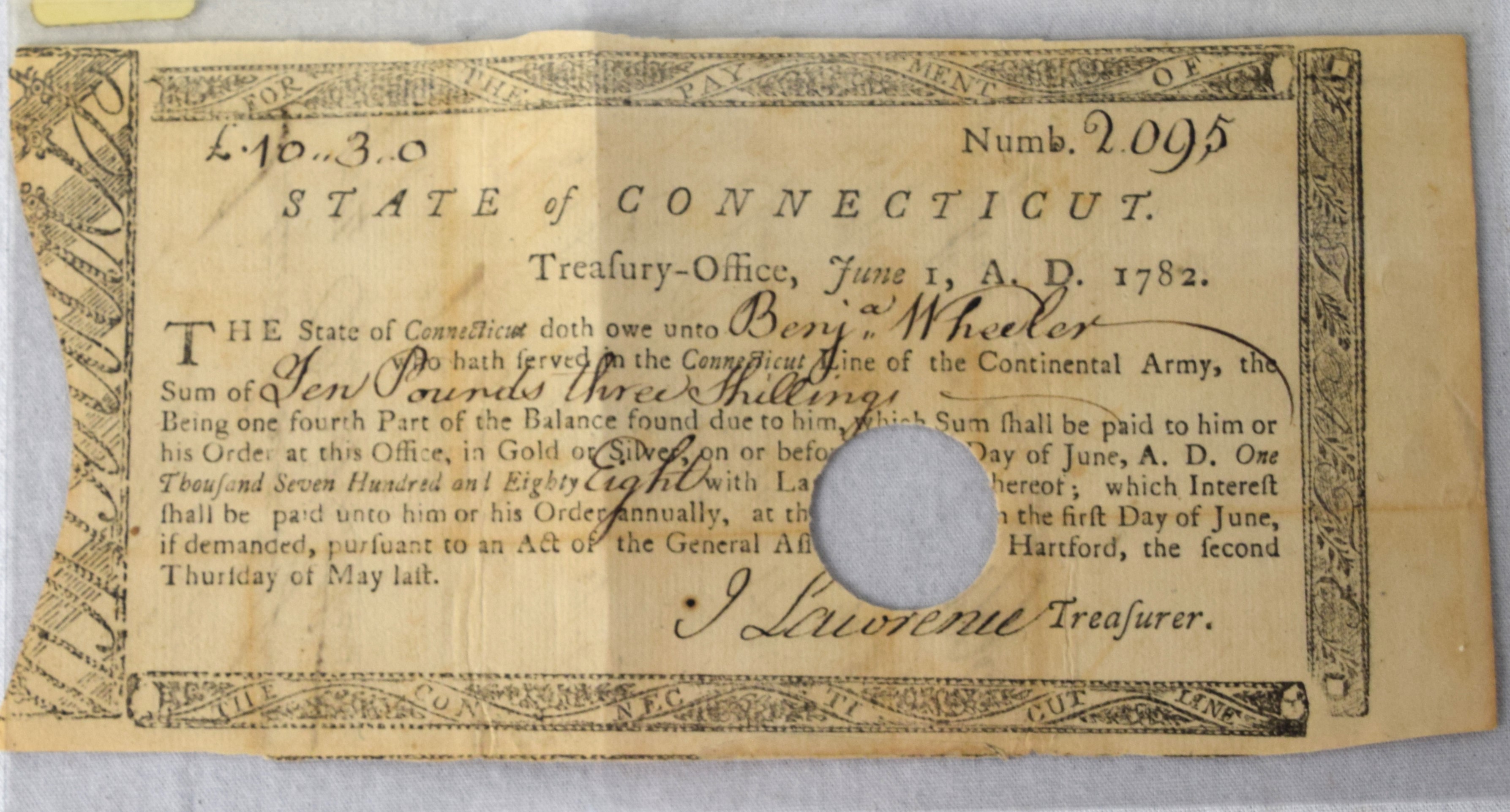 Ten pound, three shillings Connecticut continental currency note owed to Benjamin Wheeler who served in the Connecticut Line.