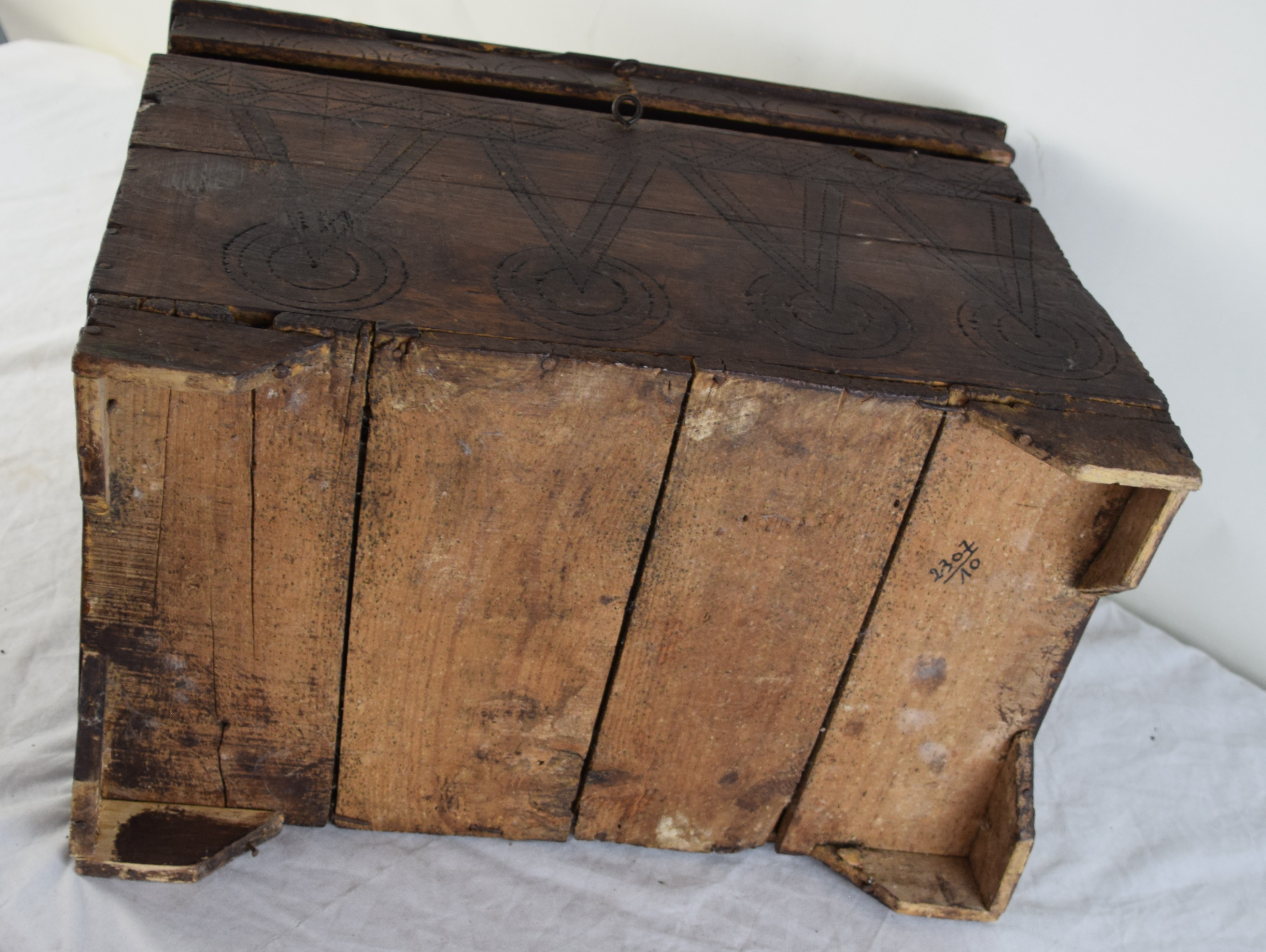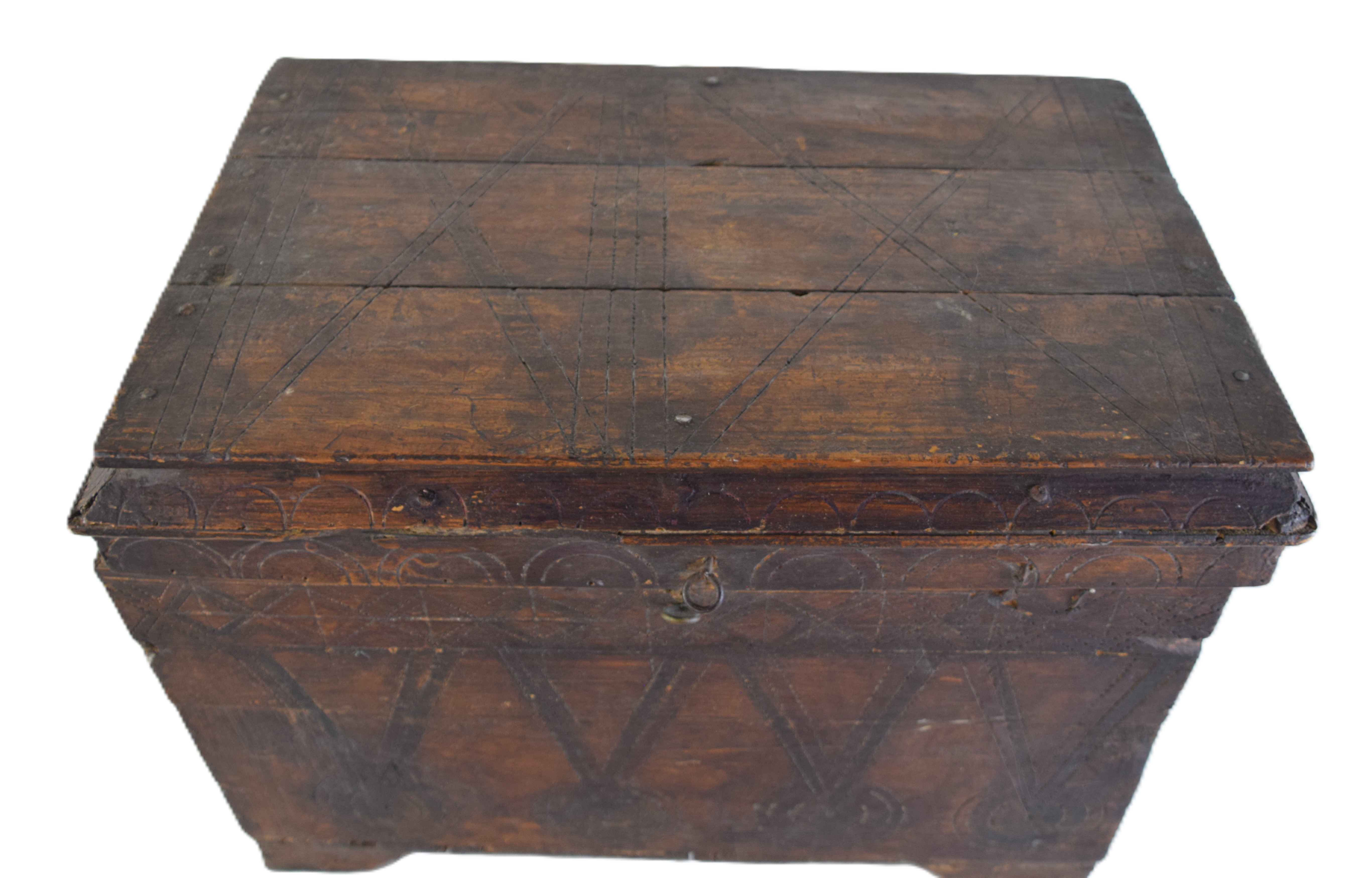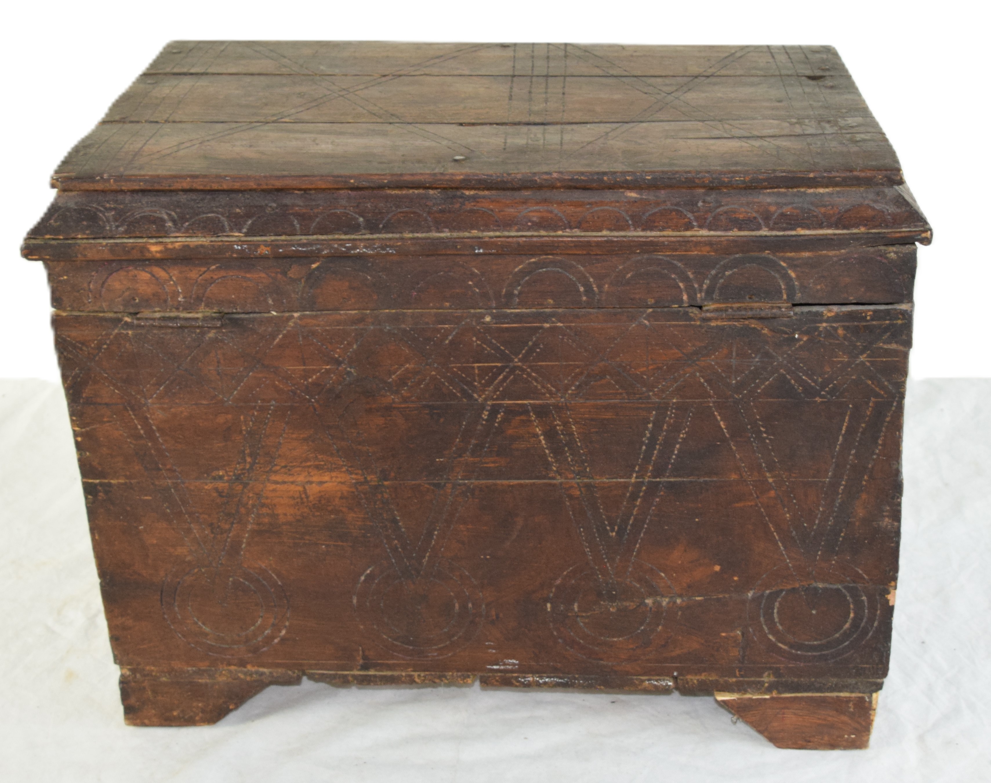 A Shepards marriage/coffer chest likely from Transylvania with geometric designs, circa mid to late 1700s. Dimensions: 16H x 20″ W x 20″ D
