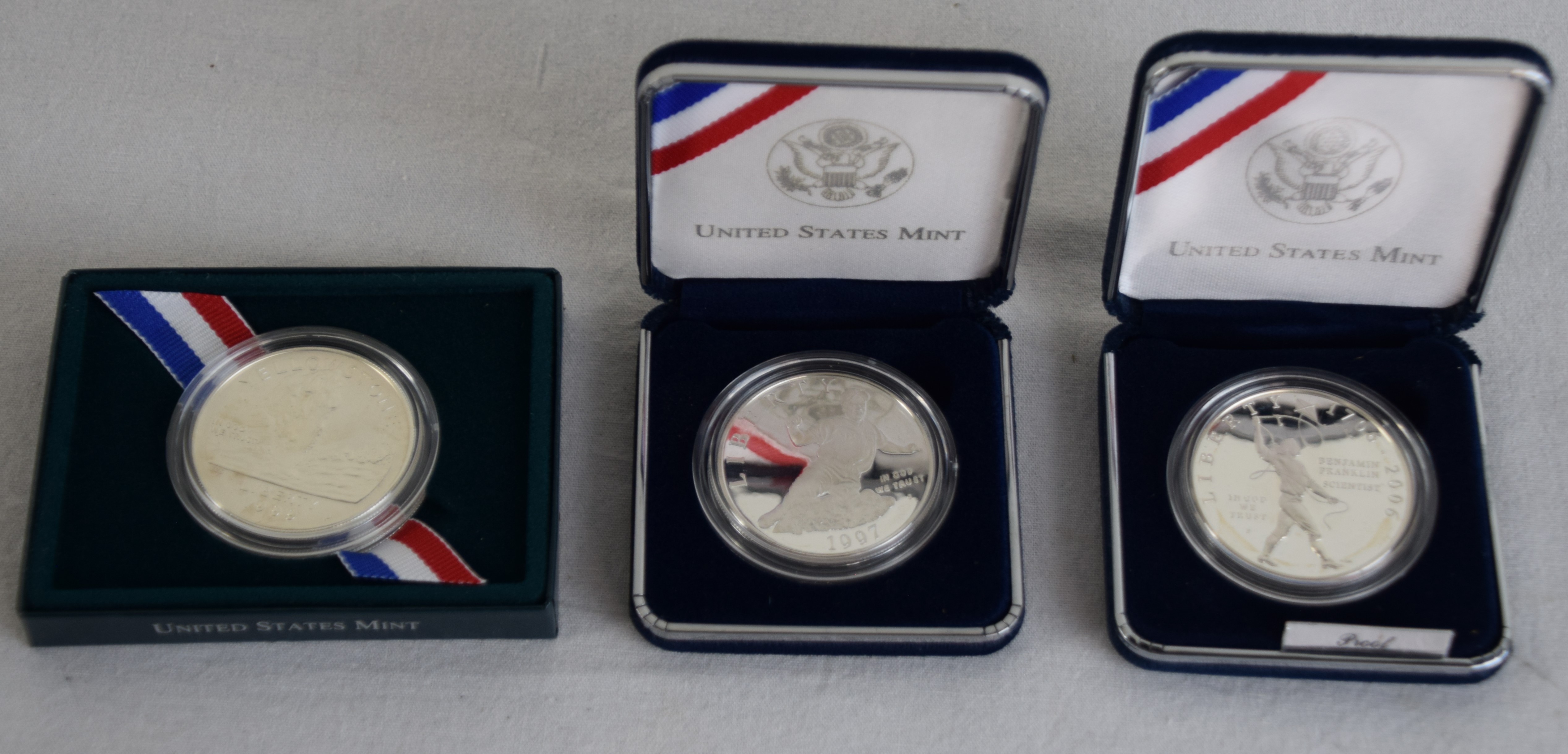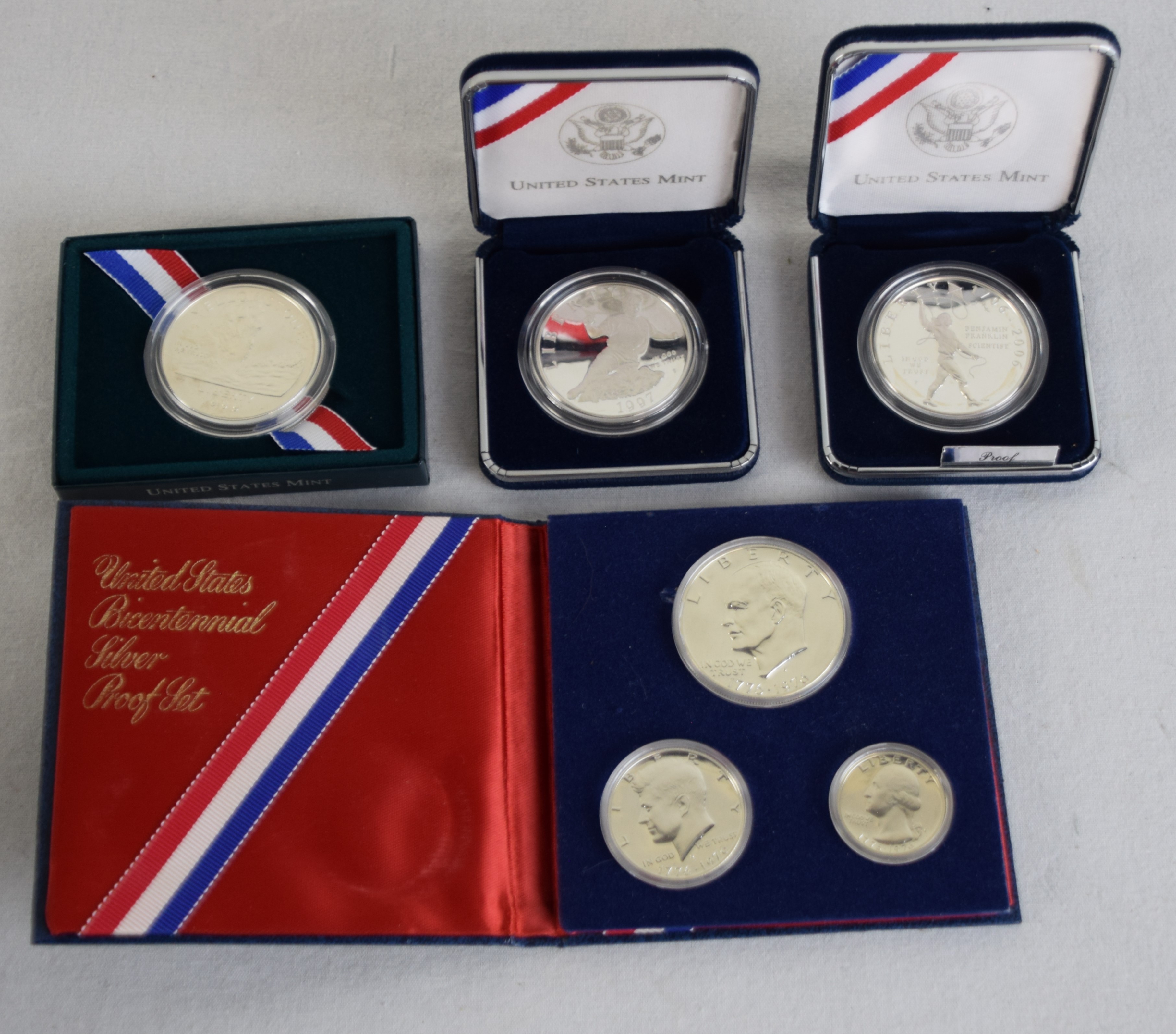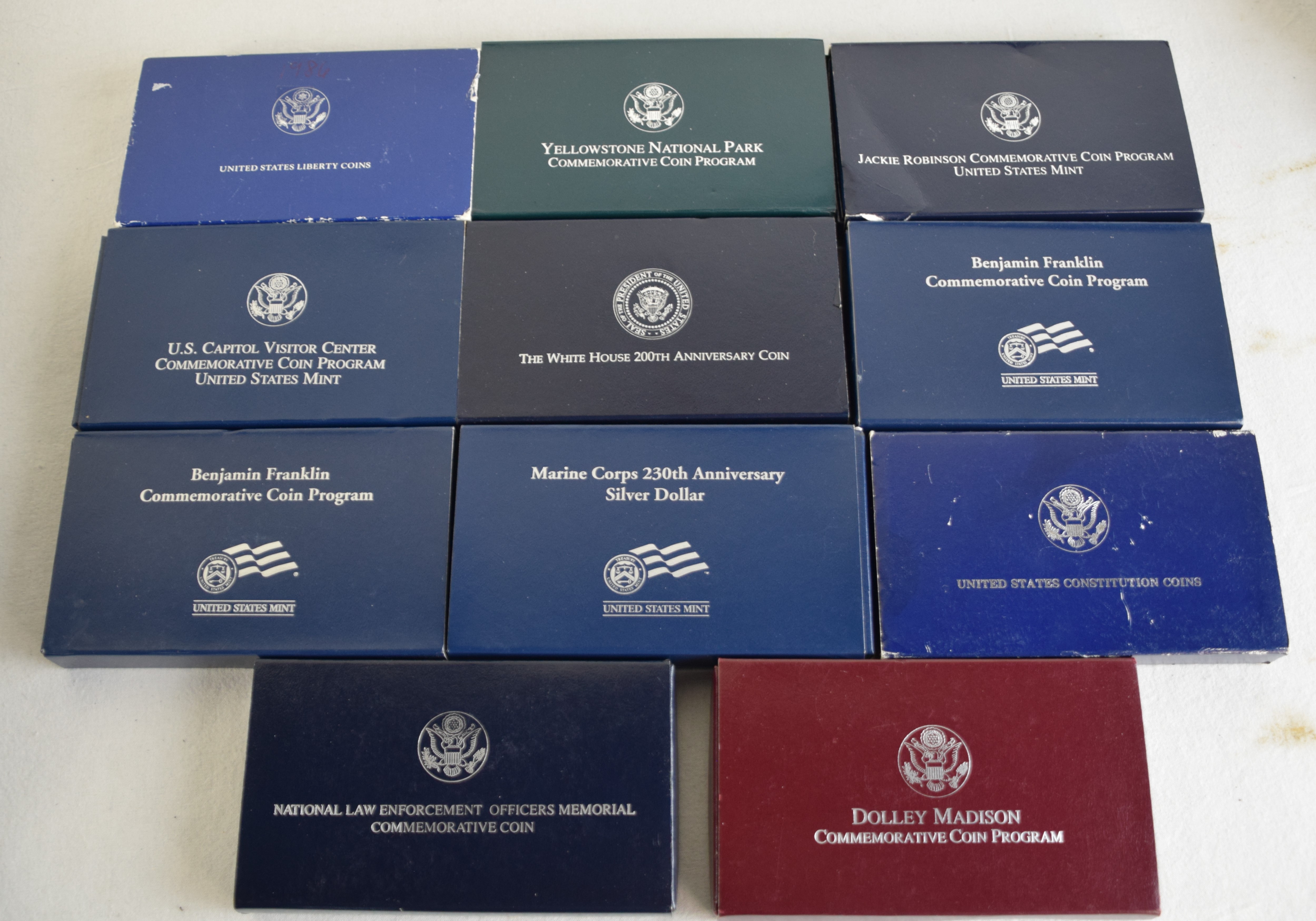 Commemorative collection includes: Kennedy Comm, Library of Congress, National Law Enforcement, American Indian, White House 2000, Jackie Robinson, Ben Franklin (2), Dolly Madison, Yellowstone, Capital Visitors, US Liberty. Also included US Prestige sets: 1984, 1987,1991, 1990, 1993, 1986; Colored JFK, Colored September 11, colored S. B. Anthony, US Bicentennial Silver proof, plus individual coins.