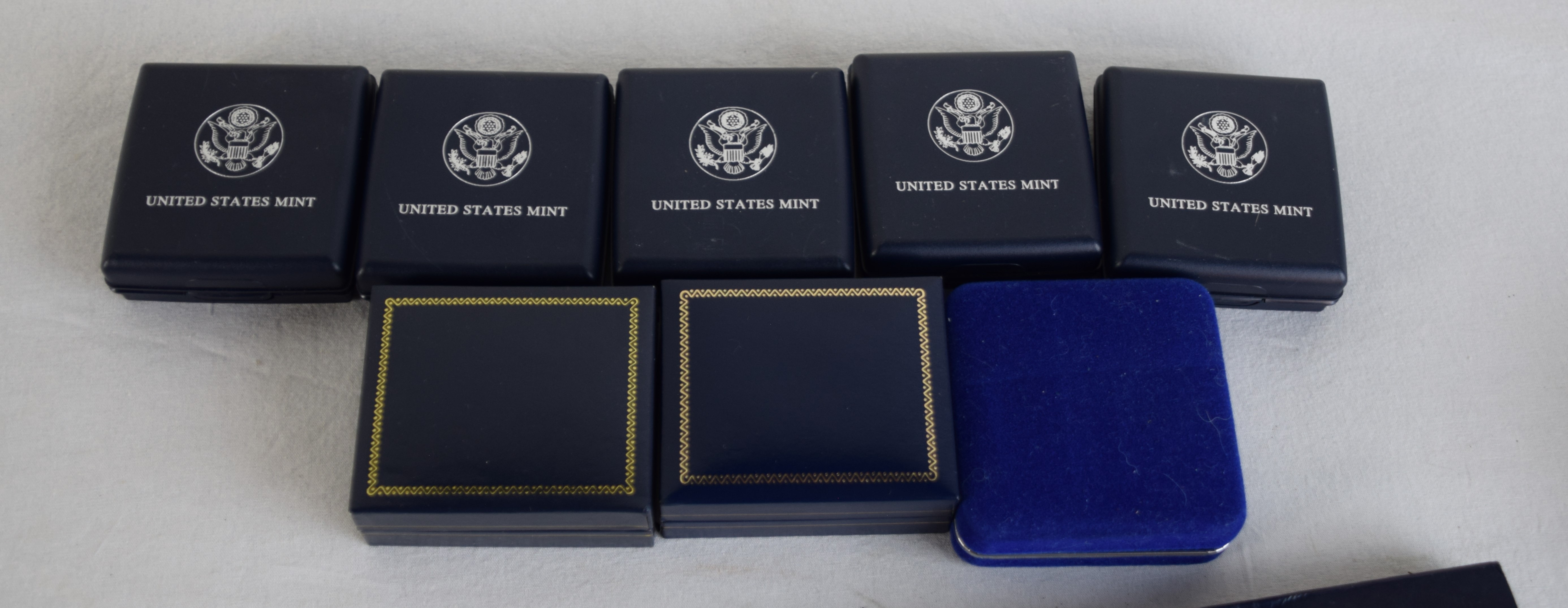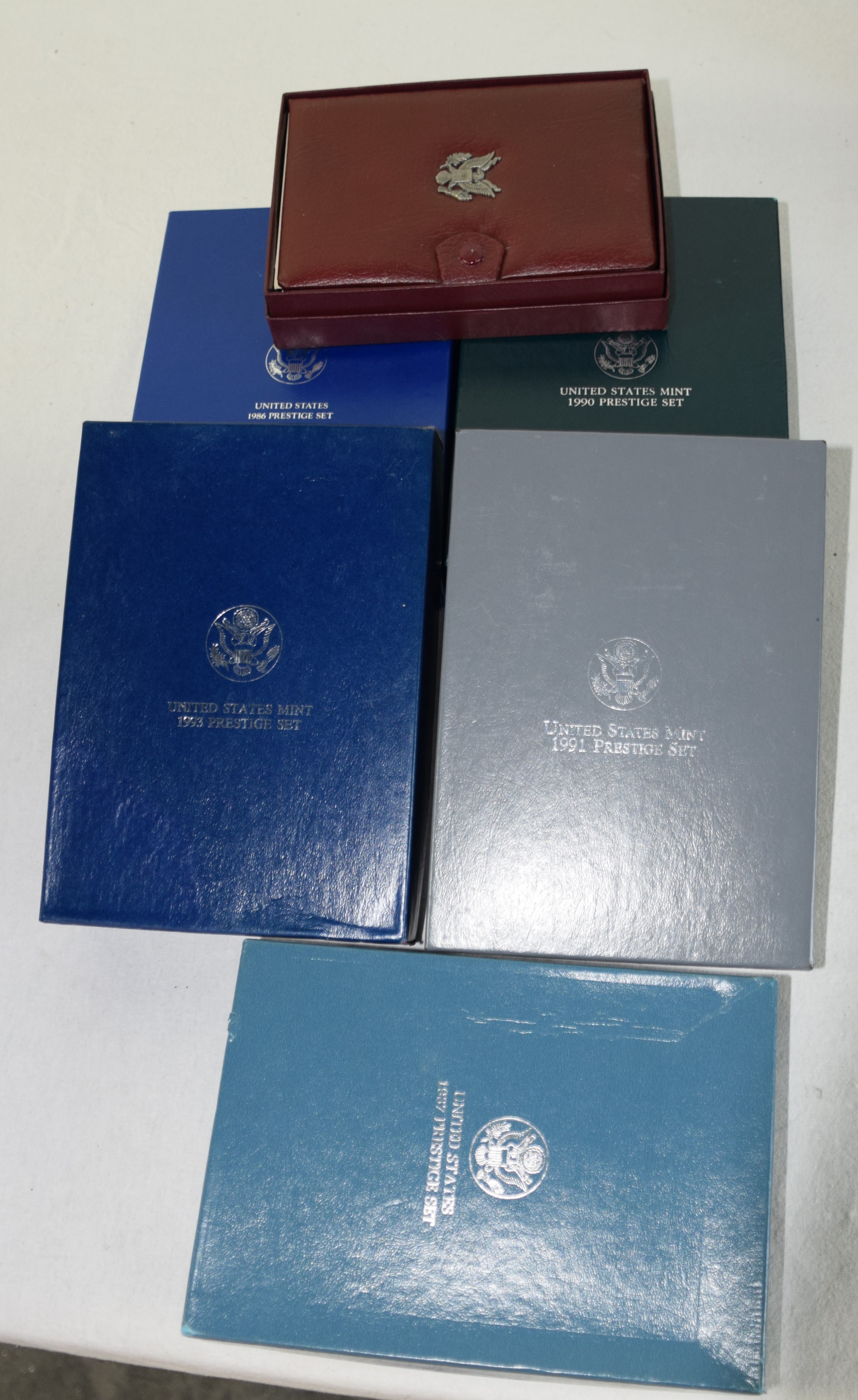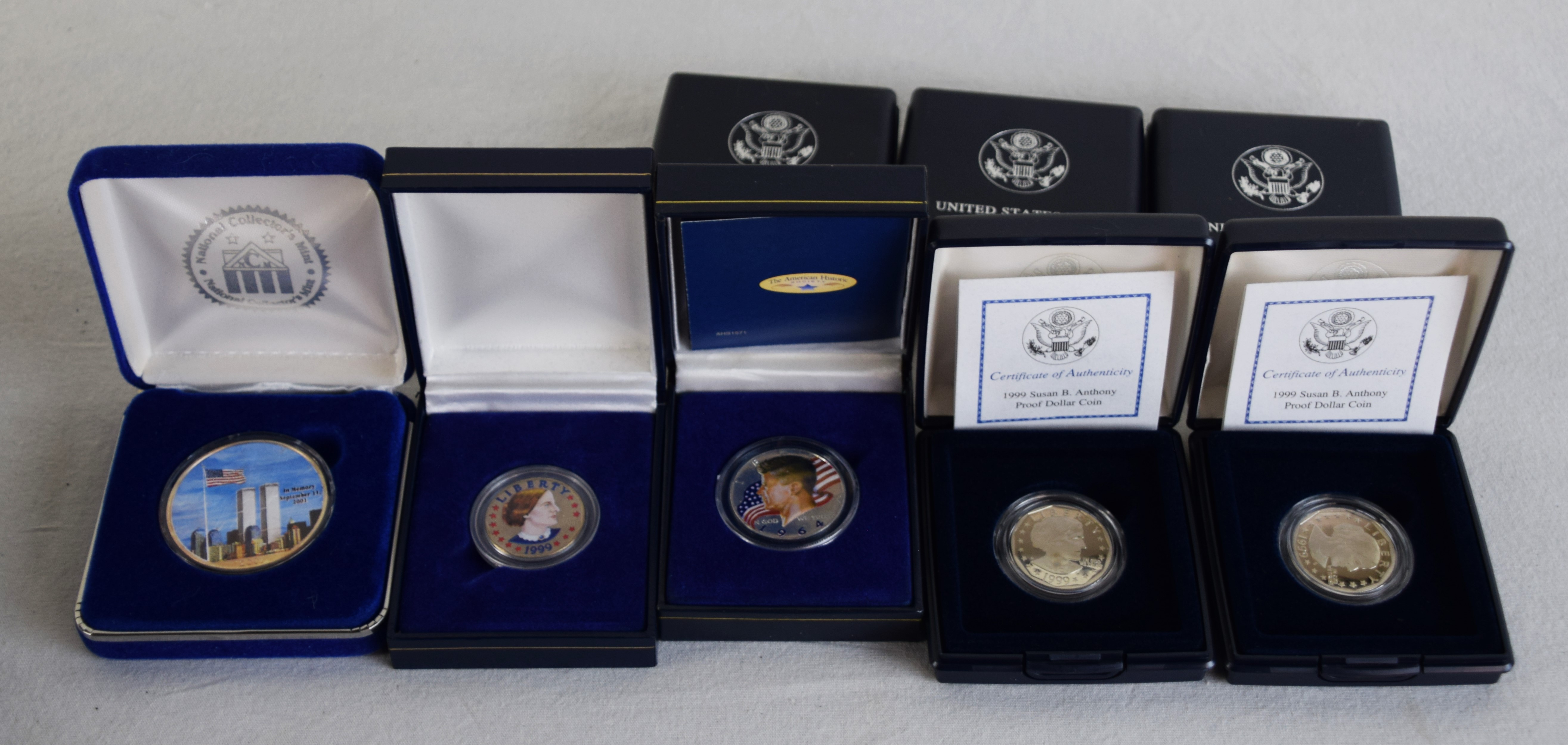 Commemorative collection includes: Kennedy Comm, Library of Congress, National Law Enforcement, American Indian, White House 2000, Jackie Robinson, Ben Franklin (2), Dolly Madison, Yellowstone, Capital Visitors, US Liberty. Also included US Prestige sets: 1984, 1987,1991, 1990, 1993, 1986; Colored JFK, Colored September 11, colored S. B. Anthony, US Bicentennial Silver proof, plus individual coins.