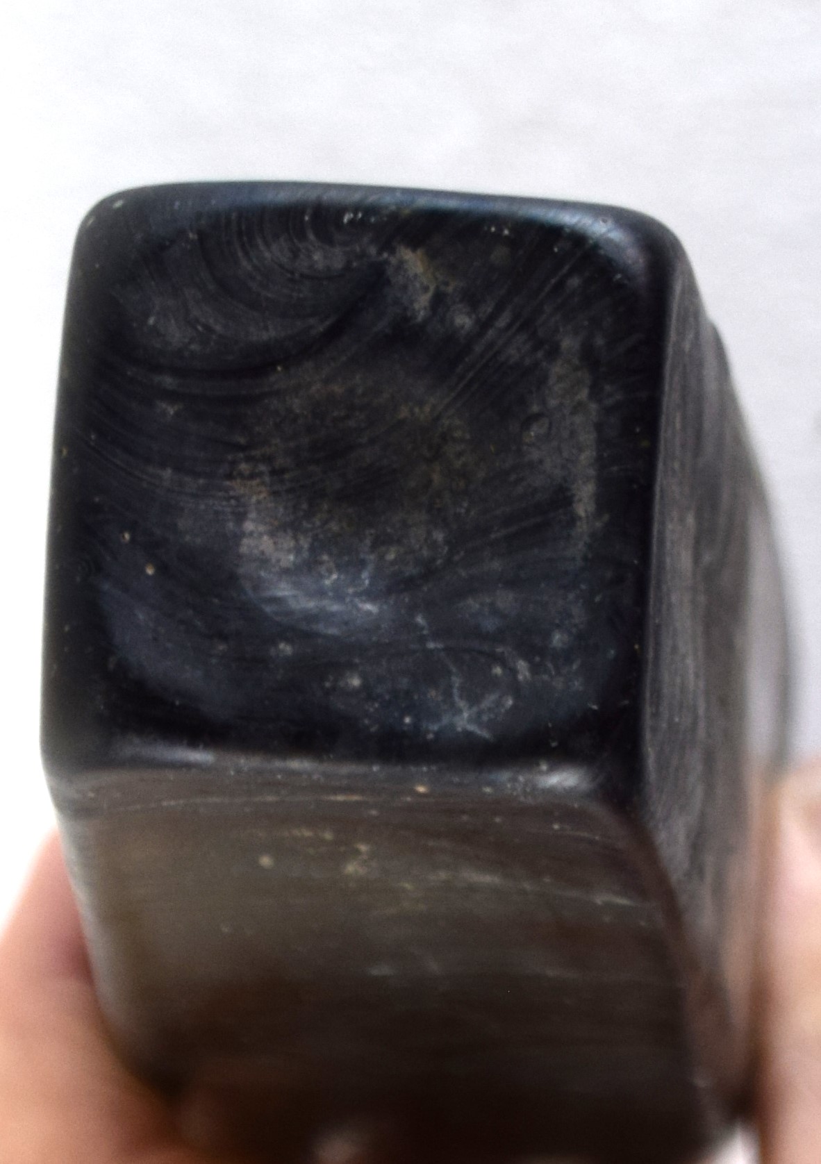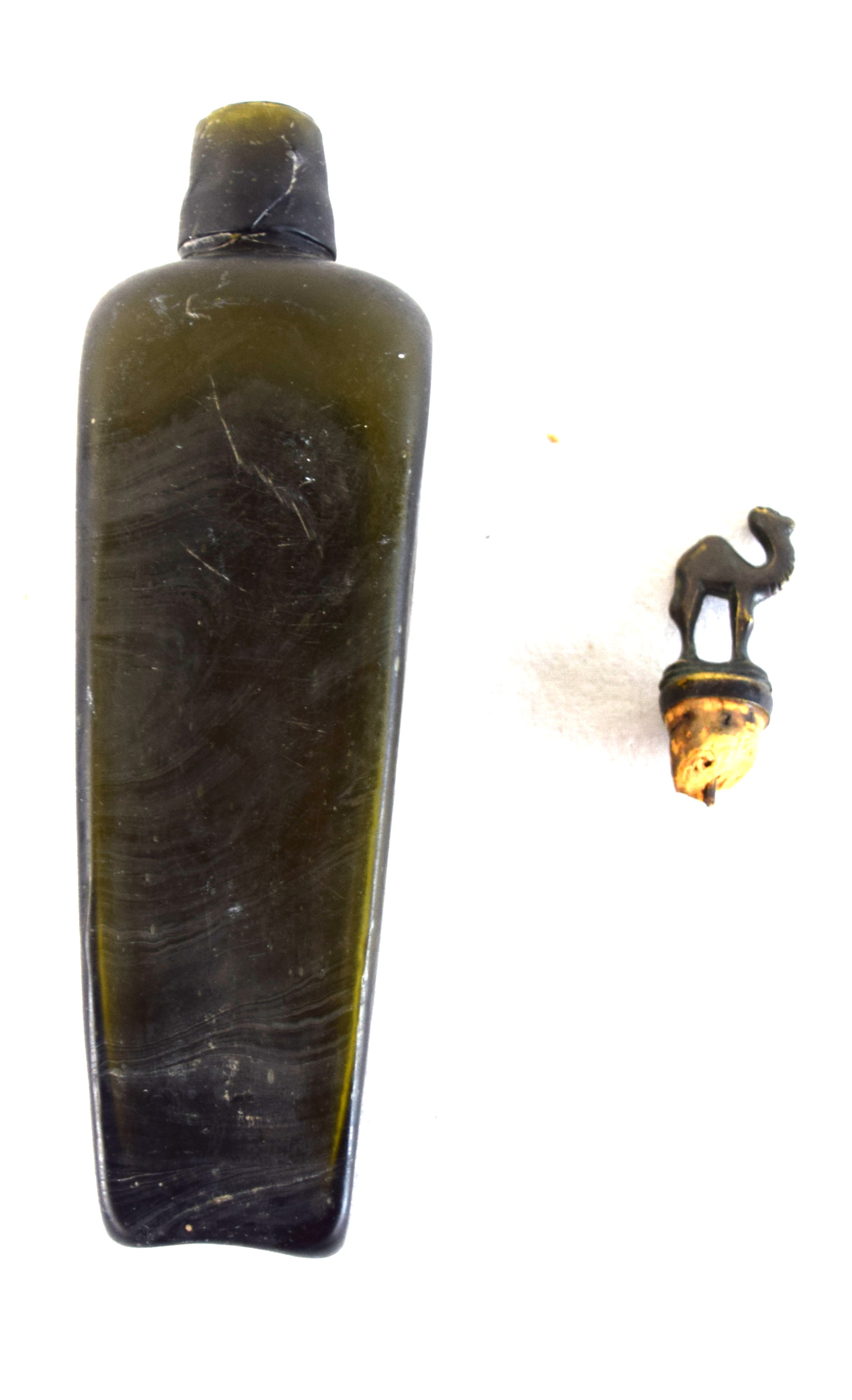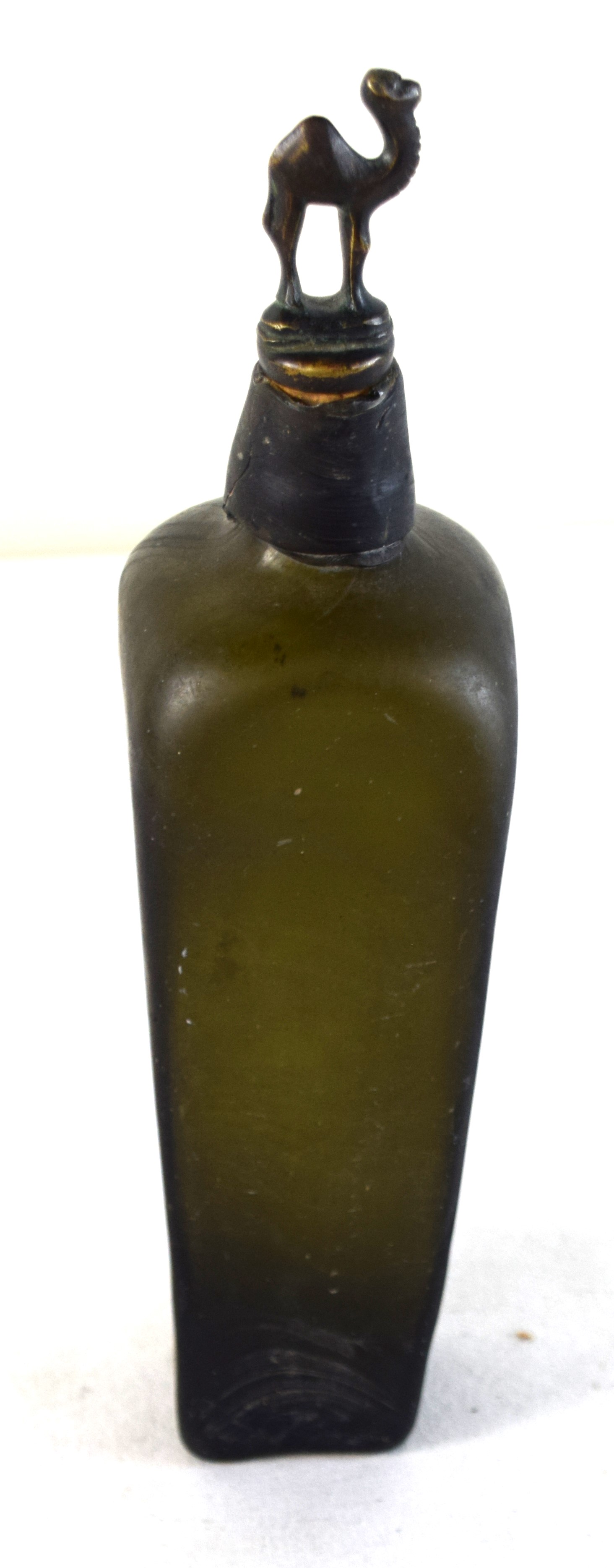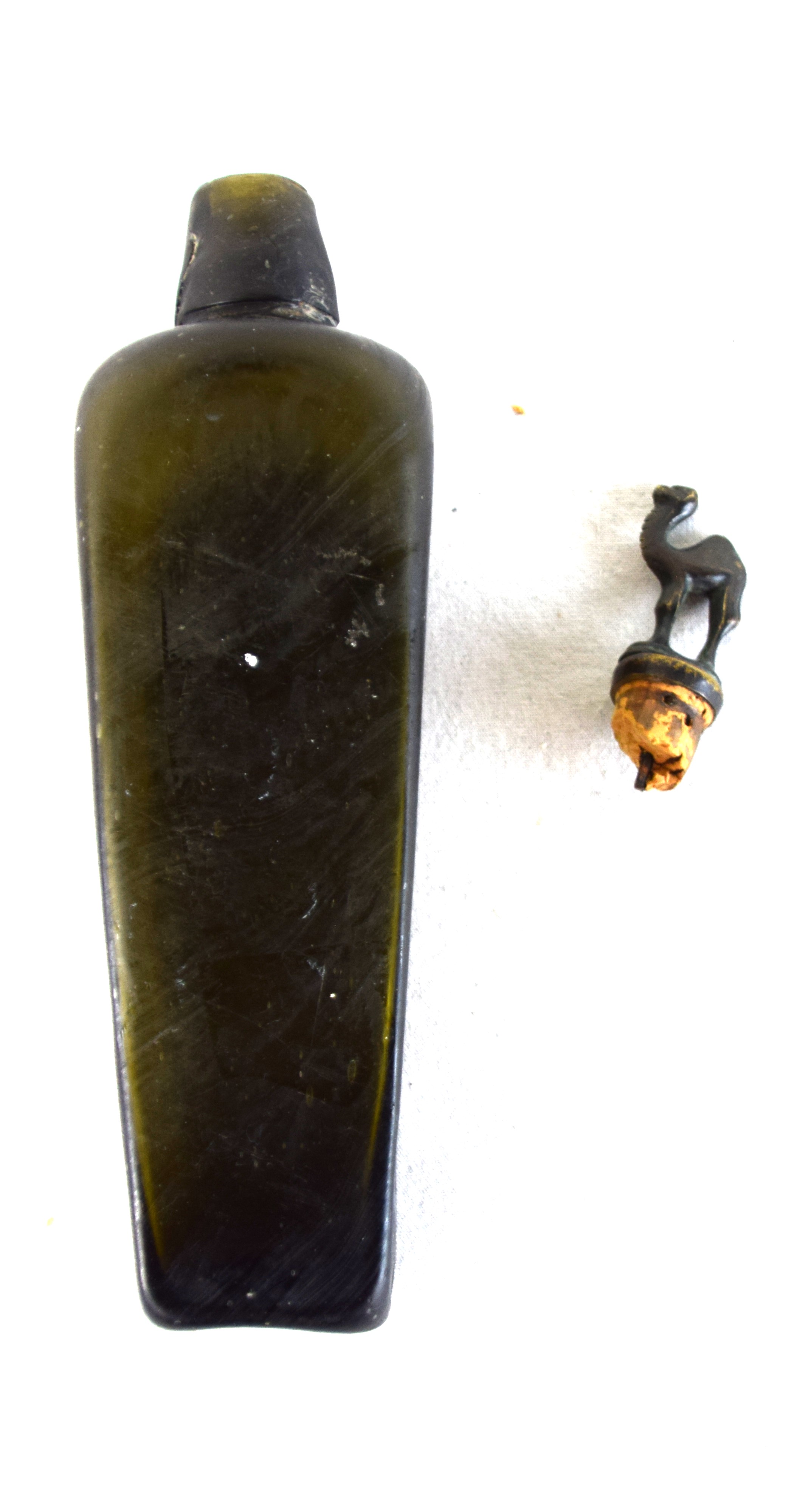 18th or early 19thn century English gin bottle with a camel finial stopper. Dimensions: 10″ H