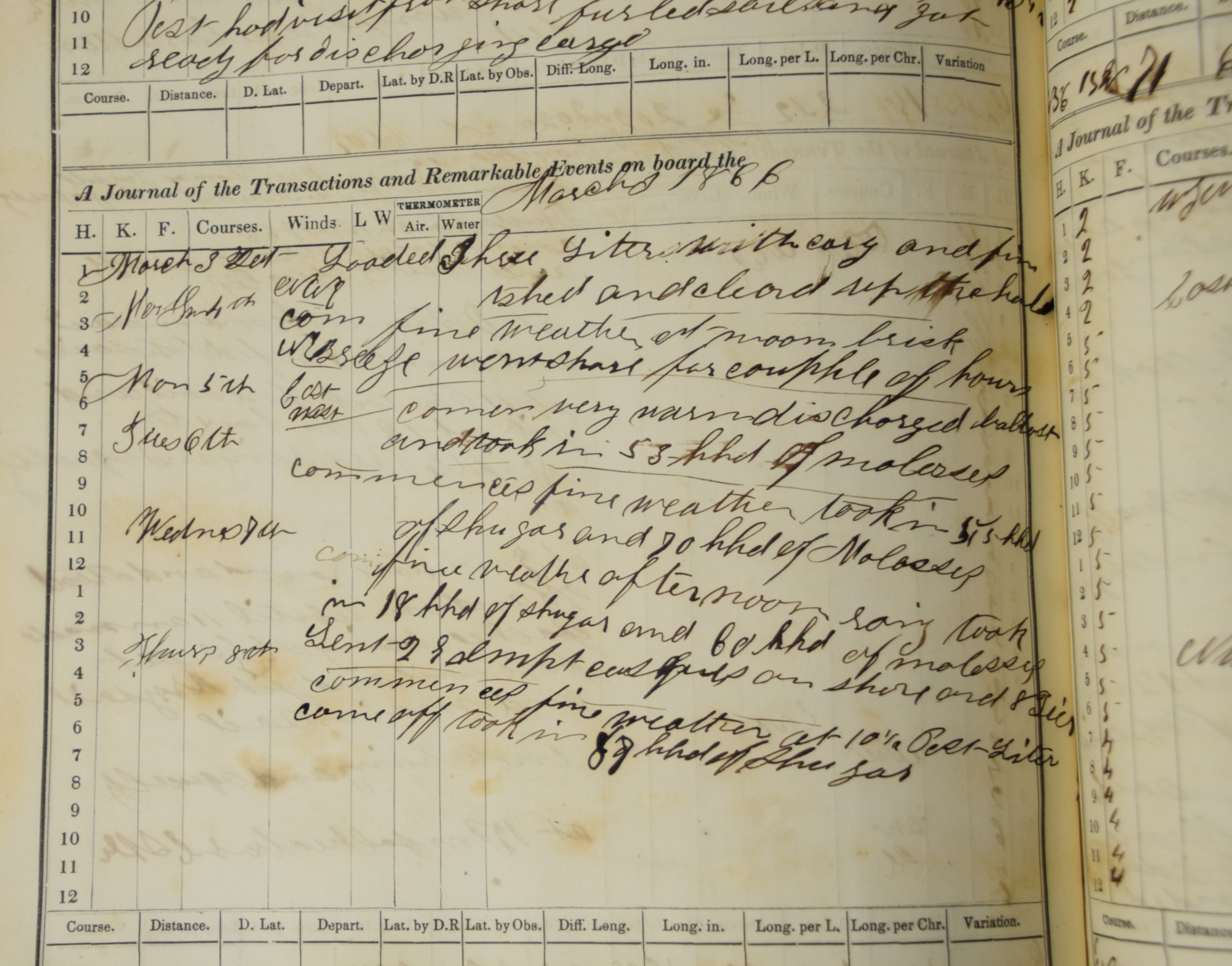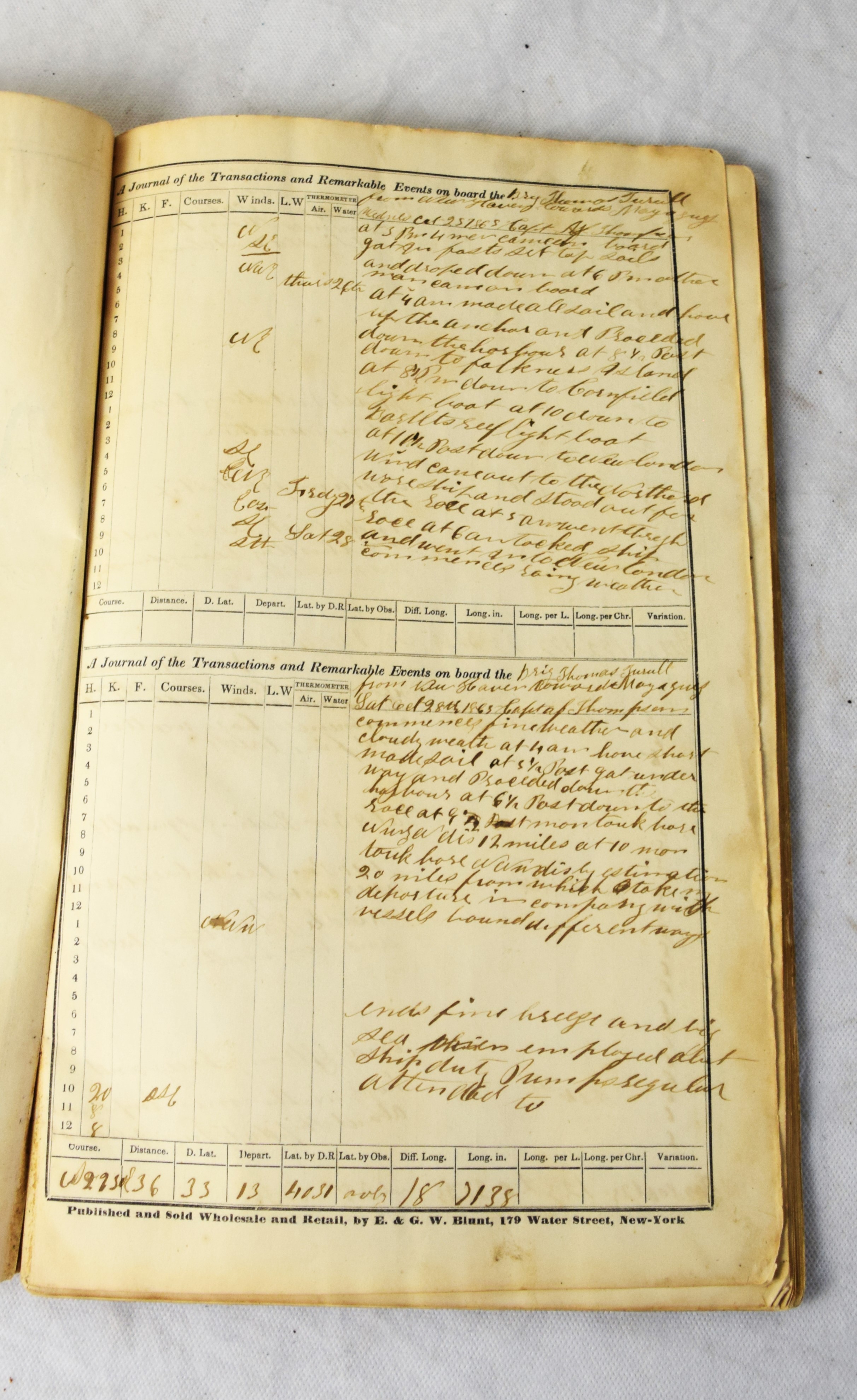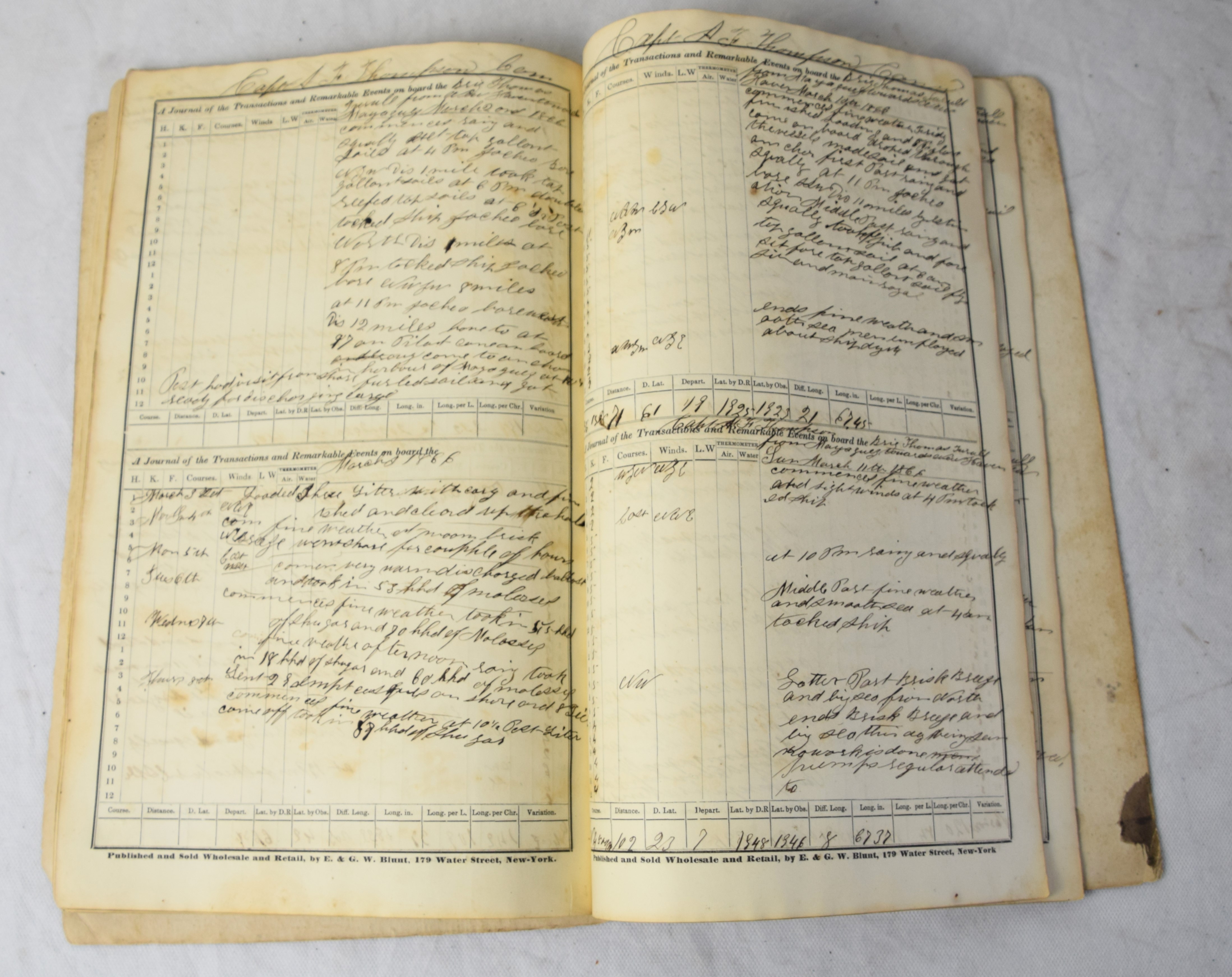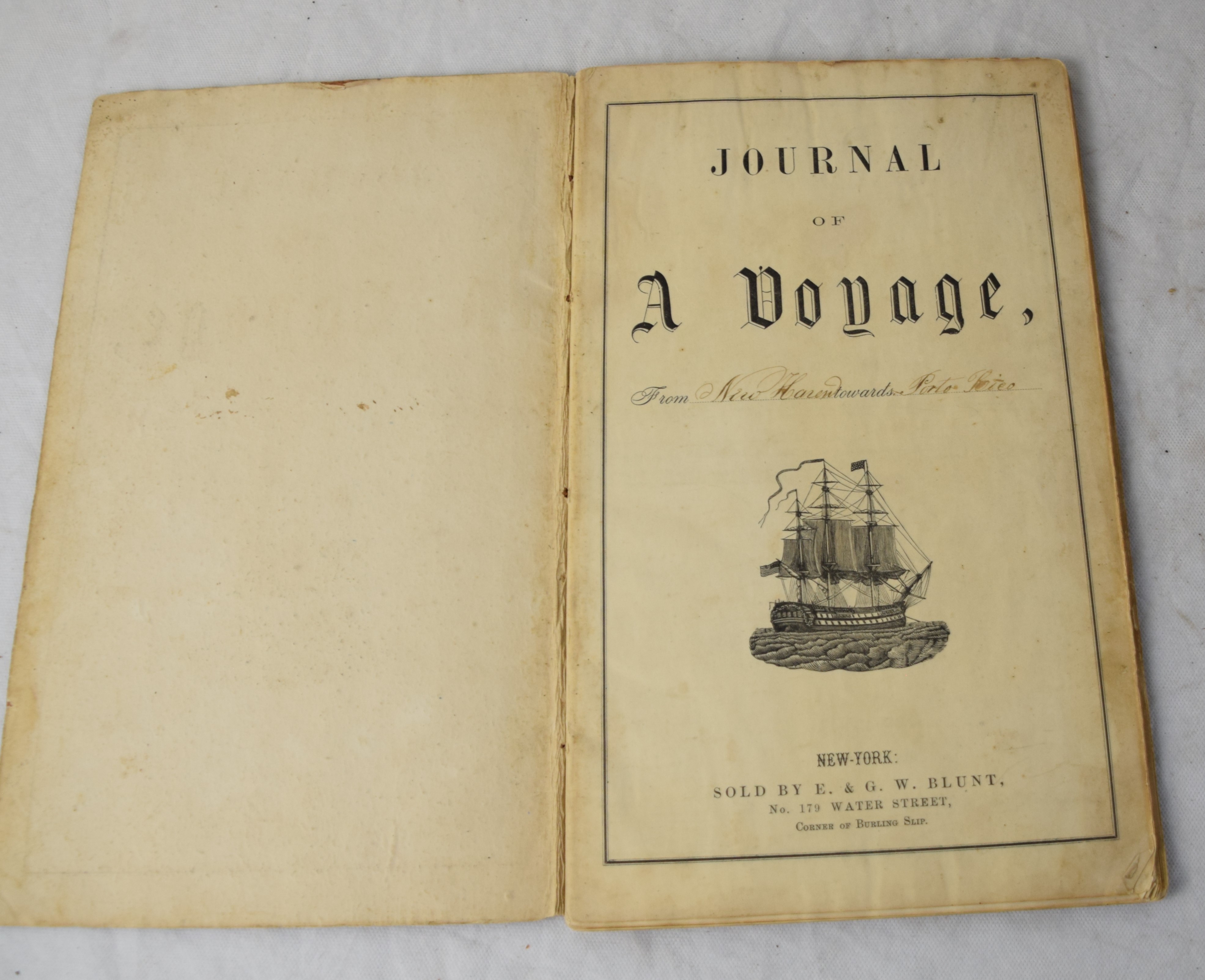 An 1865-66 Ship’s Log of the Brig Thomas Turull commanded by Captain A. F. Thompson sailing from New Haven to Maya Gulf (Mayaguez Porto Rico) to collect molasses and sugar. They left New Haven 25 October 1865 and landed in Mayaguez 15 Jan 1866 and returned to New Haven 8 May 1866.