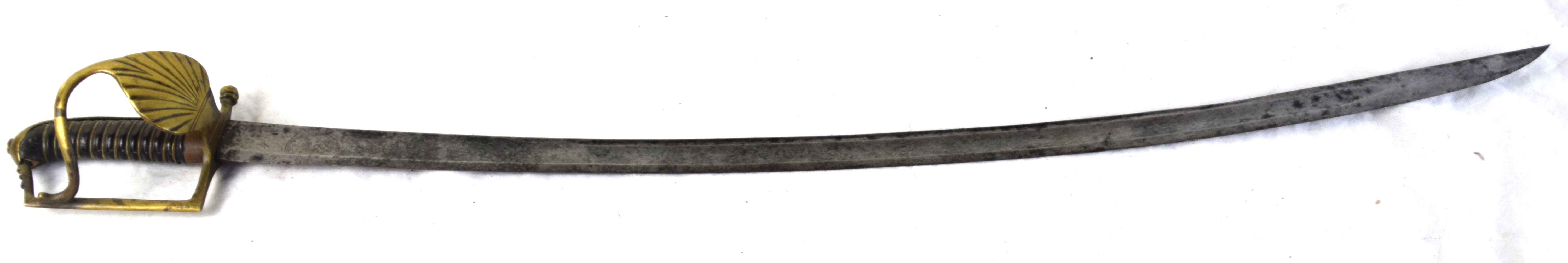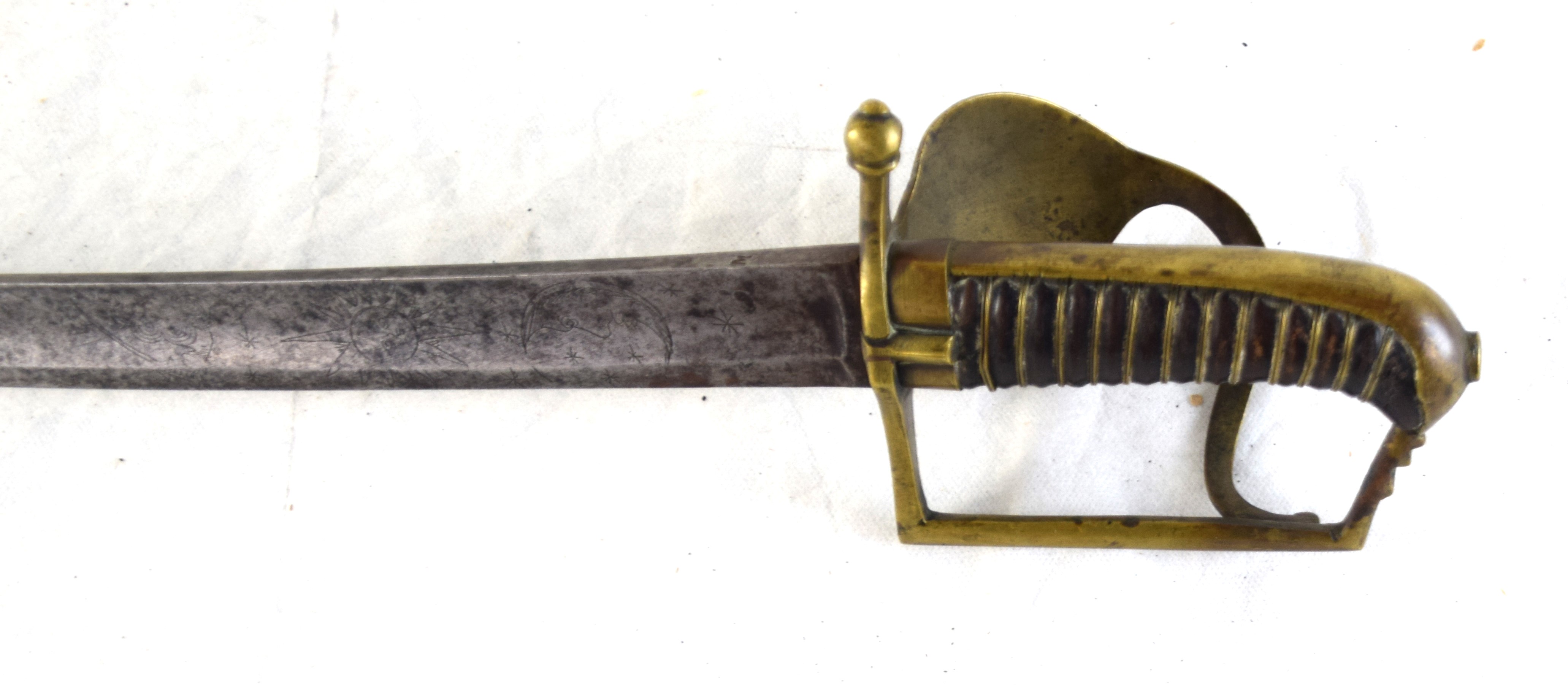 Grenadier saber, possibly Germanic, circa 1760 with an upturned shell guard, bird’s head pommel, semi basket guard and a moon and sun design on the blade. Dimensions: 34″ Blade, 40″ Overall