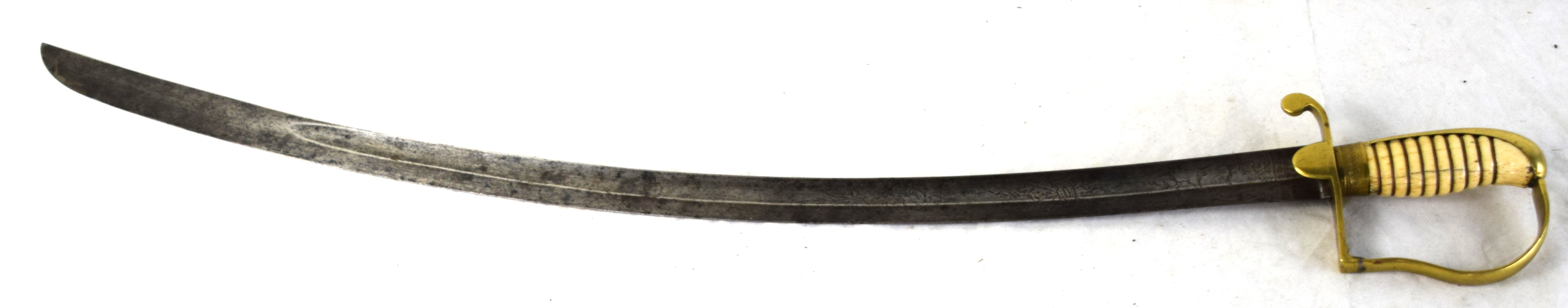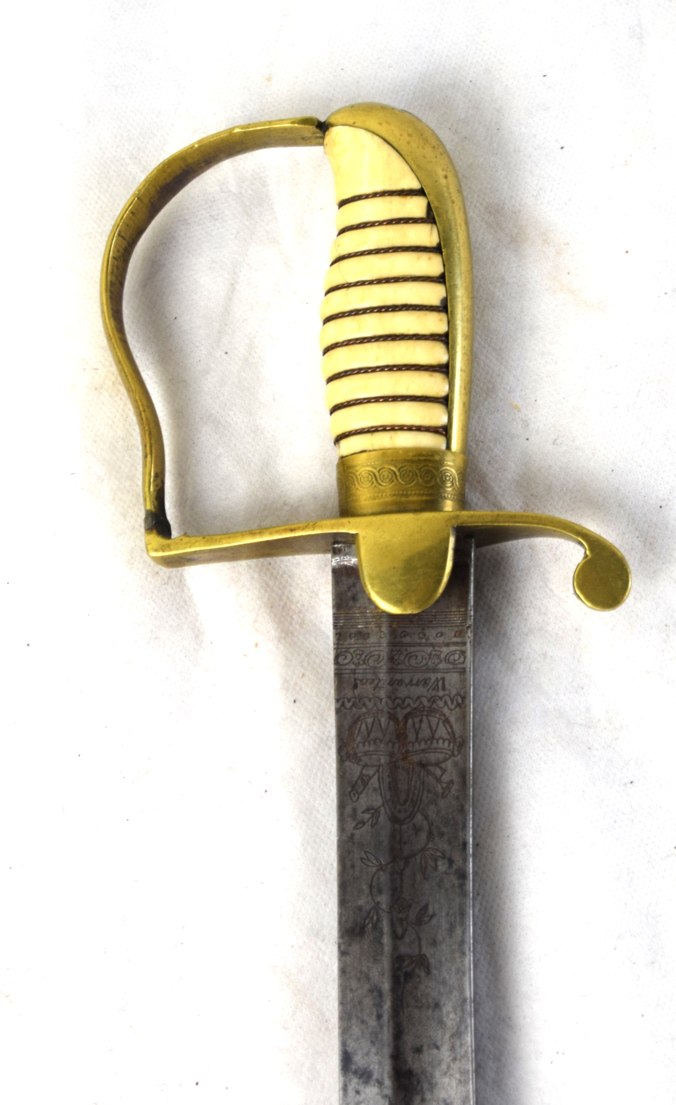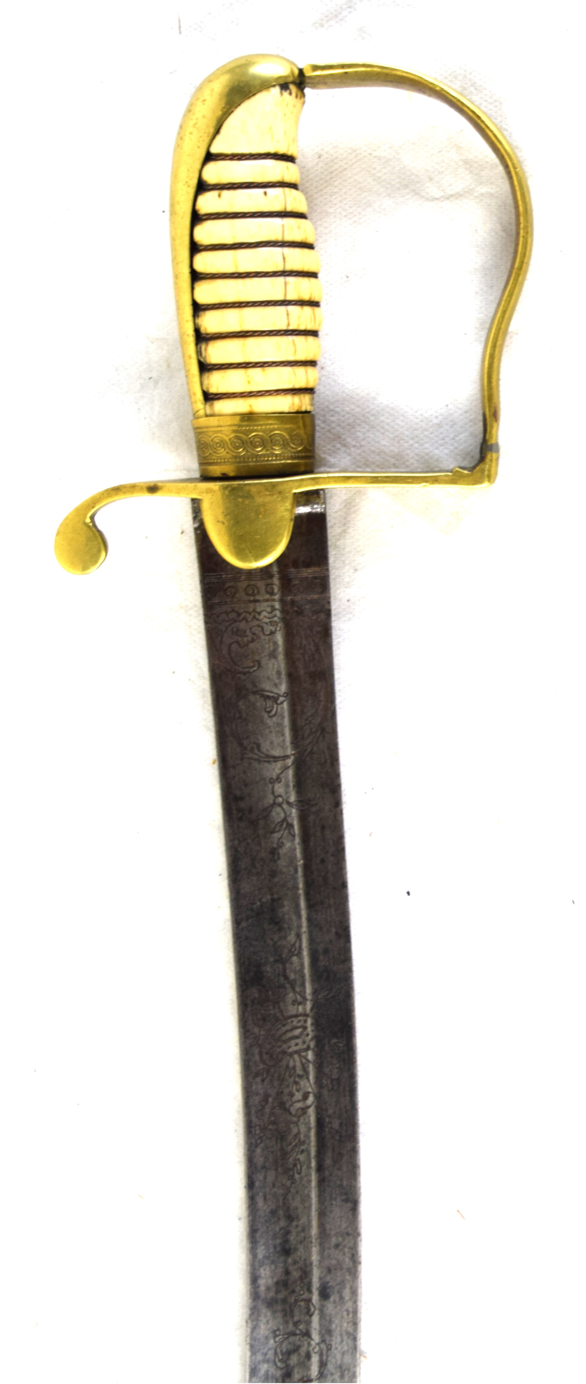 American, mounted artillery officer’s saber/light artillery saber used in the War of 1812. Has a bone and wire wrap grip, marked “Warranted” 3″ from base and several designs on blade. Dimensions: 29.5″ Blade, 33.5″ Overall