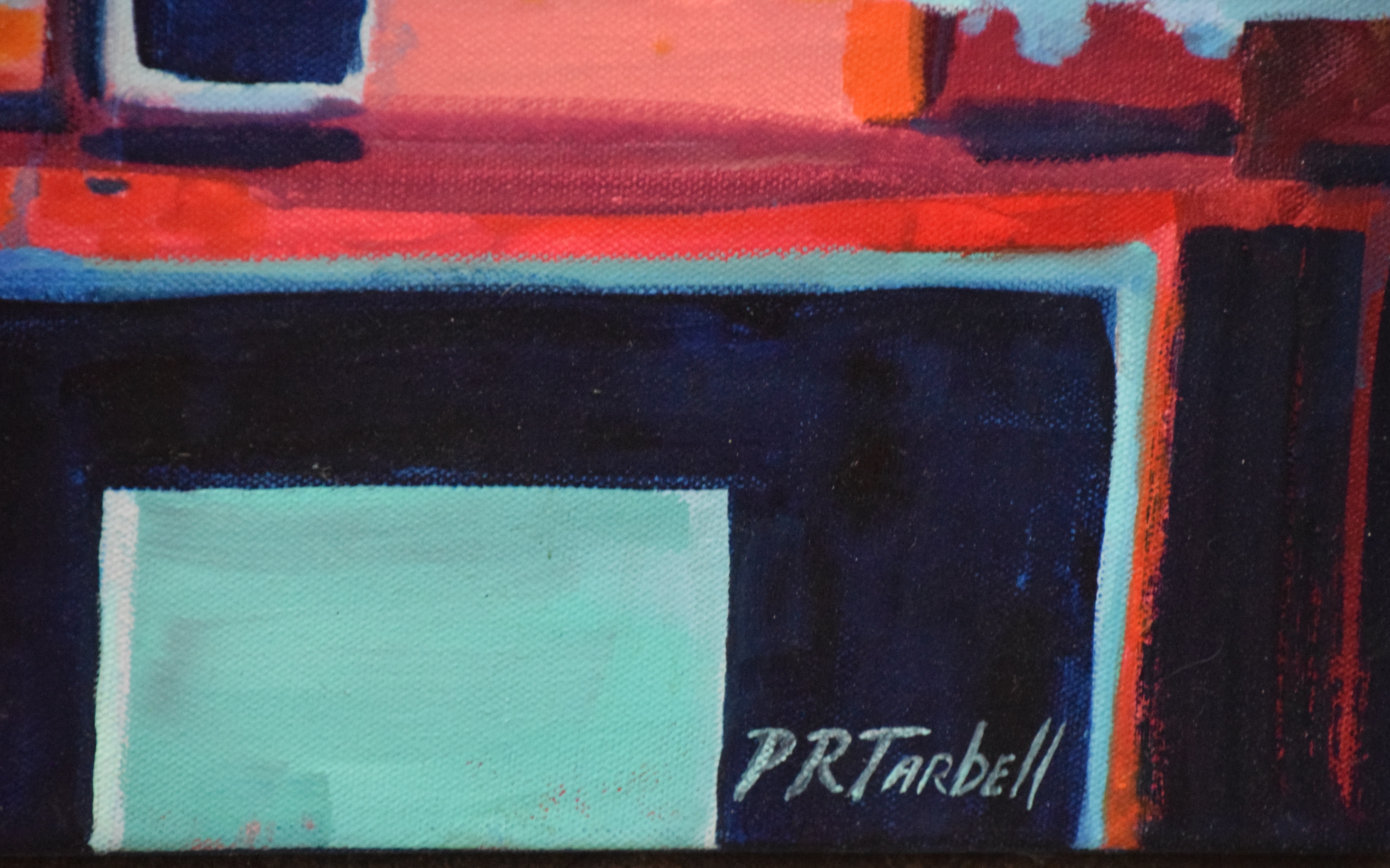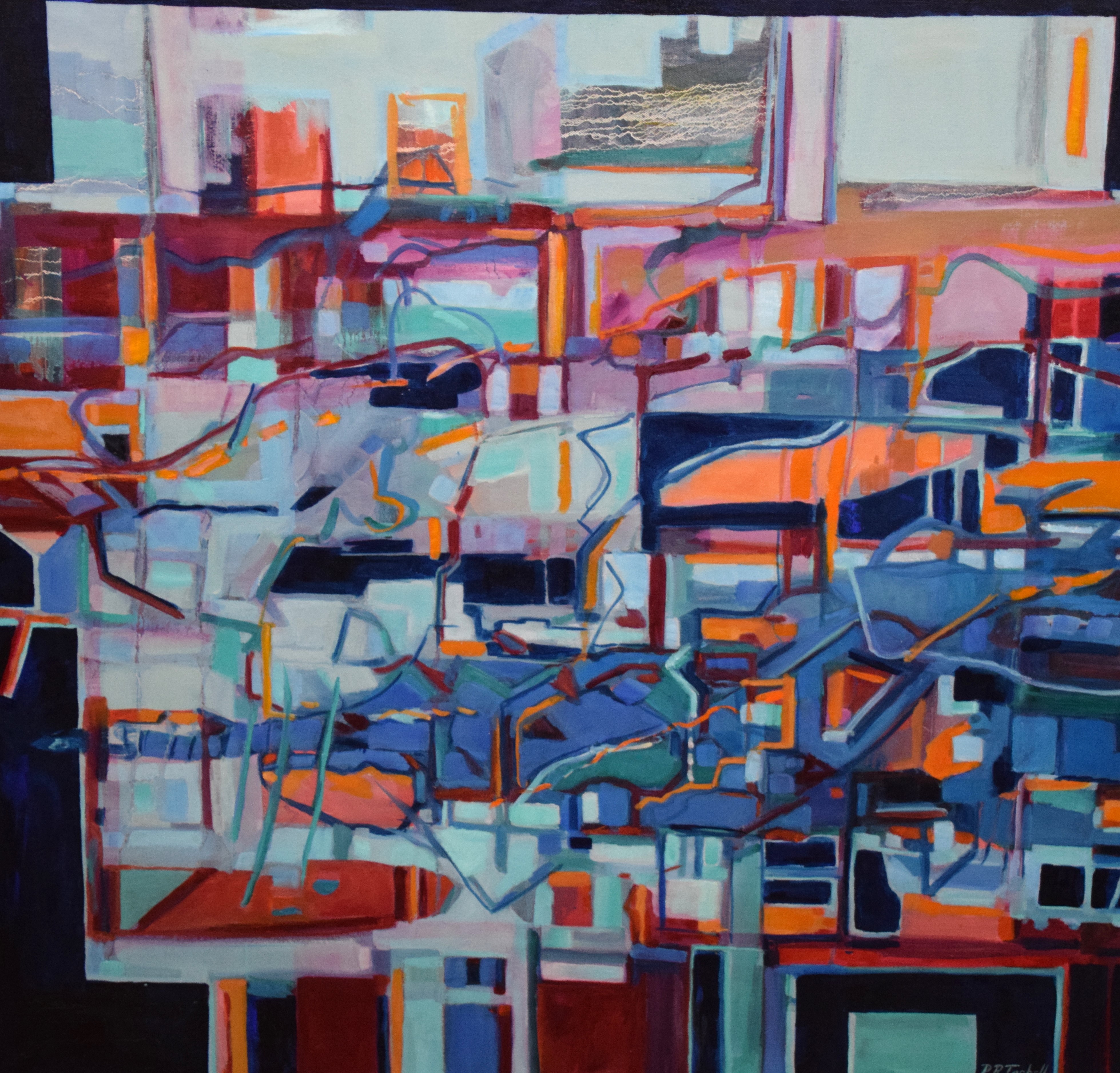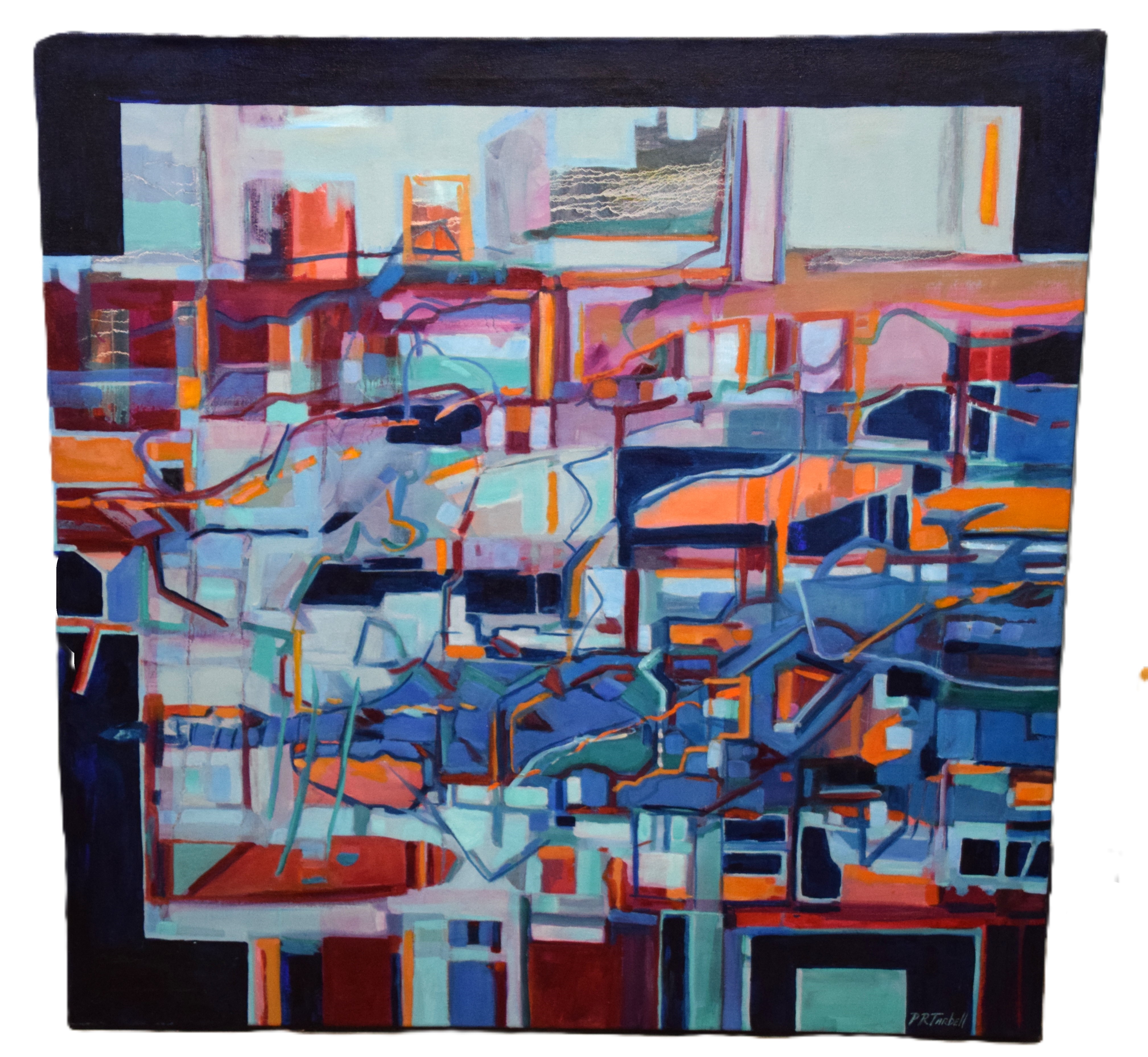 Unframed oil on canvas of an abstract painting incorporating many shapes, signed lower right, Pam Tarbell and titled “Journey”. Pam Tarbell is a listed artist from Concord NH who has exhibited in New England galleries and is known for vibrant colors in her painting. Dimensions: 36″ x 36″
