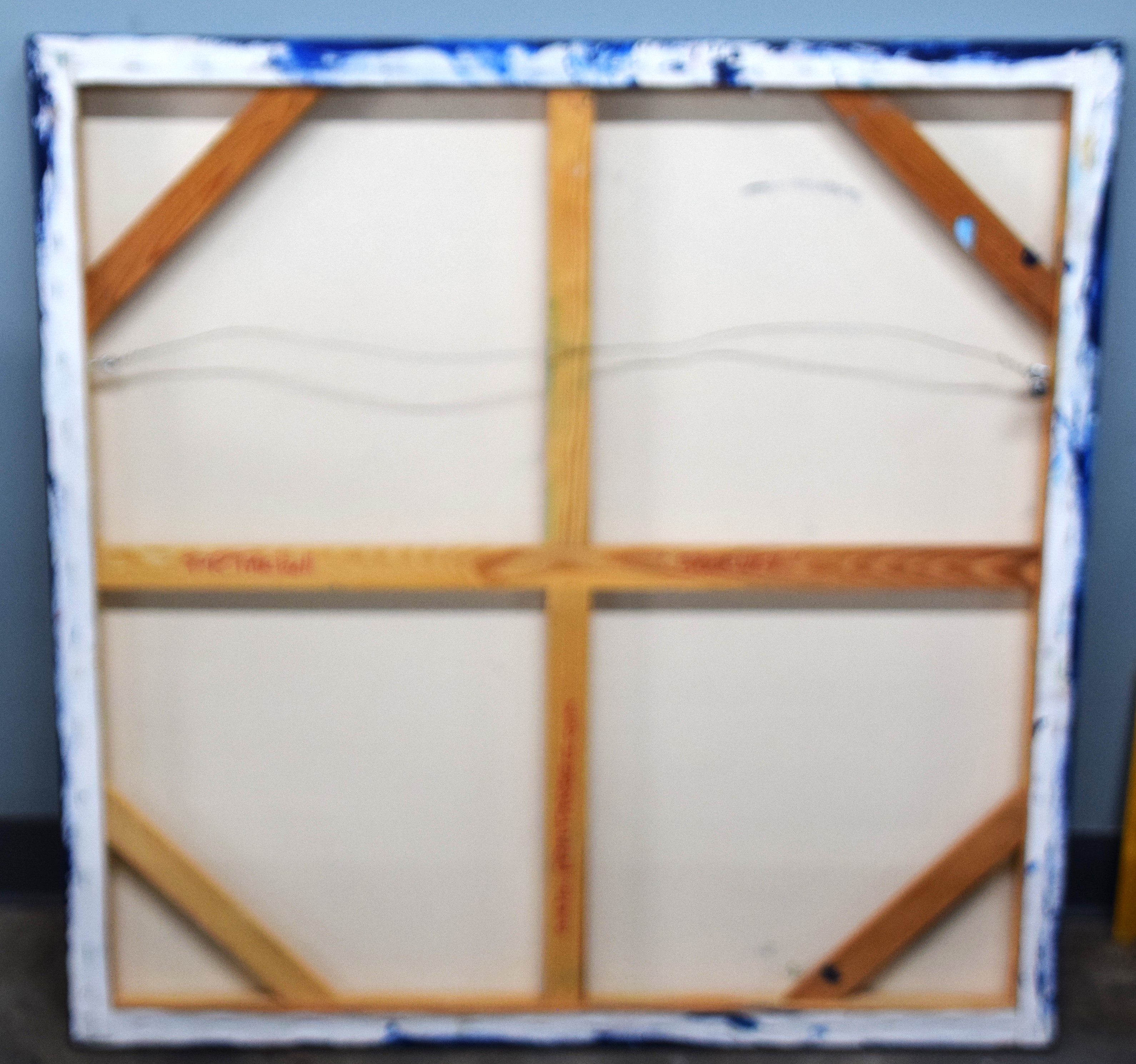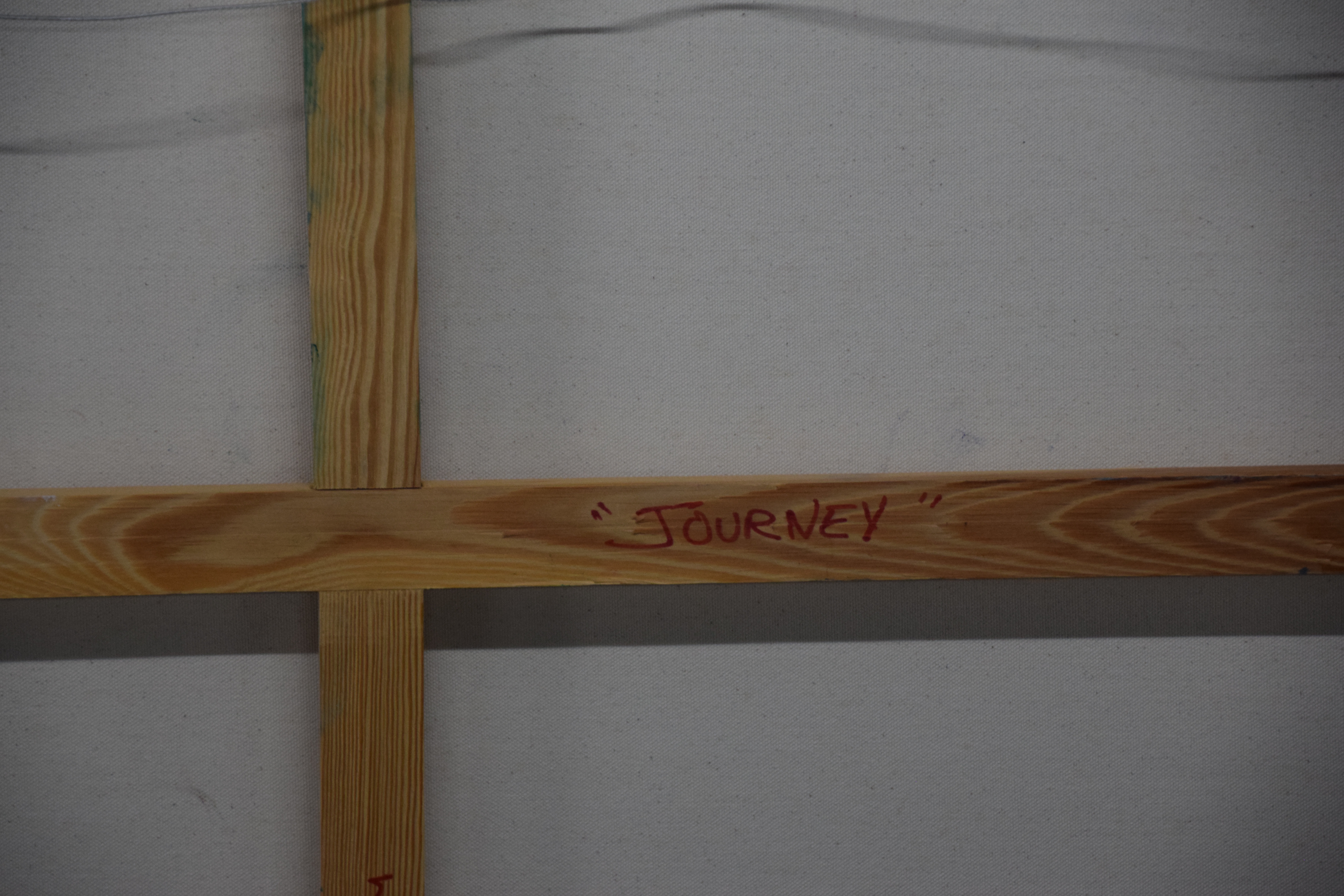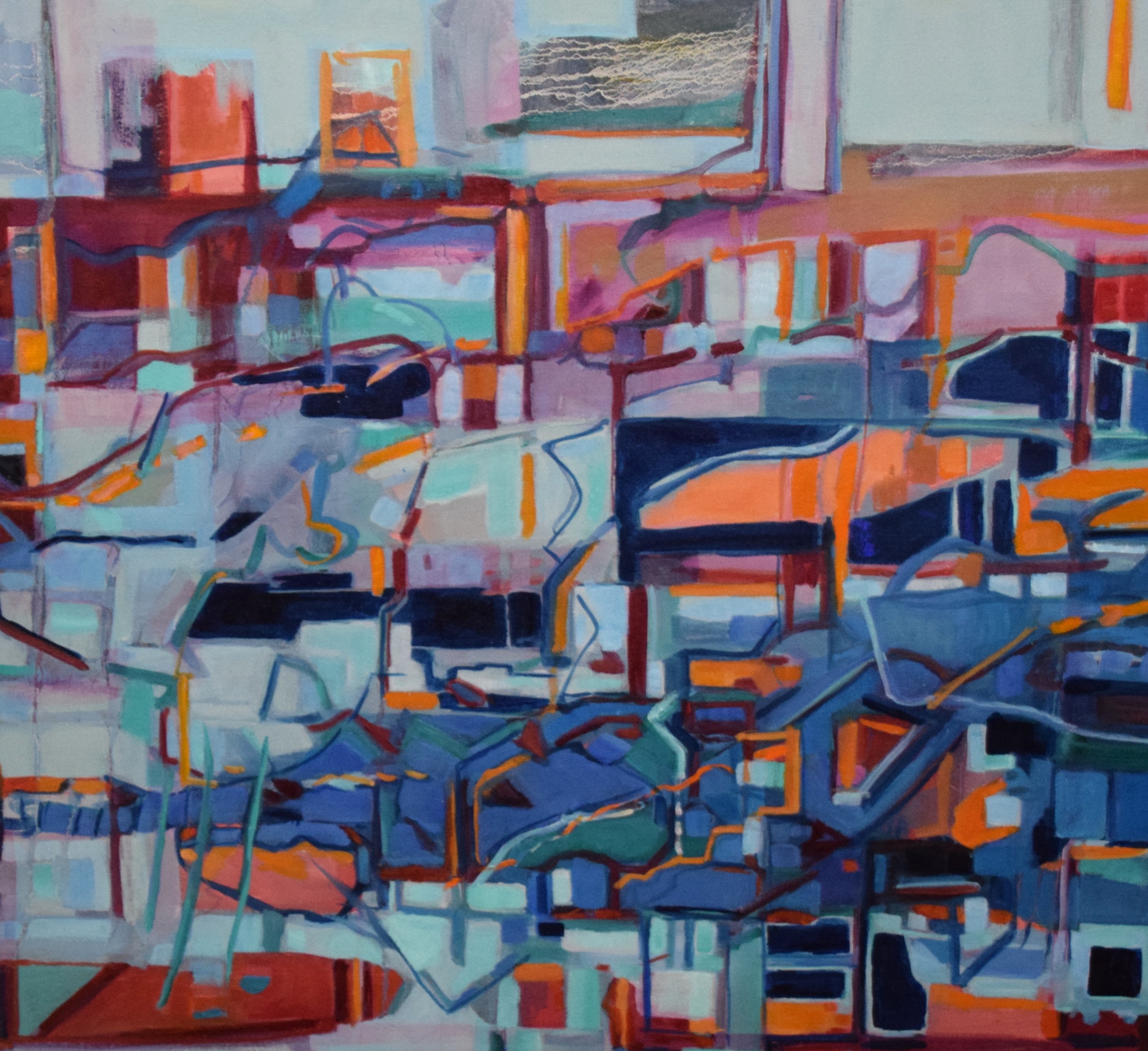 Unframed oil on canvas of an abstract painting incorporating many shapes, signed lower right, Pam Tarbell and titled “Journey”. Pam Tarbell is a listed artist from Concord NH who has exhibited in New England galleries and is known for vibrant colors in her painting. Dimensions: 36″ x 36″