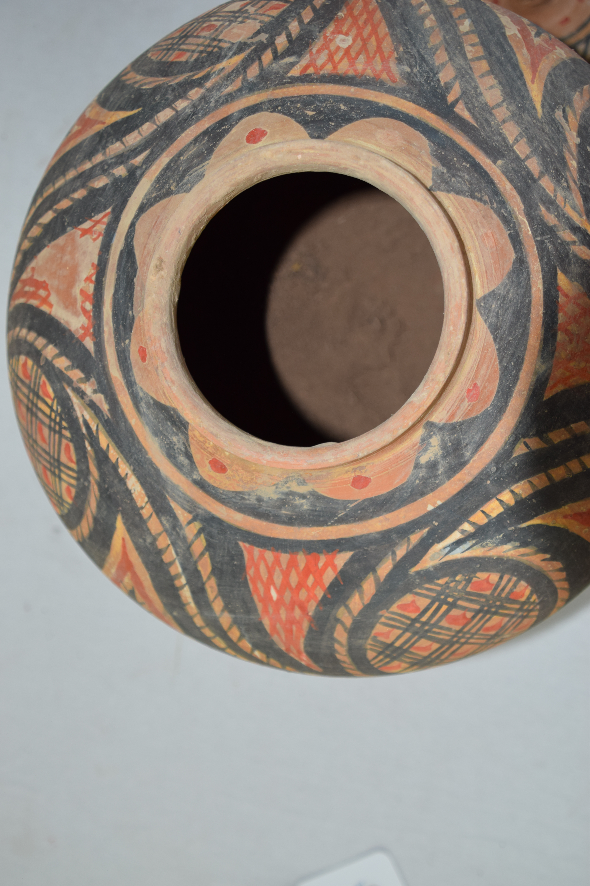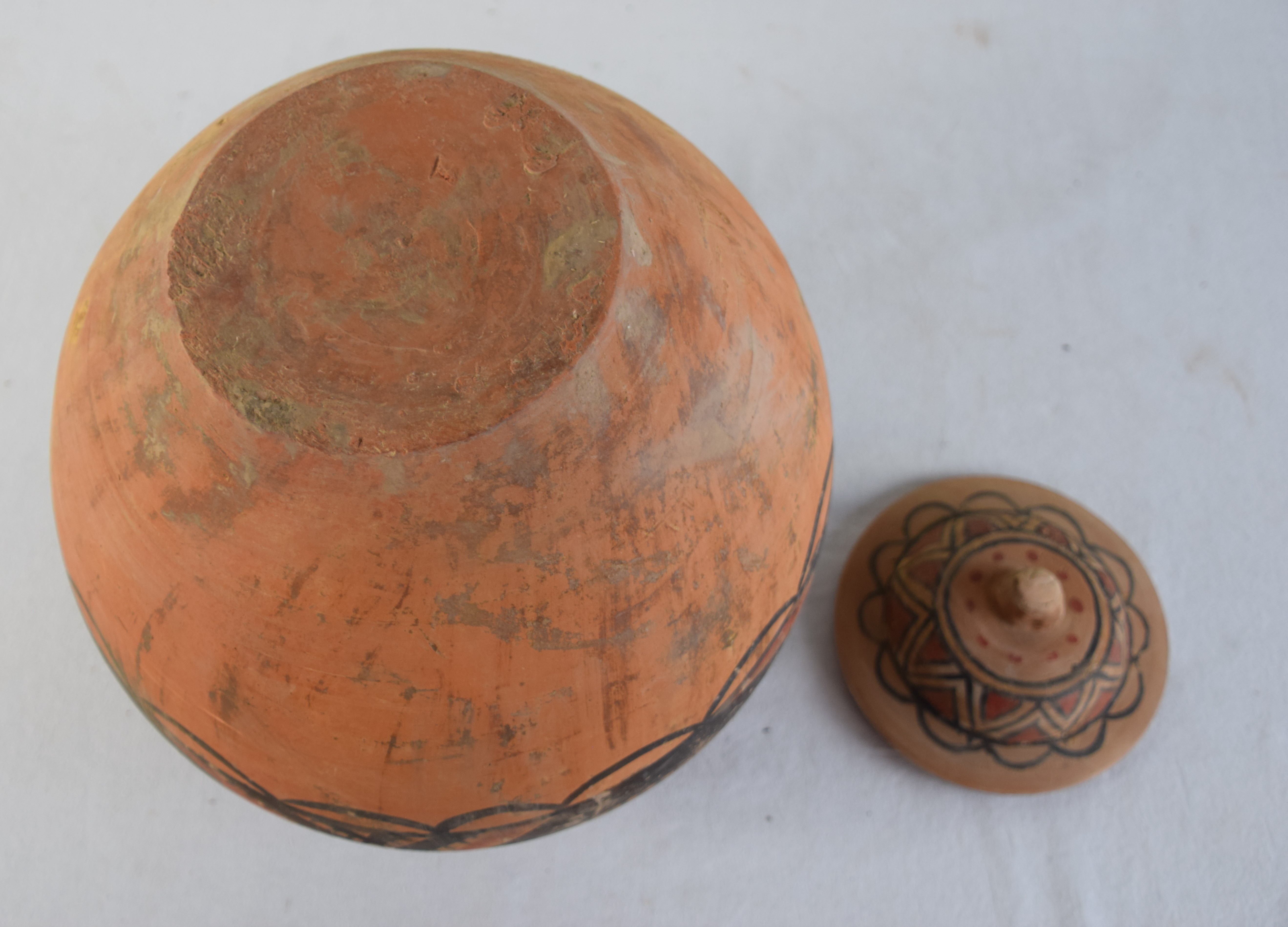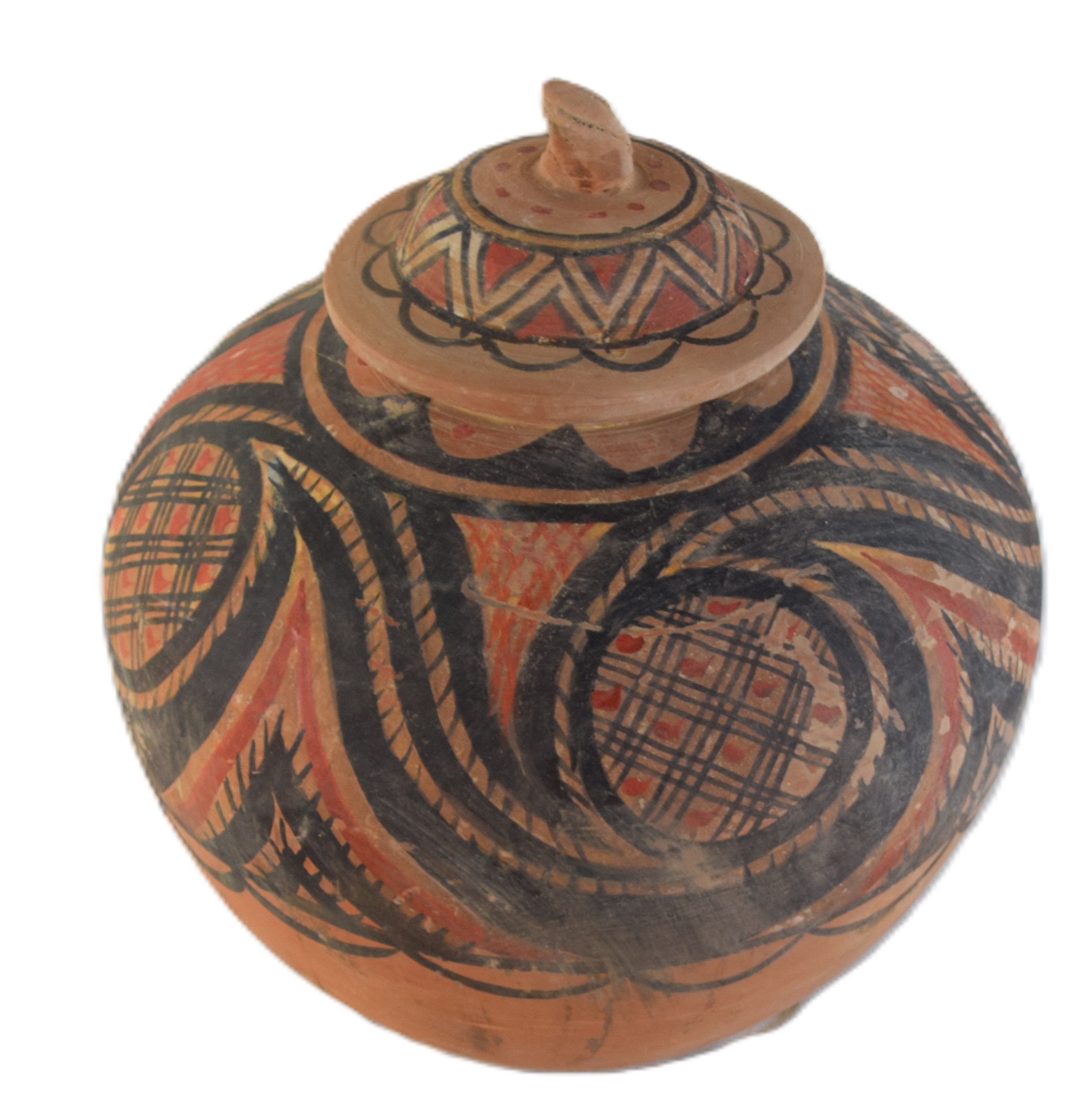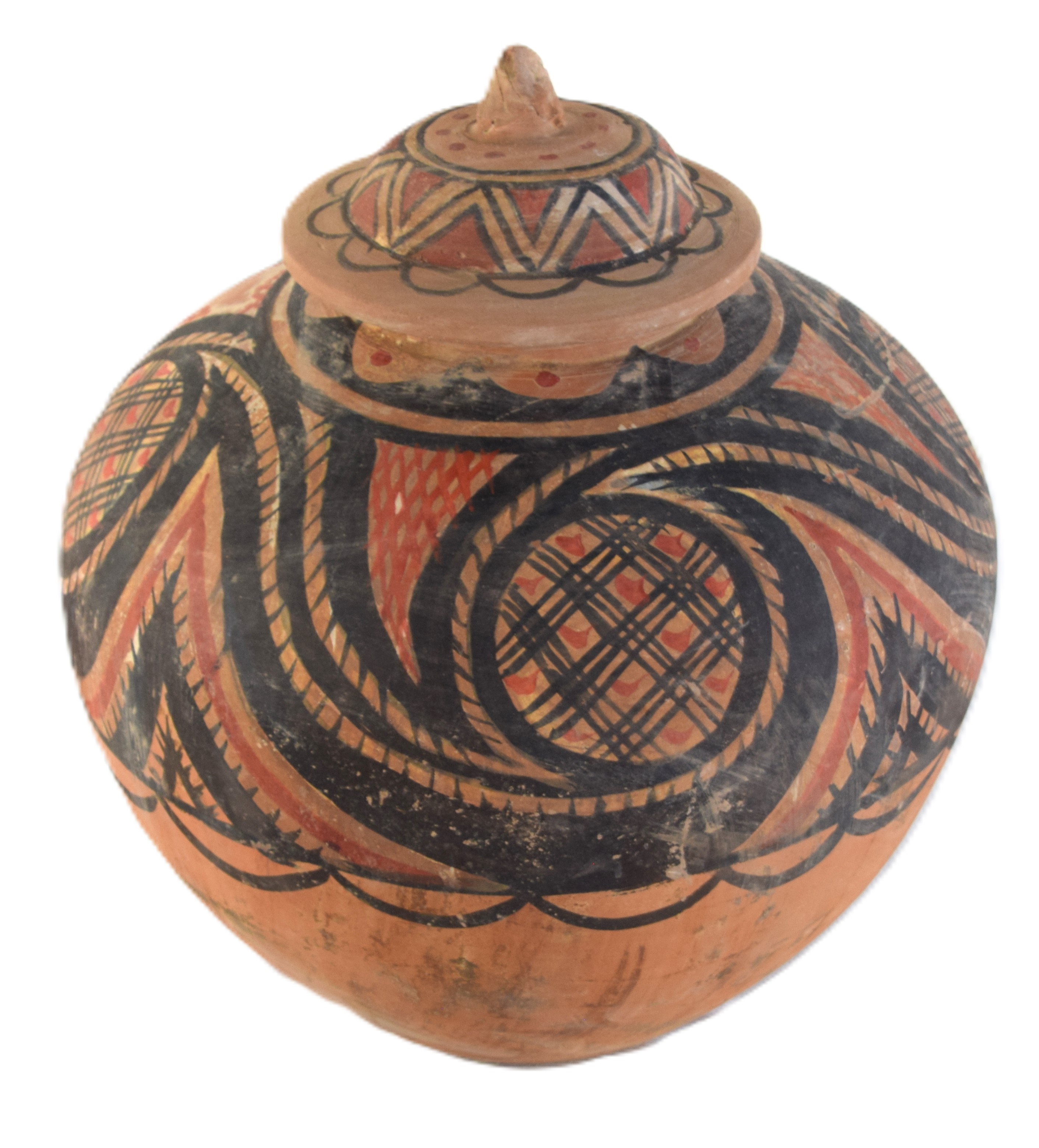 Large Chinese painted earthen/clay pot with lid in a round form with decorations. Dimensions: 15″ H x 14″ W