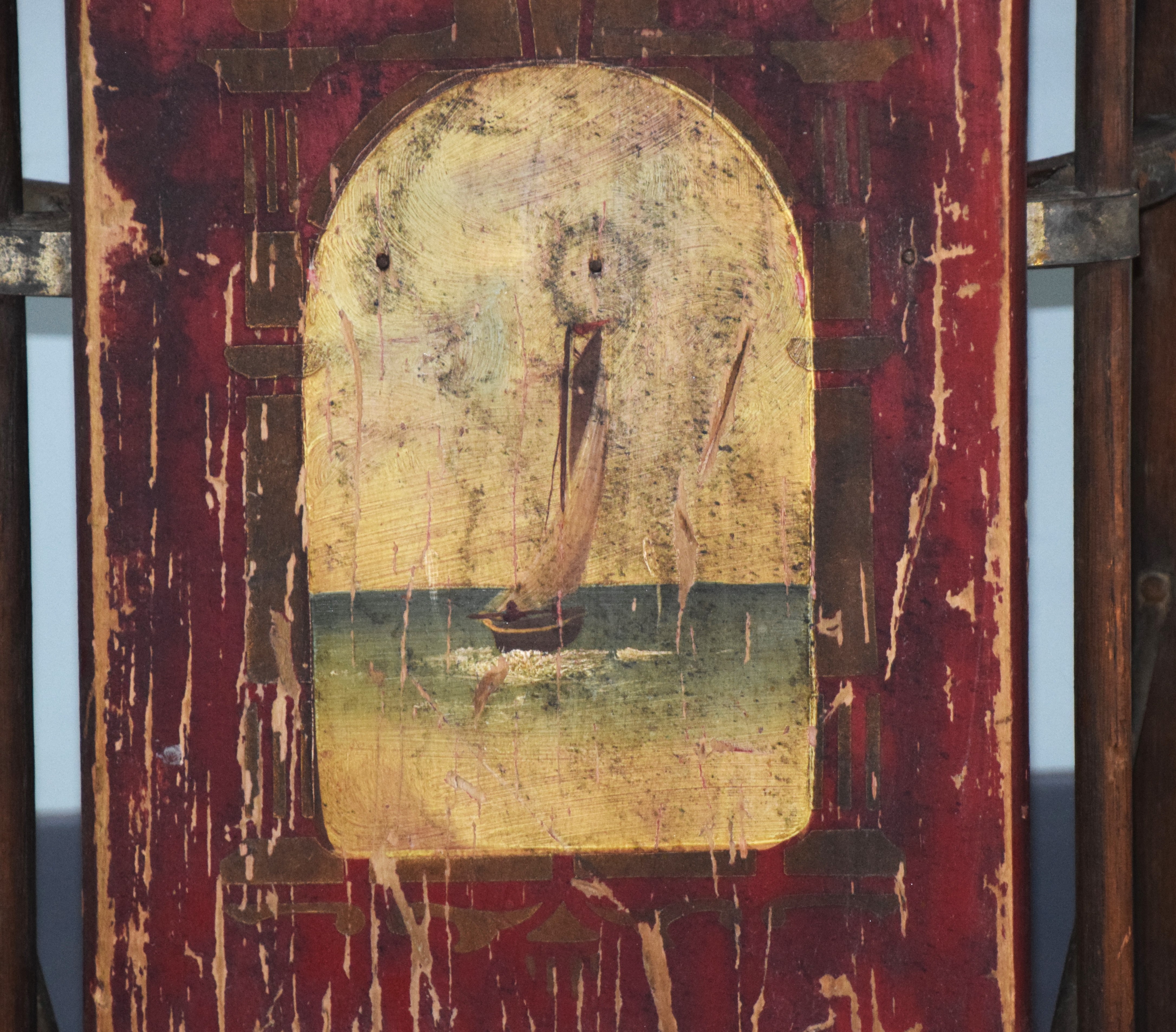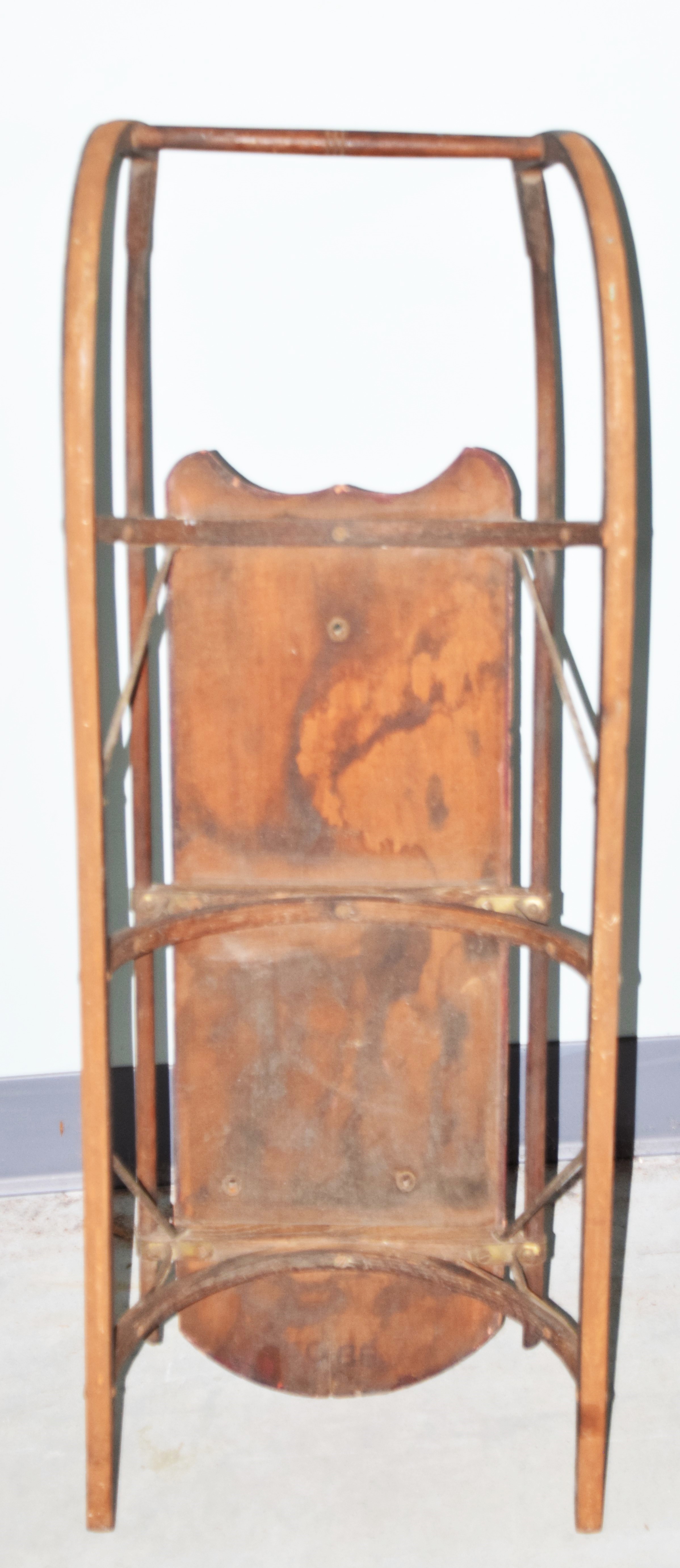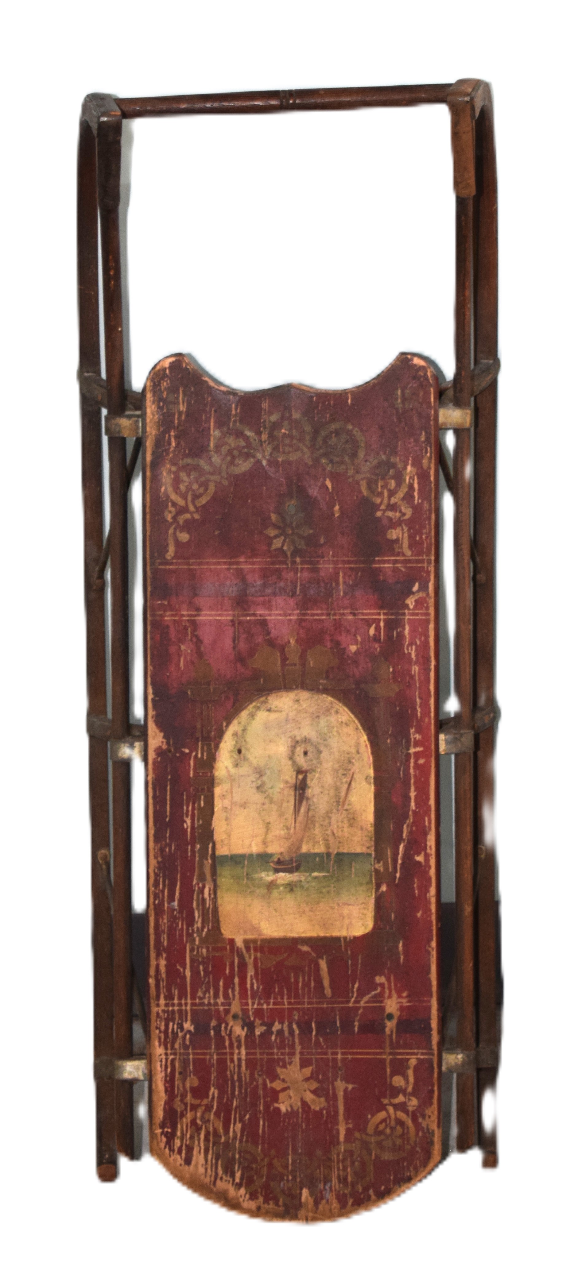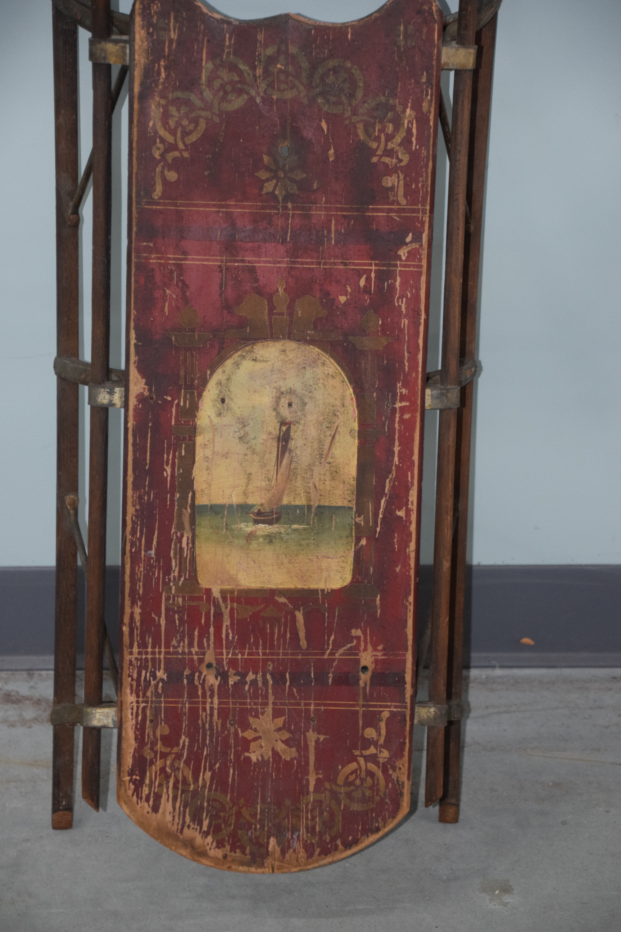 Rare sled attributed to Paris Mfg. Co. with hand painted sailboat, stenciled 980 on bottom, circa 1895-1925. Dimensions: 34″ L