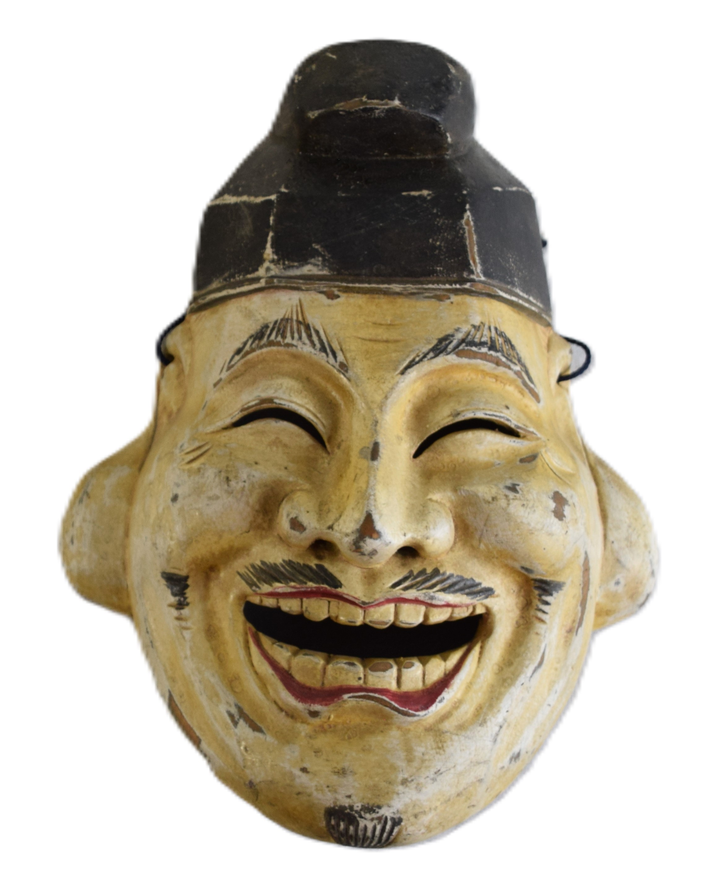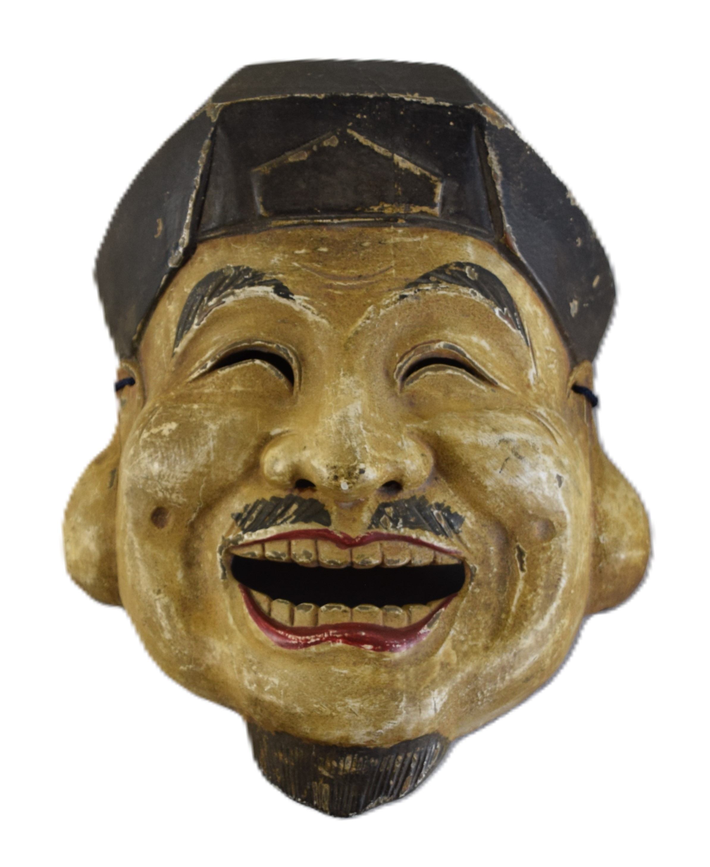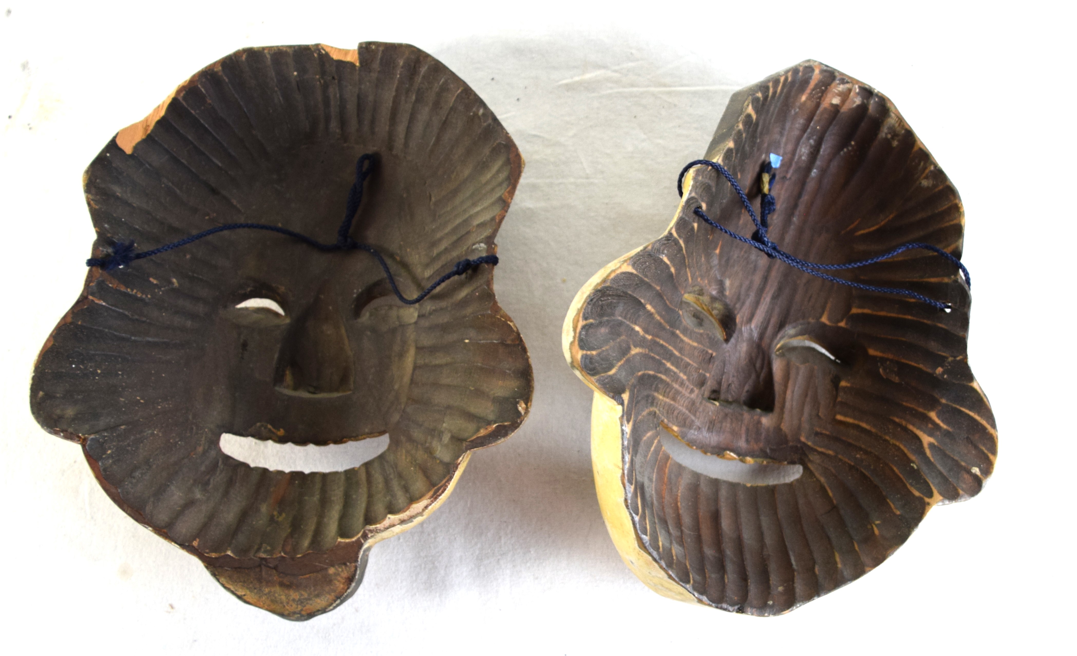 Two carved wooded Asian masks, all painted believed to be 100 years old. Dimensions: 9″ H x 7″ W and 10″ x 8″