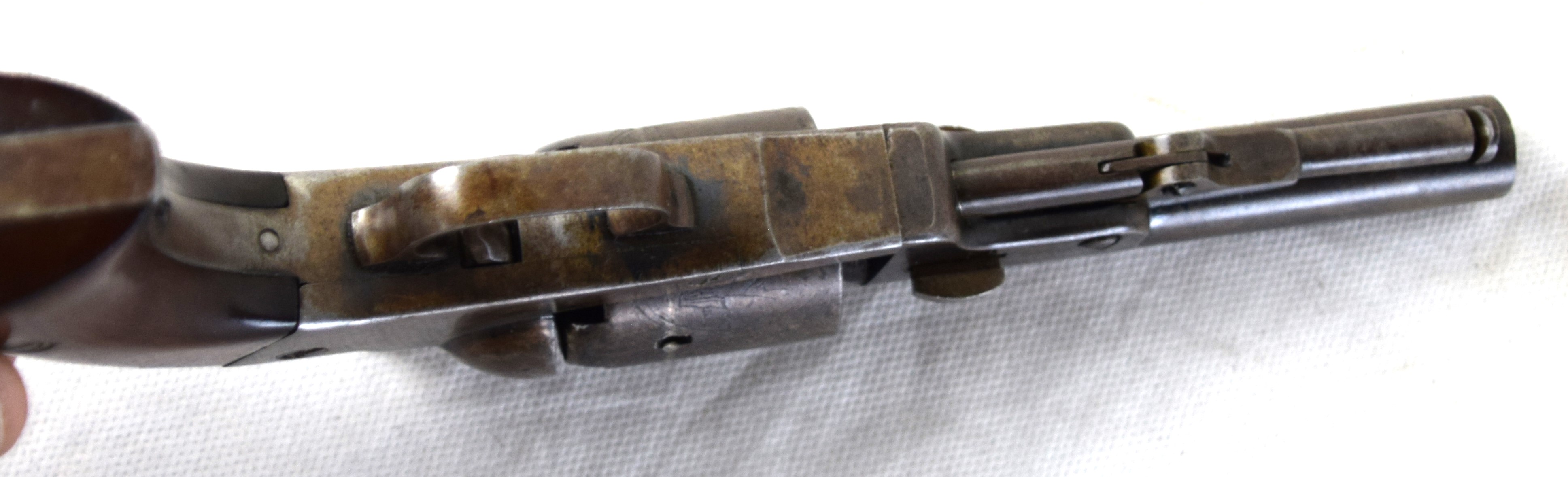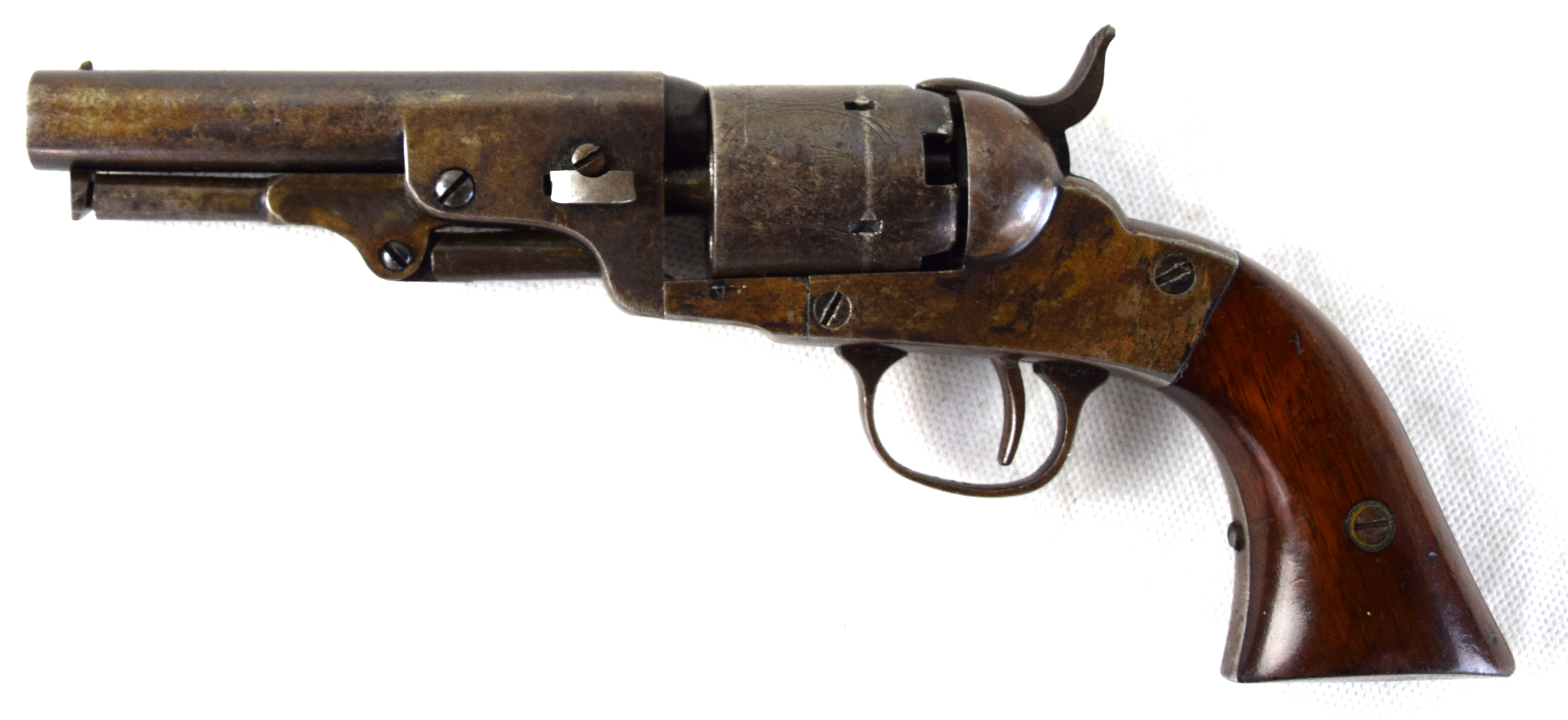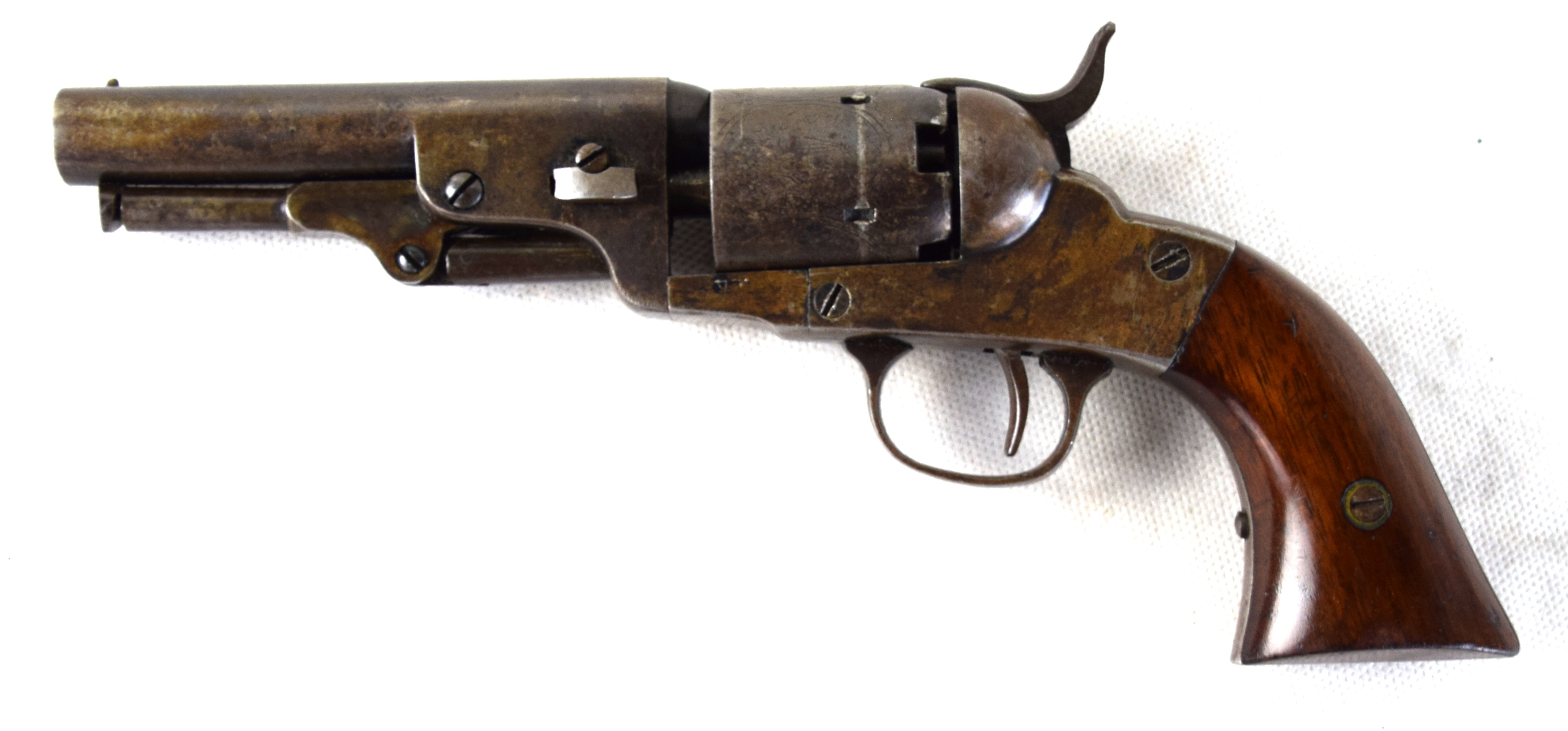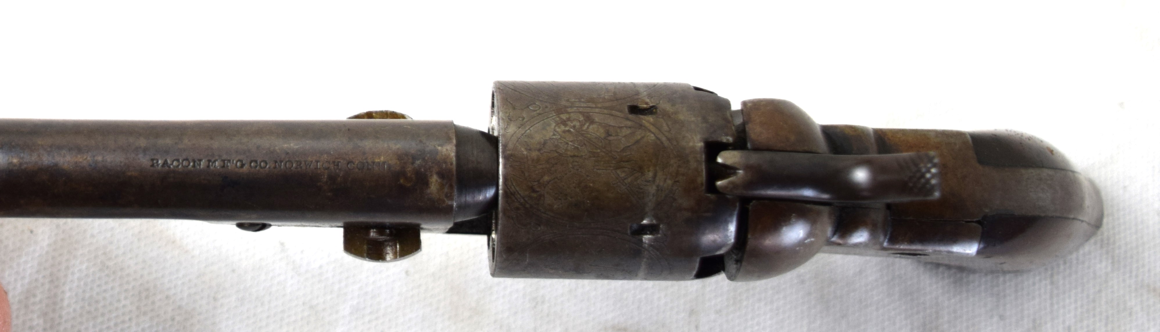Rare Bacon Mfg. Co. pocket revolver circa 1860, 32 caliber, 5 shot percussion. Four inch barrel marked ” BACON mfg. CO NORWICH CONN”. Production of this model was cut short by Smith & Wesson due to a patent infringement. Maybe 200 were produced.