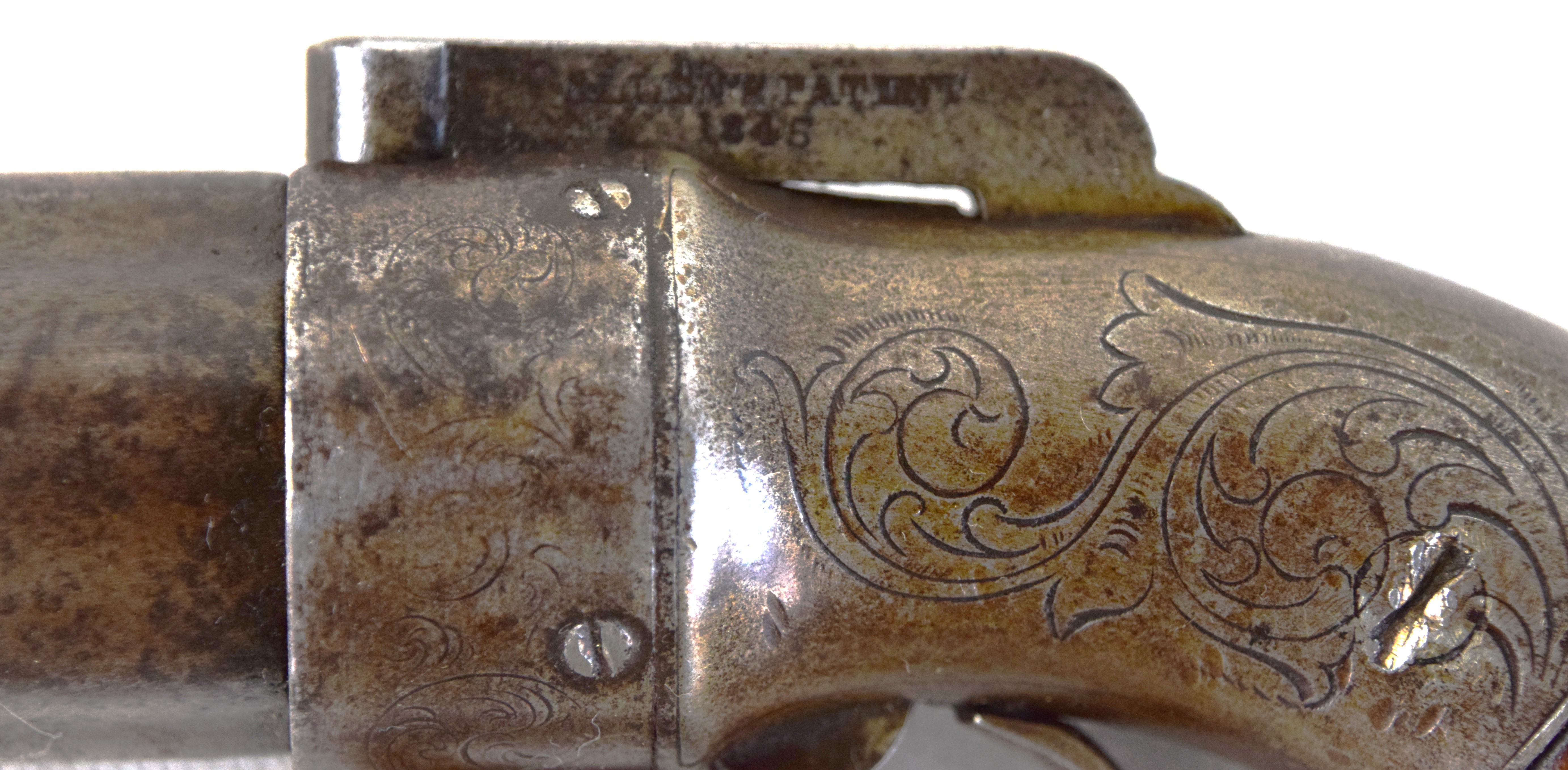 Allen 6 shot pepperbox percussion, medium size, type 1845 with bar hammer, nipple shield, flat barrel ribs. Marked “ALLEN’S PATENT 1845″ on hammer, floral designs and wood grip, 3.25” barrel.